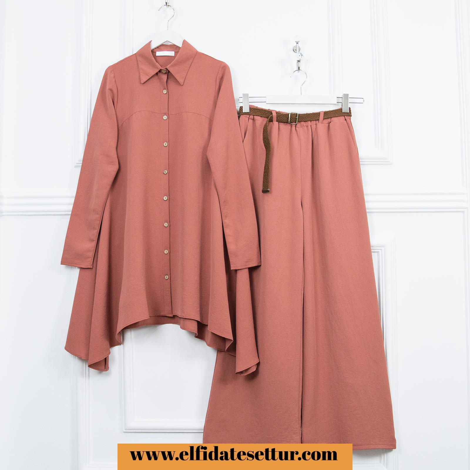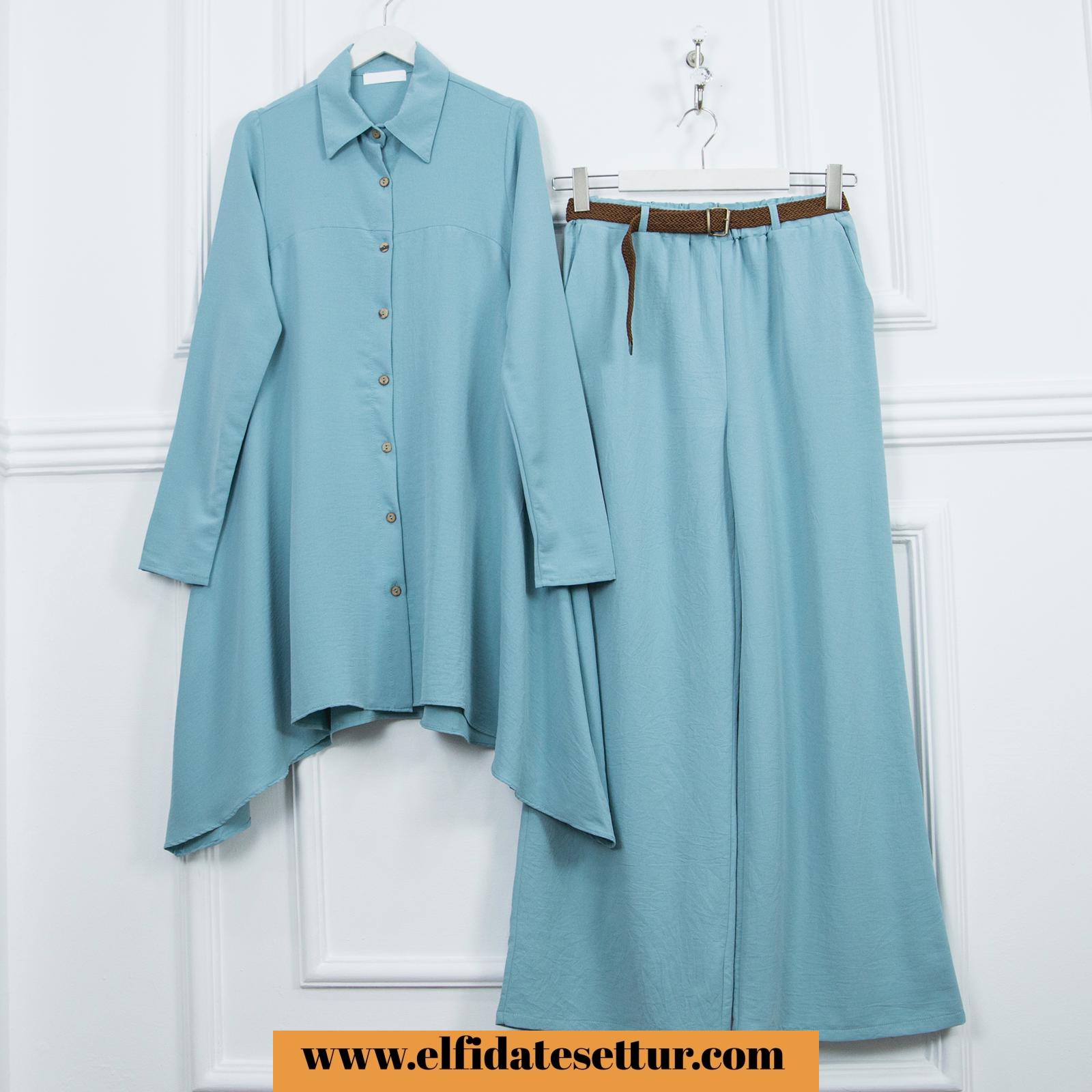 Yazlıktır-İkili takımdır-Pantolon ceplidir. Pantolonun Bel kısmı lastiklidir-Pantolon Bol paçadır-Tunik; ön kısmı düğmelidir ve mevlana kesimdir