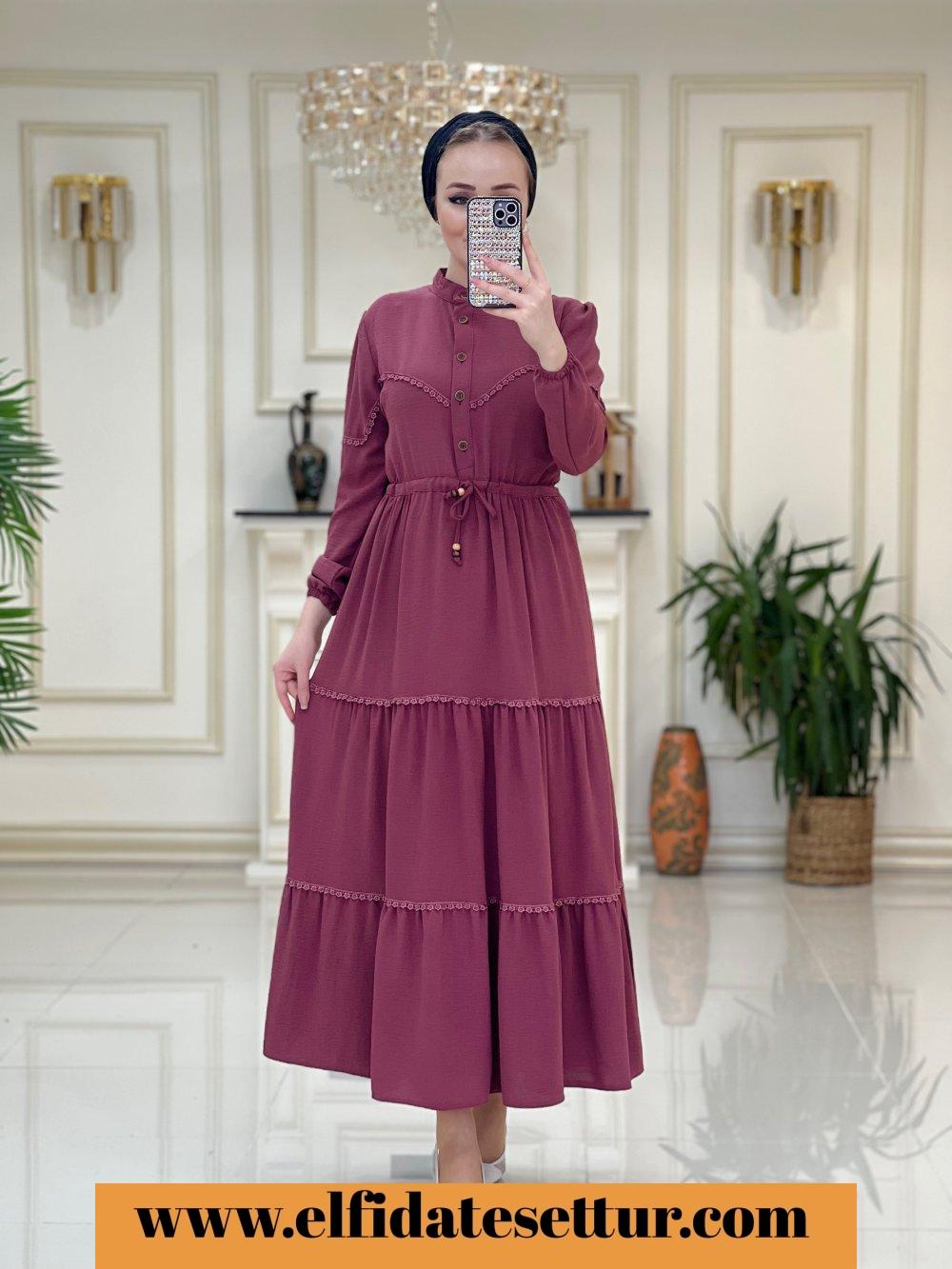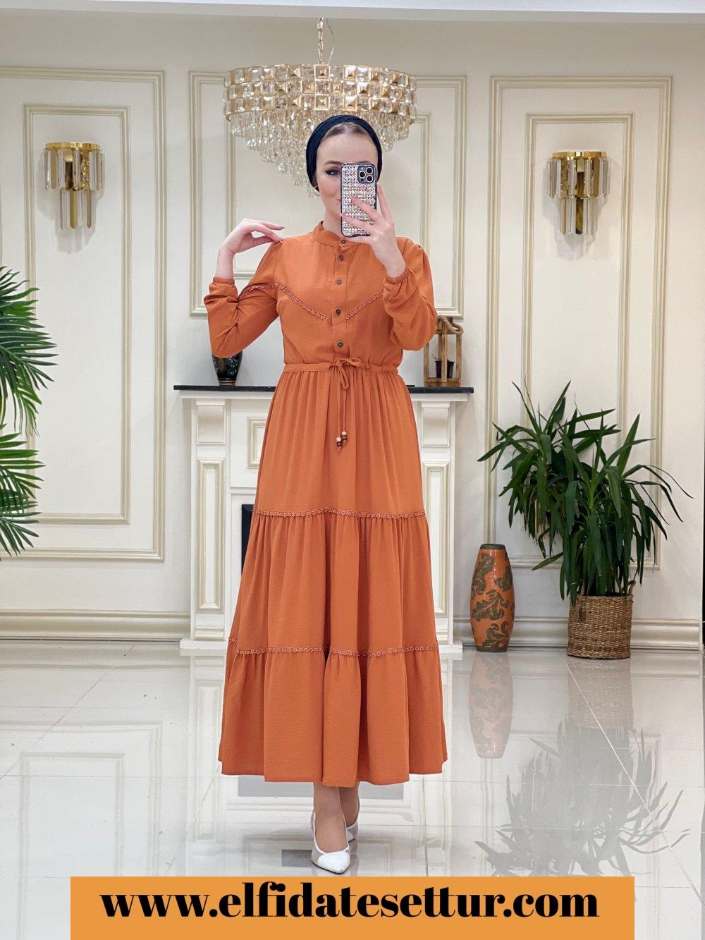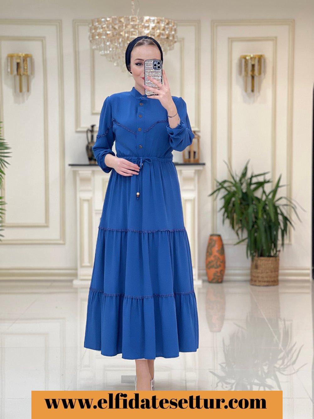 1. Sınıf Ayrobin Kumaştır. 40 Beden Ölçüsü: Elbise boy: 137 cm Göğüs: 104 cm Omuz: 42 cm Elbise bel kısmına kadar düğme detaylıdır. Elbise belden sıkma detaylıdır. Elbise rahat kalıptır.