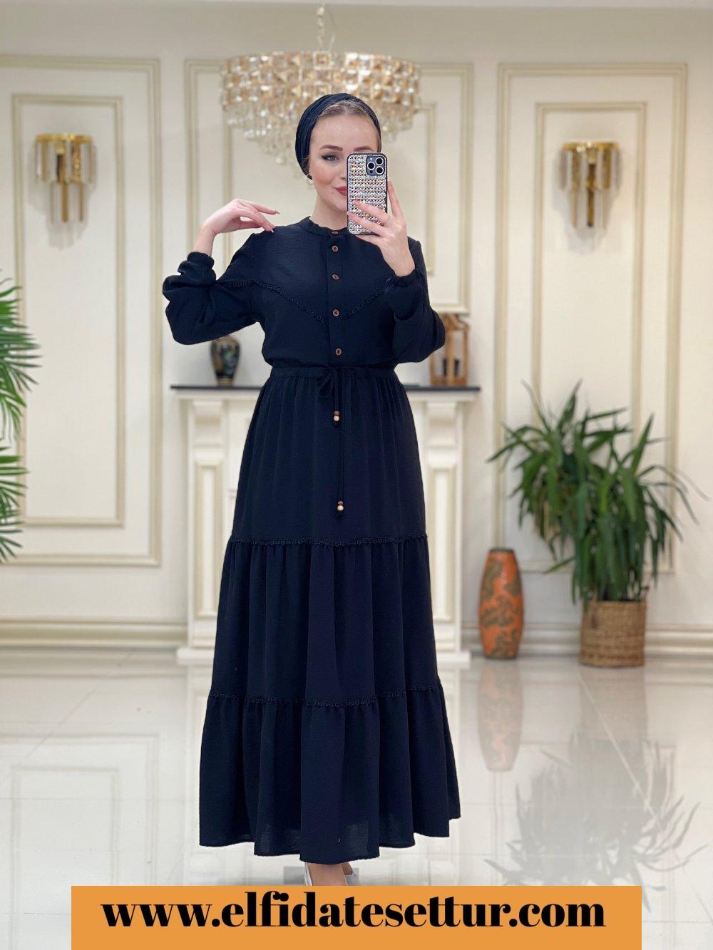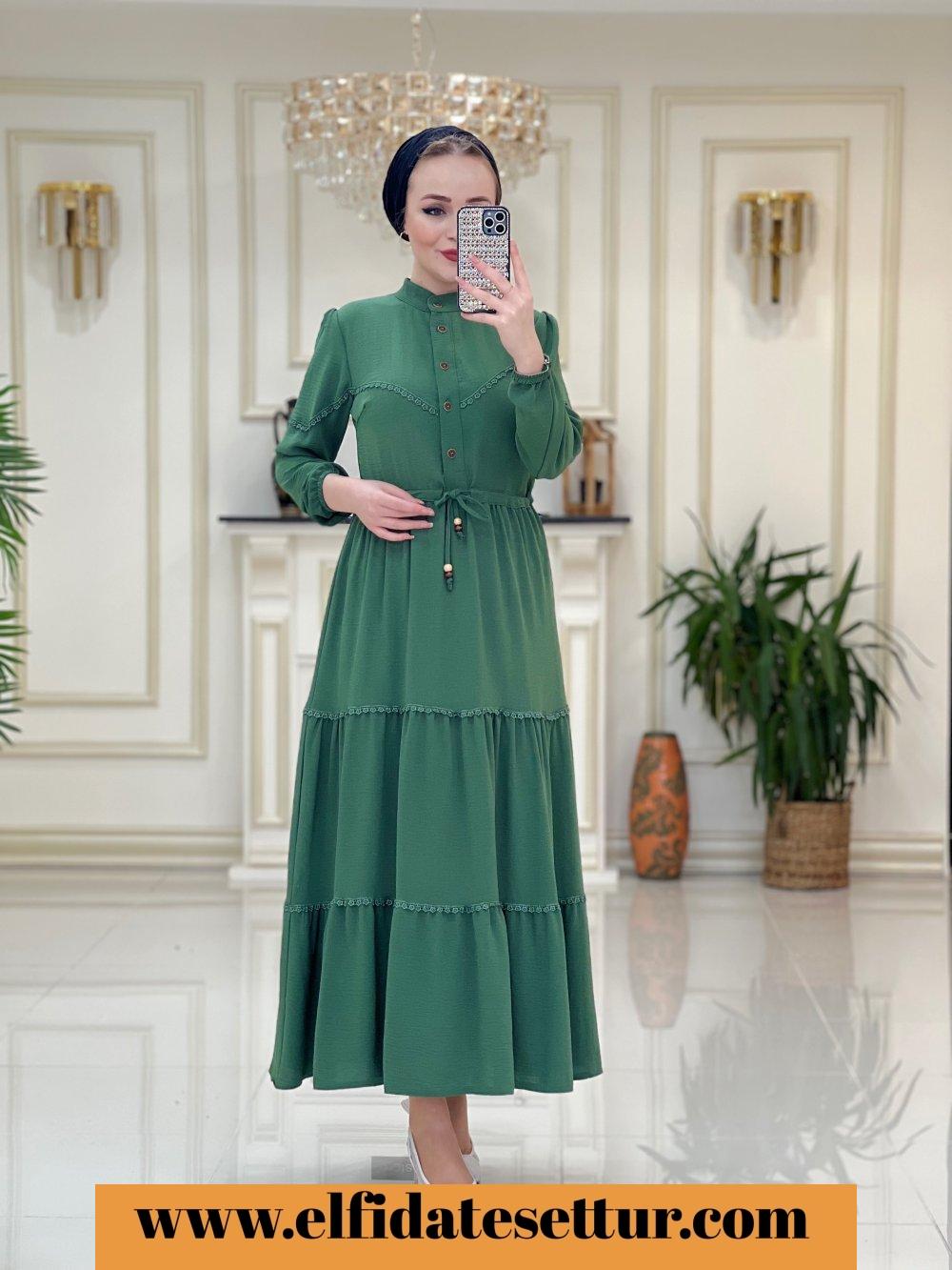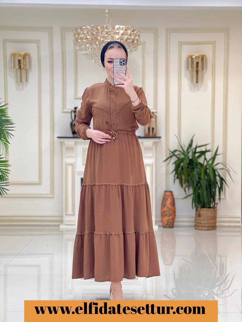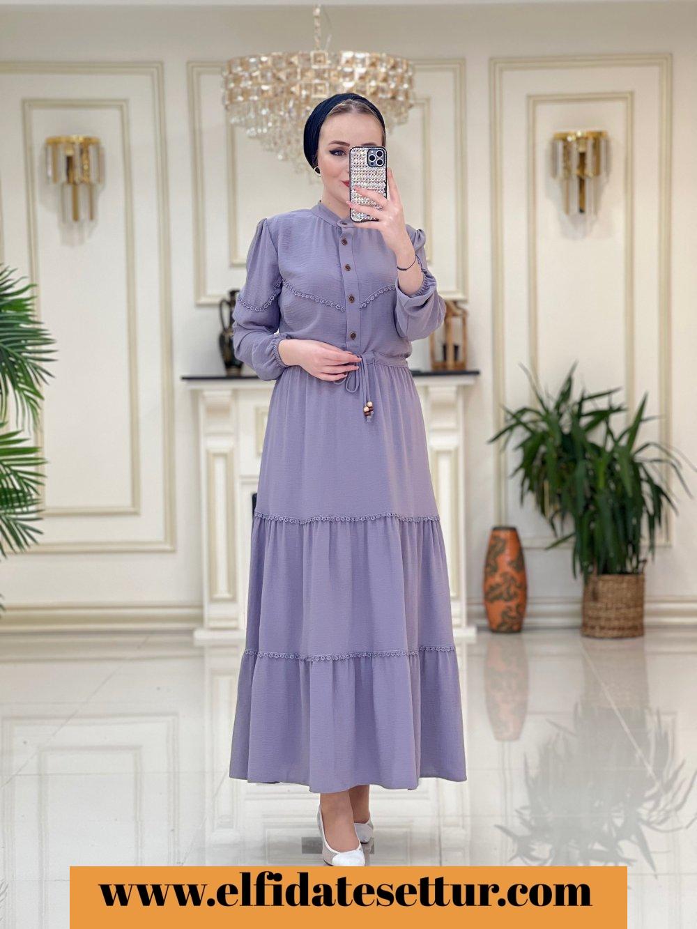 1. Sınıf Ayrobin Kumaştır. 40 Beden Ölçüsü: Elbise boy: 137 cm Göğüs: 104 cm Omuz: 42 cm Elbise bel kısmına kadar düğme detaylıdır. Elbise belden sıkma detaylıdır. Elbise rahat kalıptır.