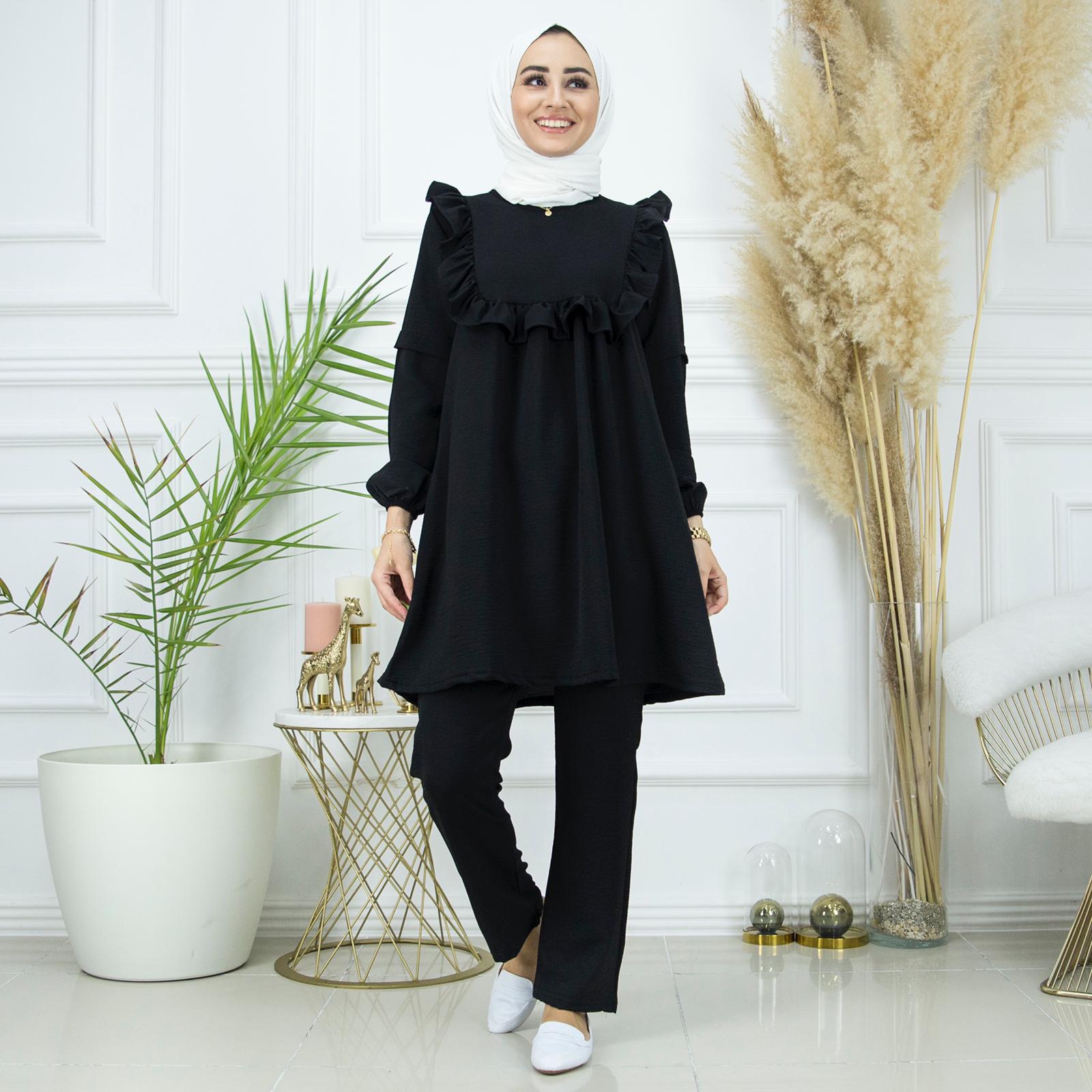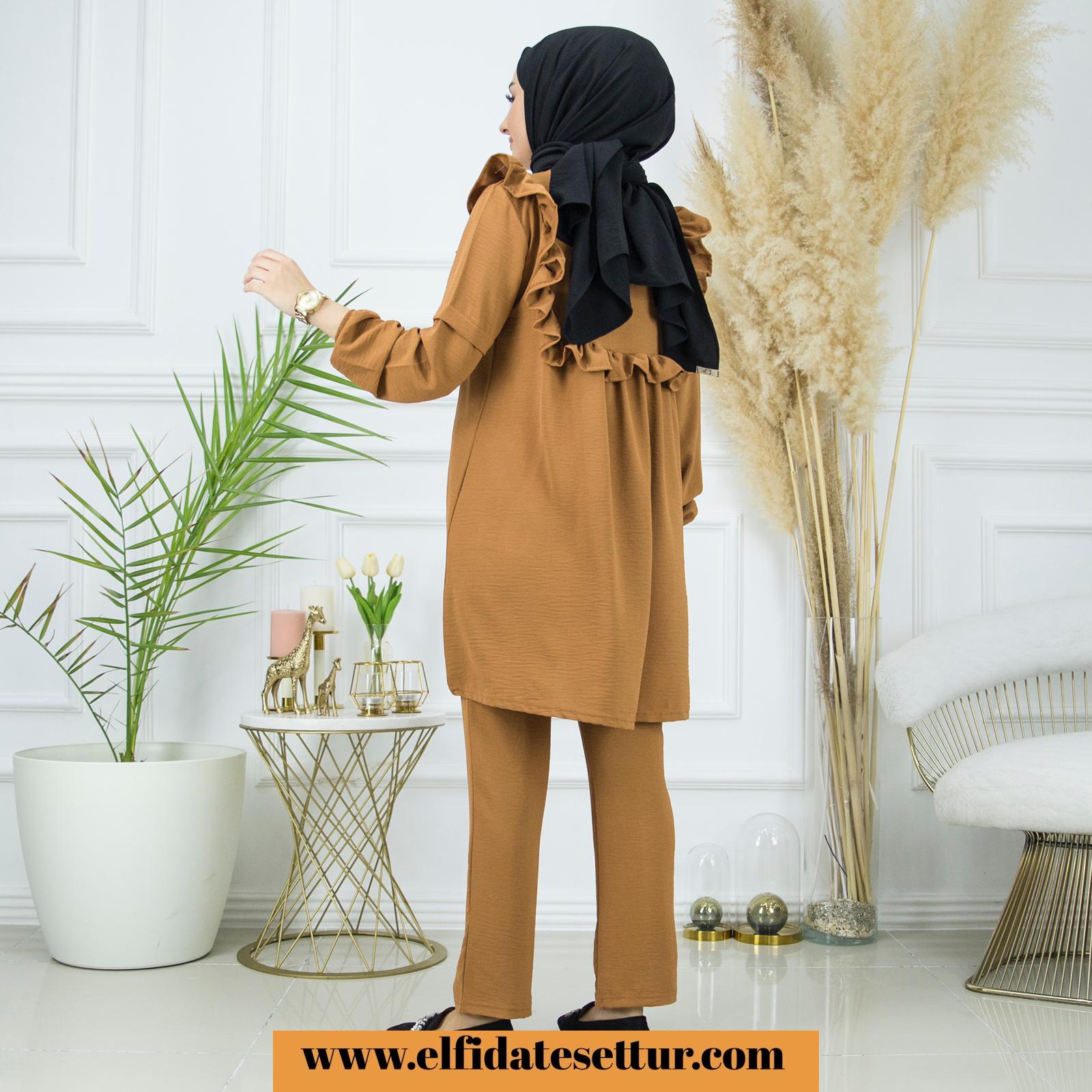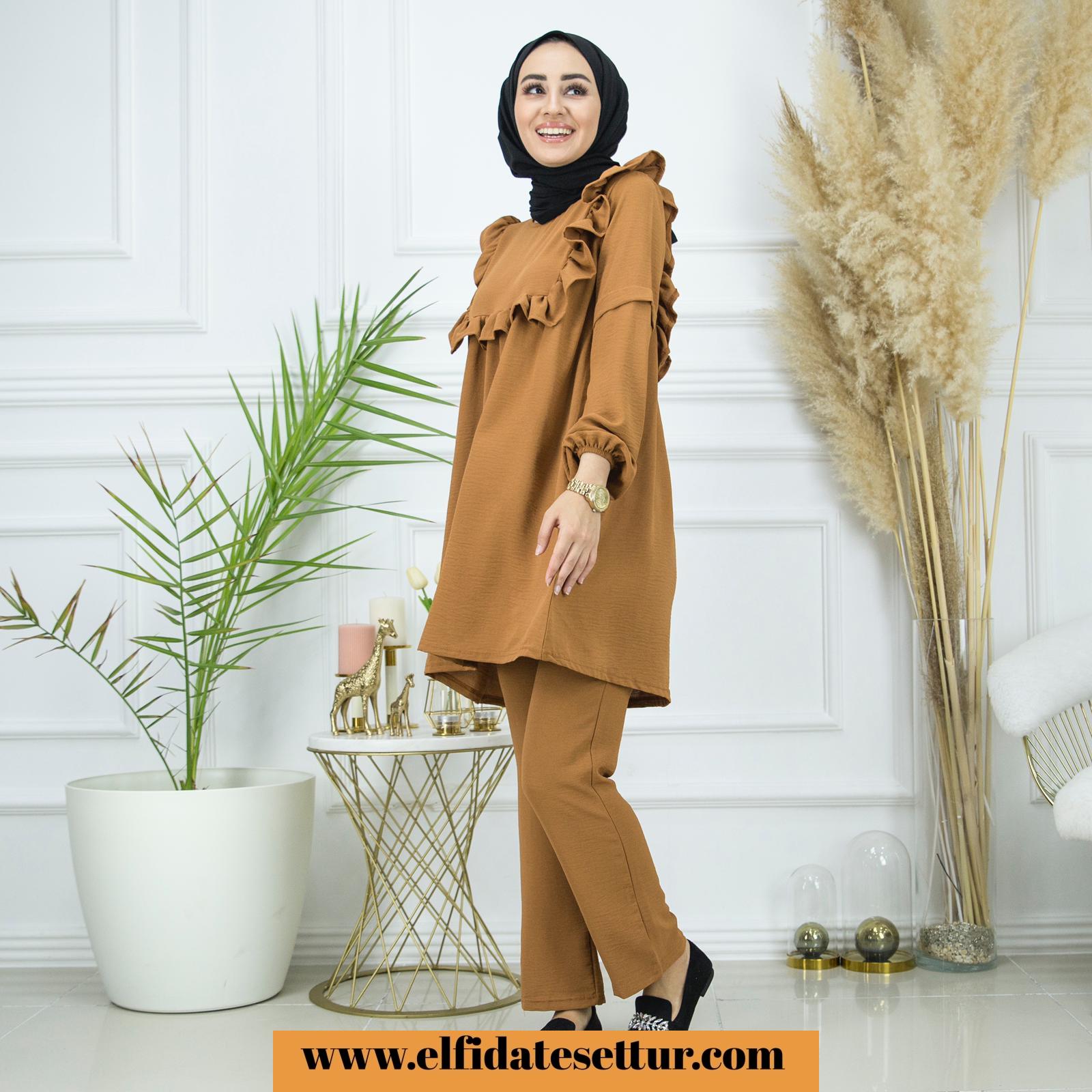 Yazlıktır-İkili takımdır-Bilek kısmı lastiklidir- Ön ve arka kısmı fırfır detaylıdır-Pantolon un bel kısmı lastiklidir
