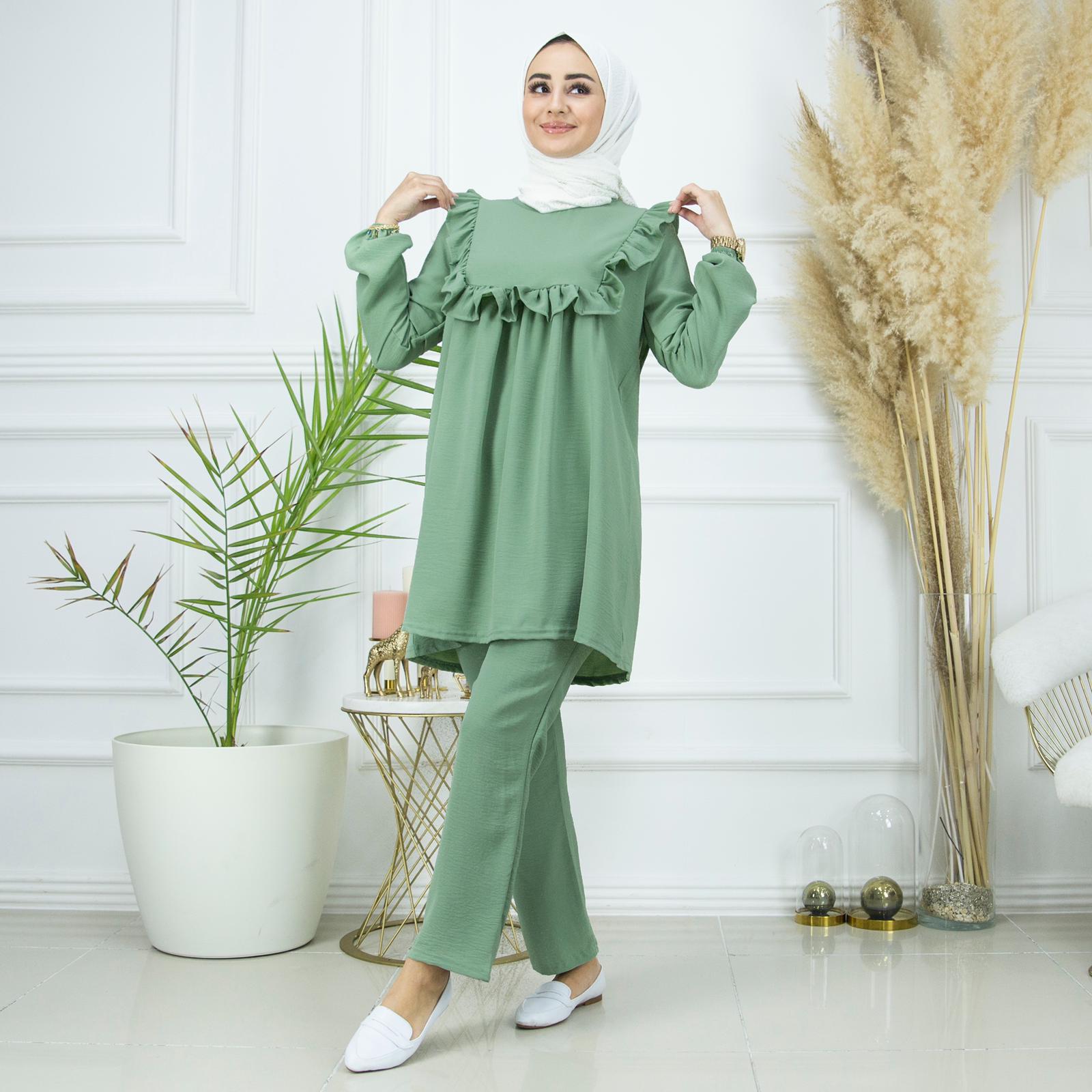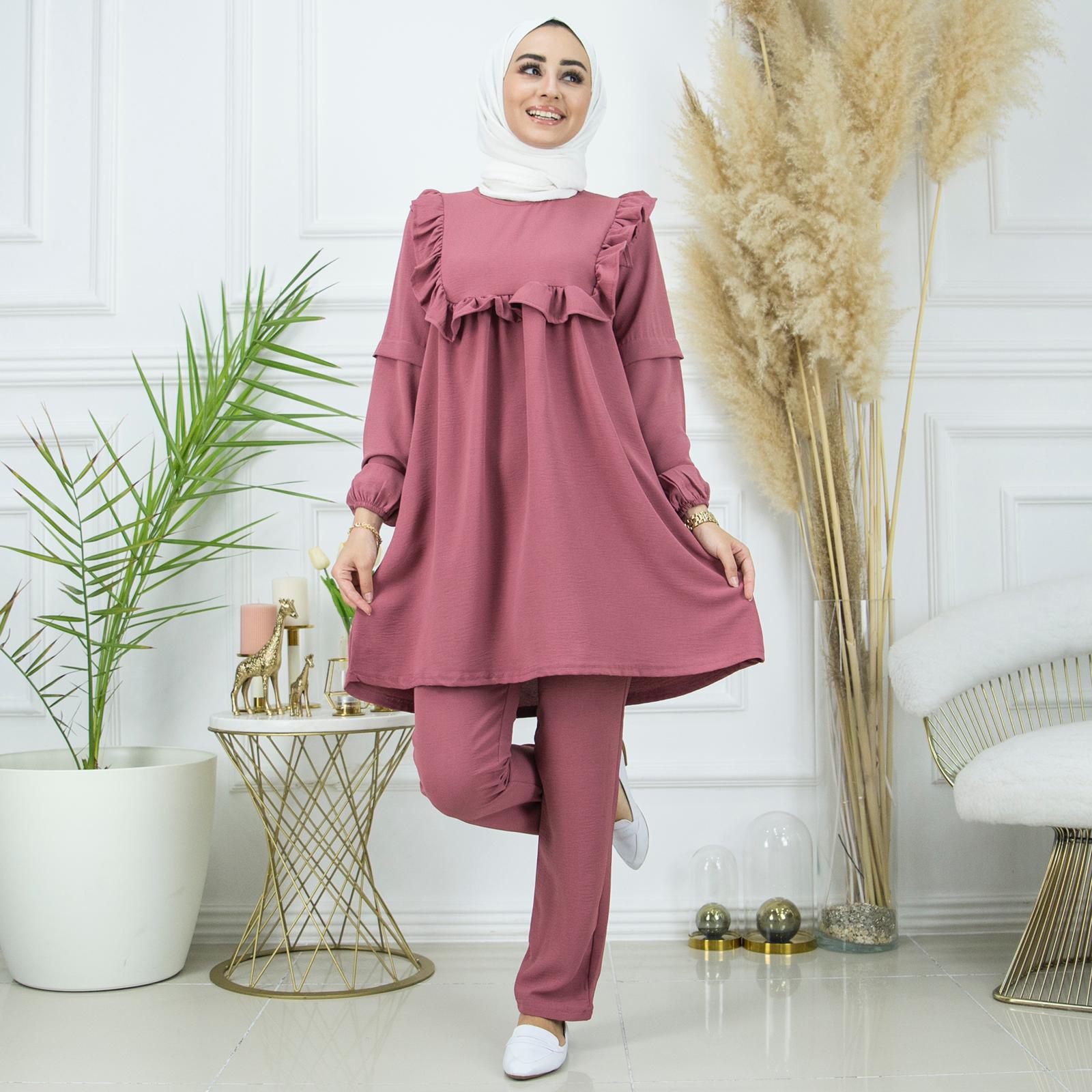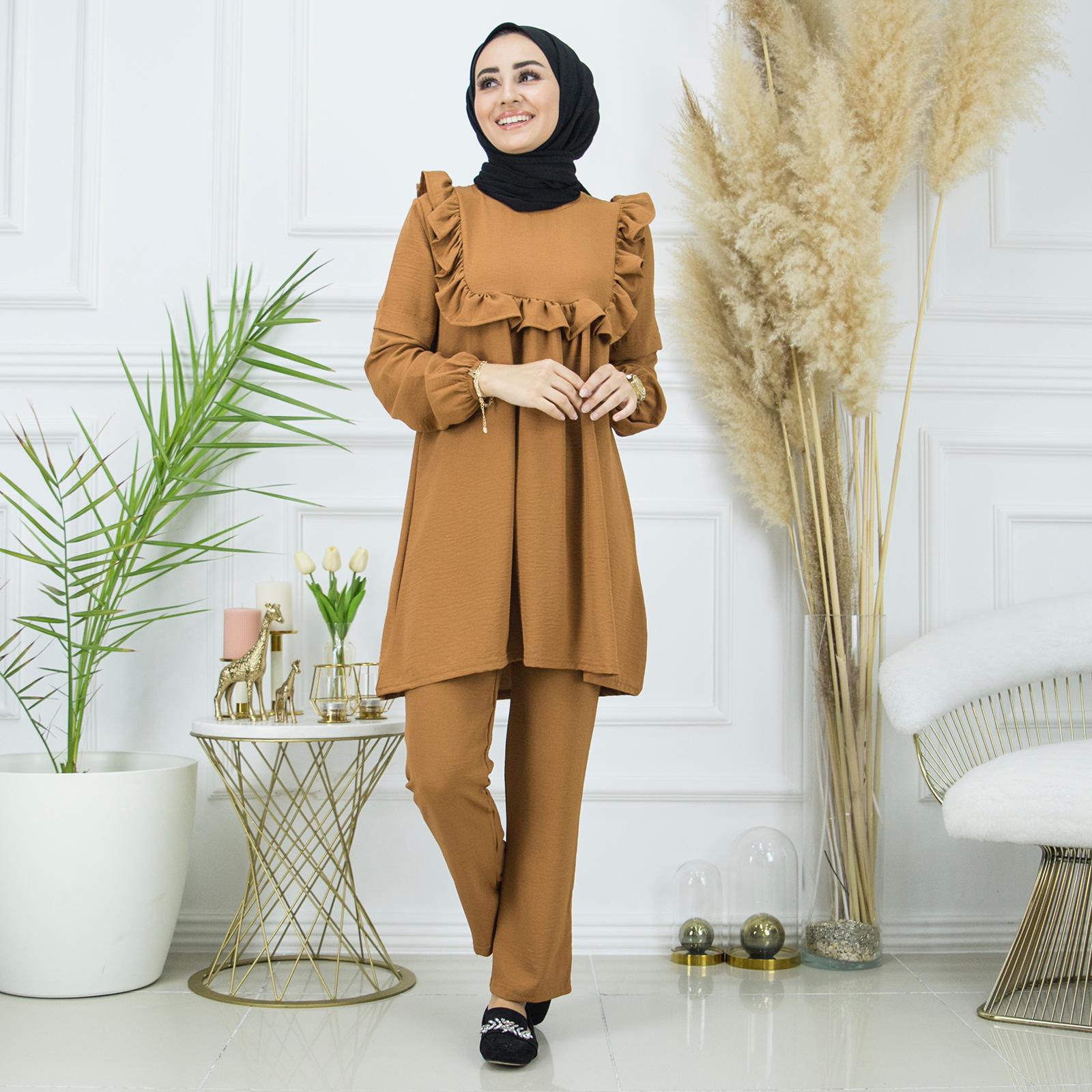 Yazlıktır-İkili takımdır-Bilek kısmı lastiklidir- Ön ve arka kısmı fırfır detaylıdır-Pantolon un bel kısmı lastiklidir