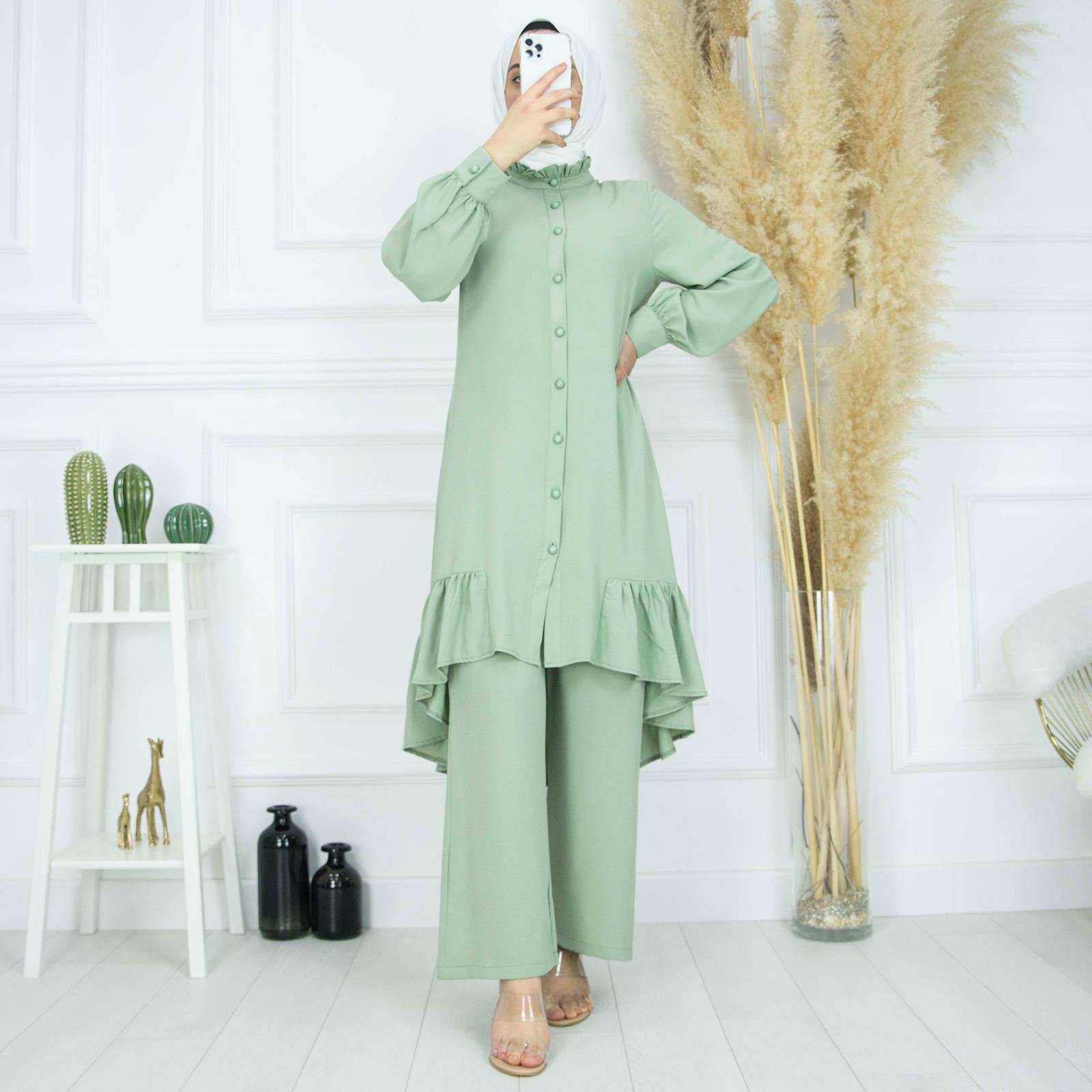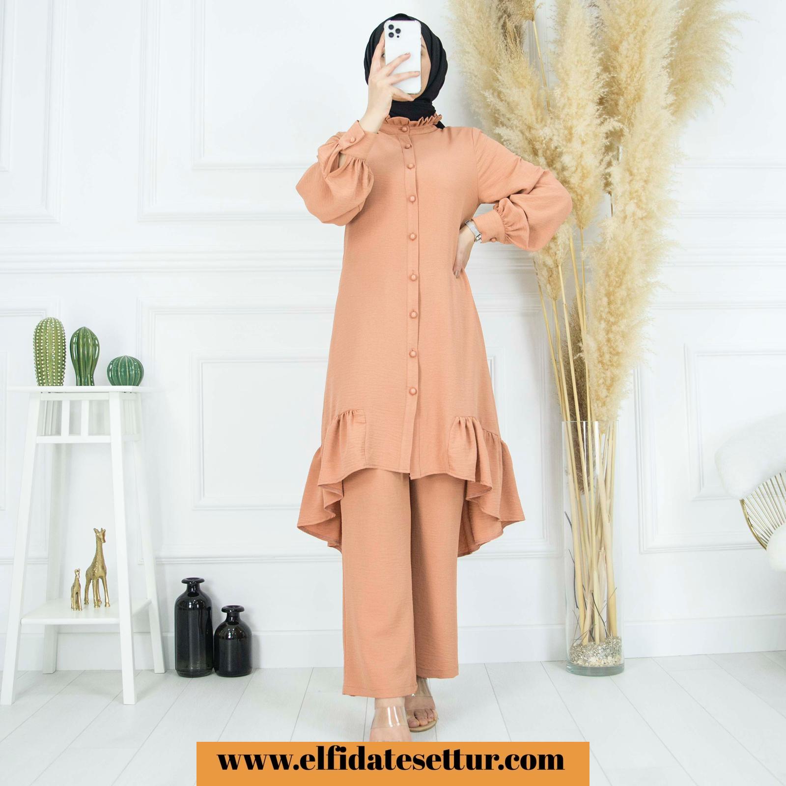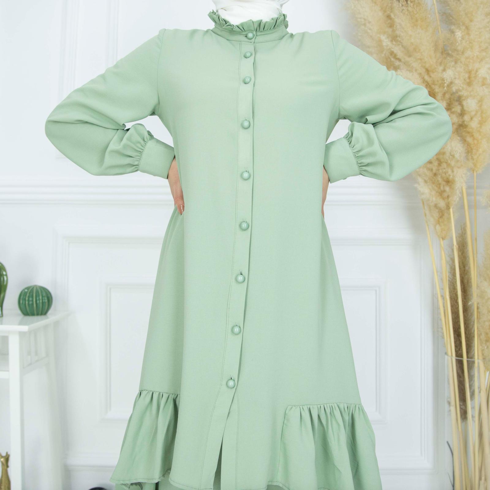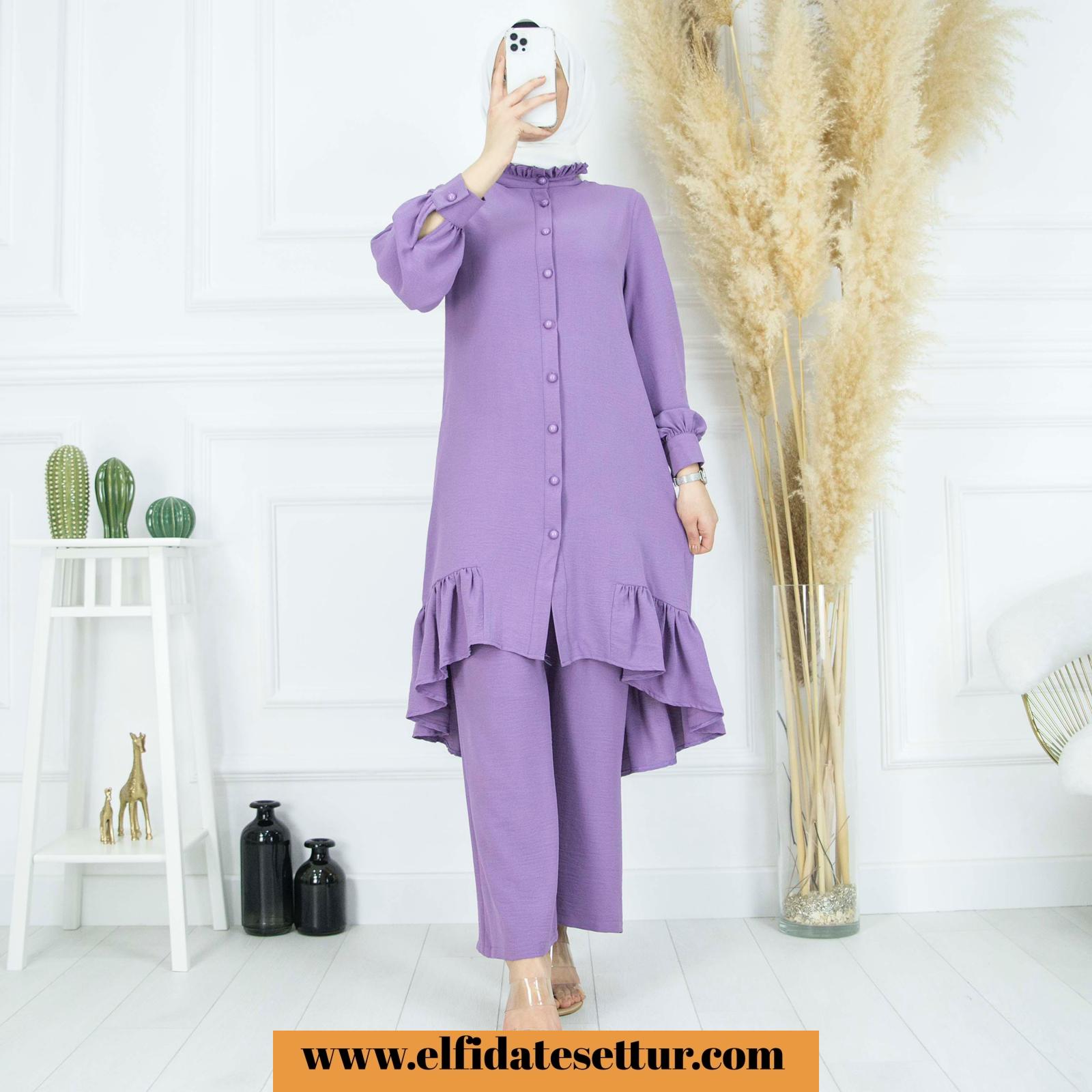 Ön kısmı düğmelidir-Bilek kısmı manşetli düğmelidir-Yakası ve etek ucu fırfırlıdır-pantolon beli lastiklidir