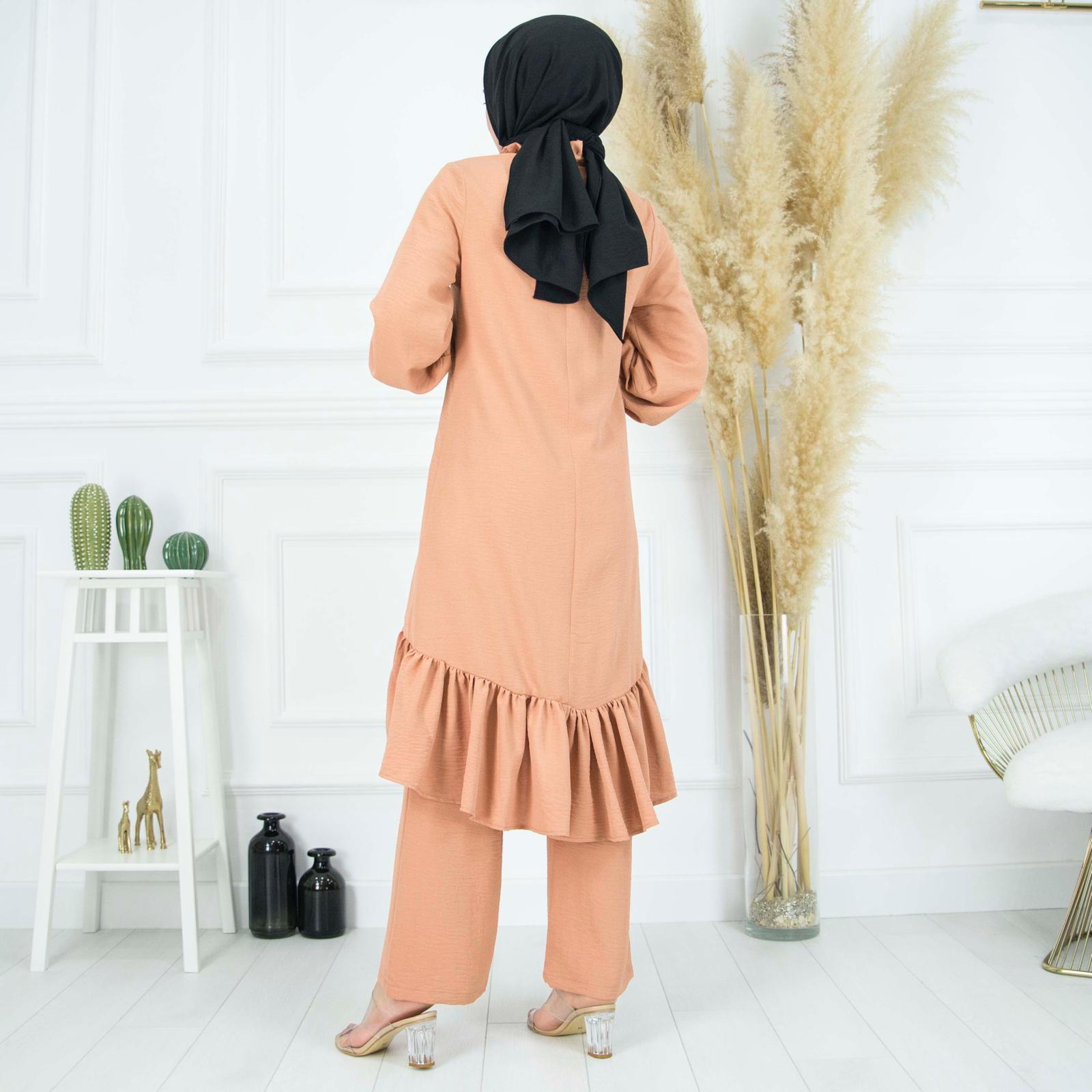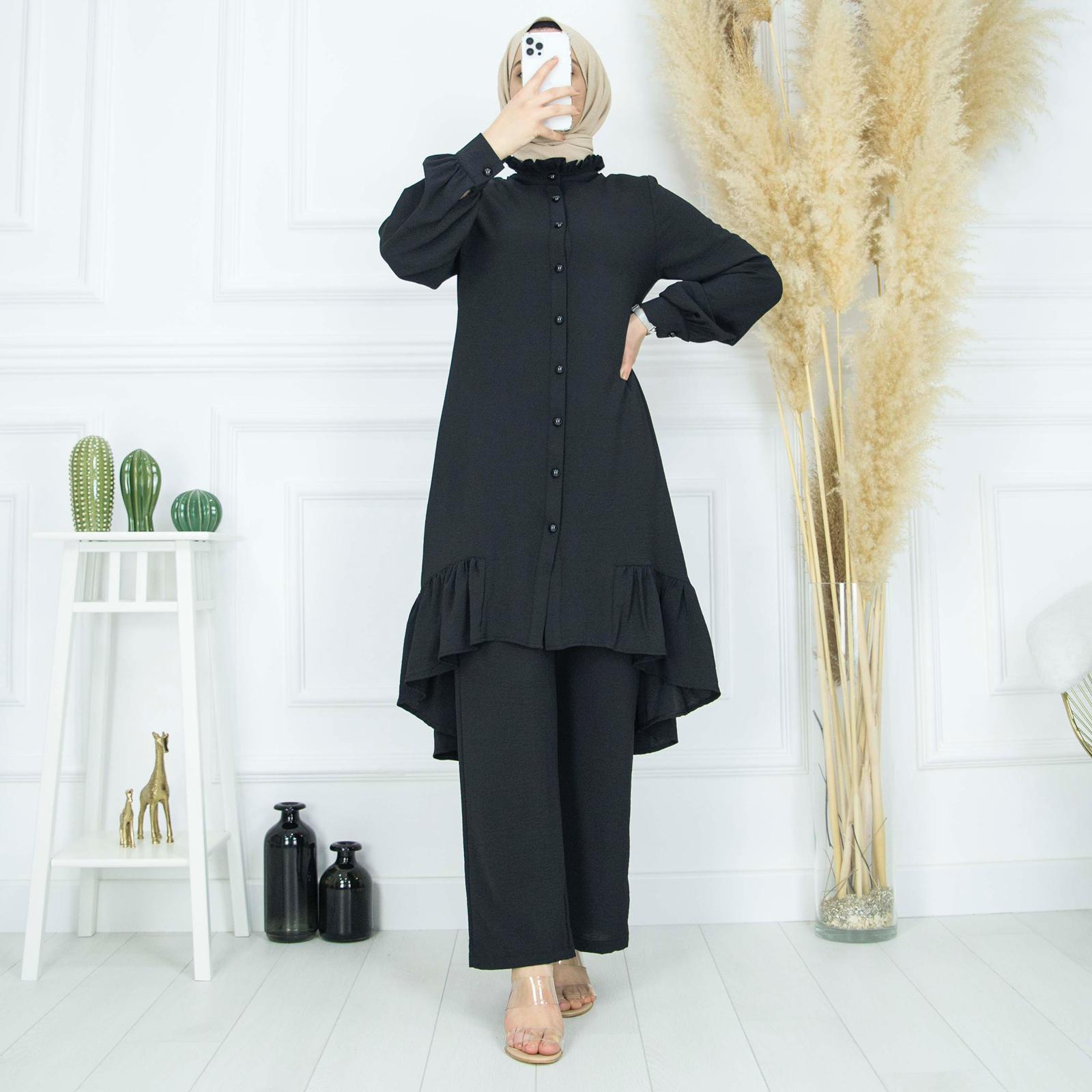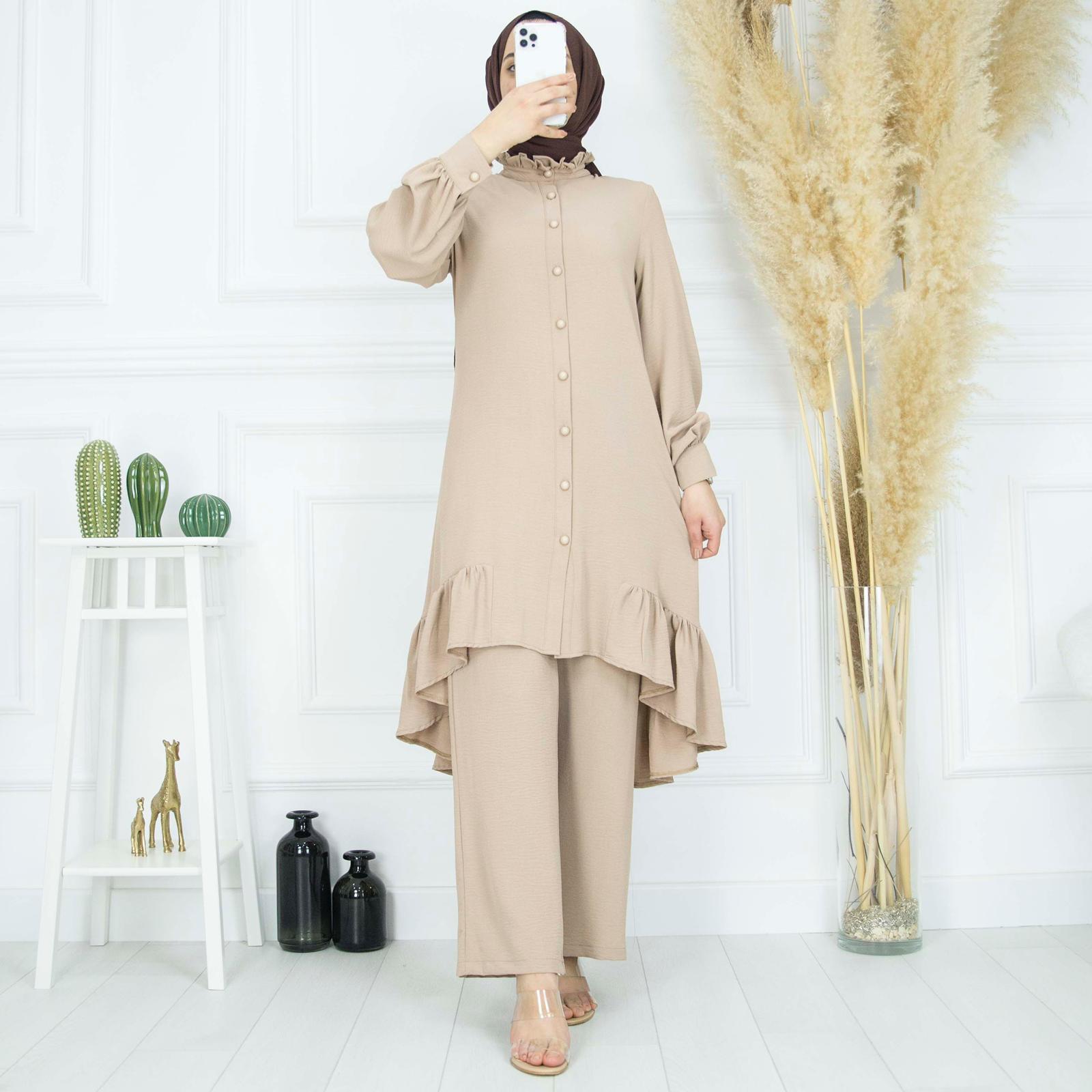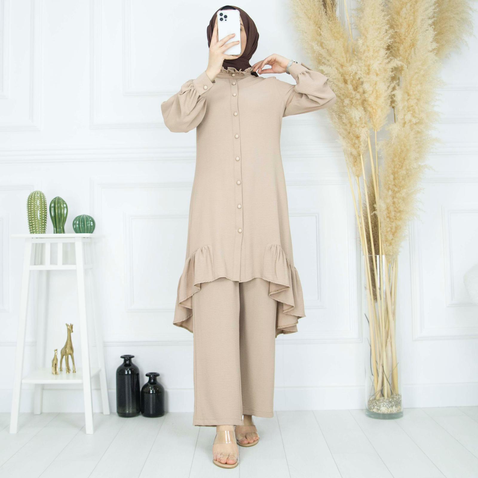 Ön kısmı düğmelidir-Bilek kısmı manşetli düğmelidir-Yakası ve etek ucu fırfırlıdır-pantolon beli lastiklidir