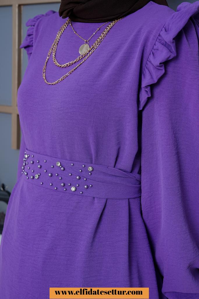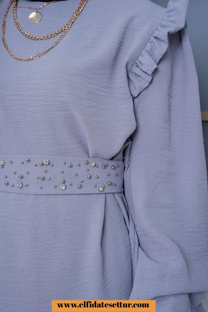 Ürün içeriği Belinden kuşaklı v yaka Tunik pantolon takım