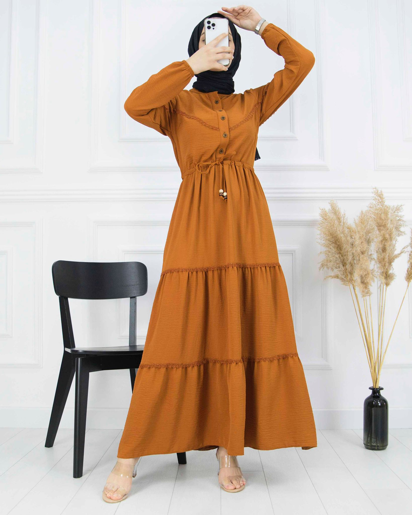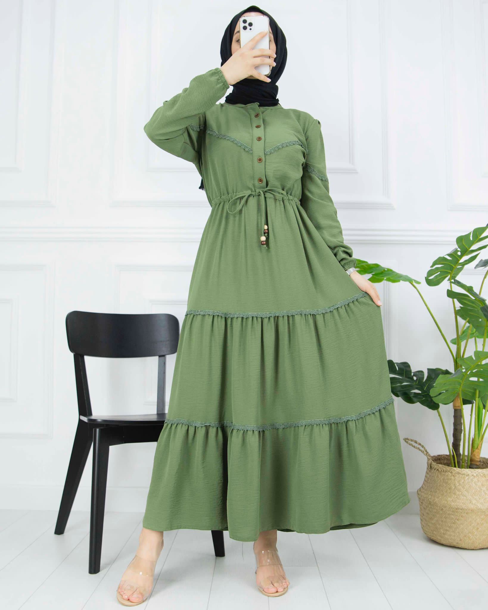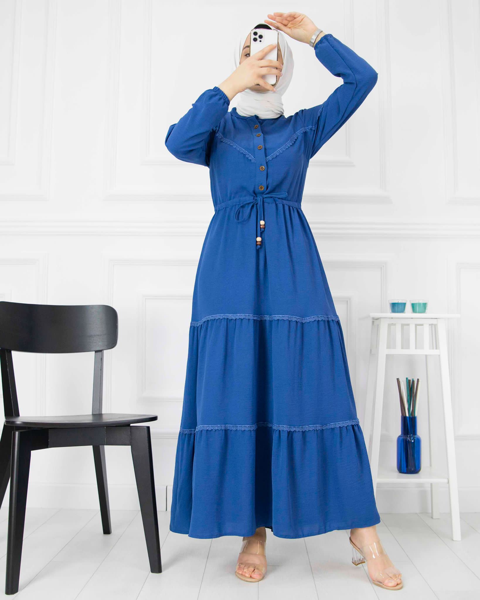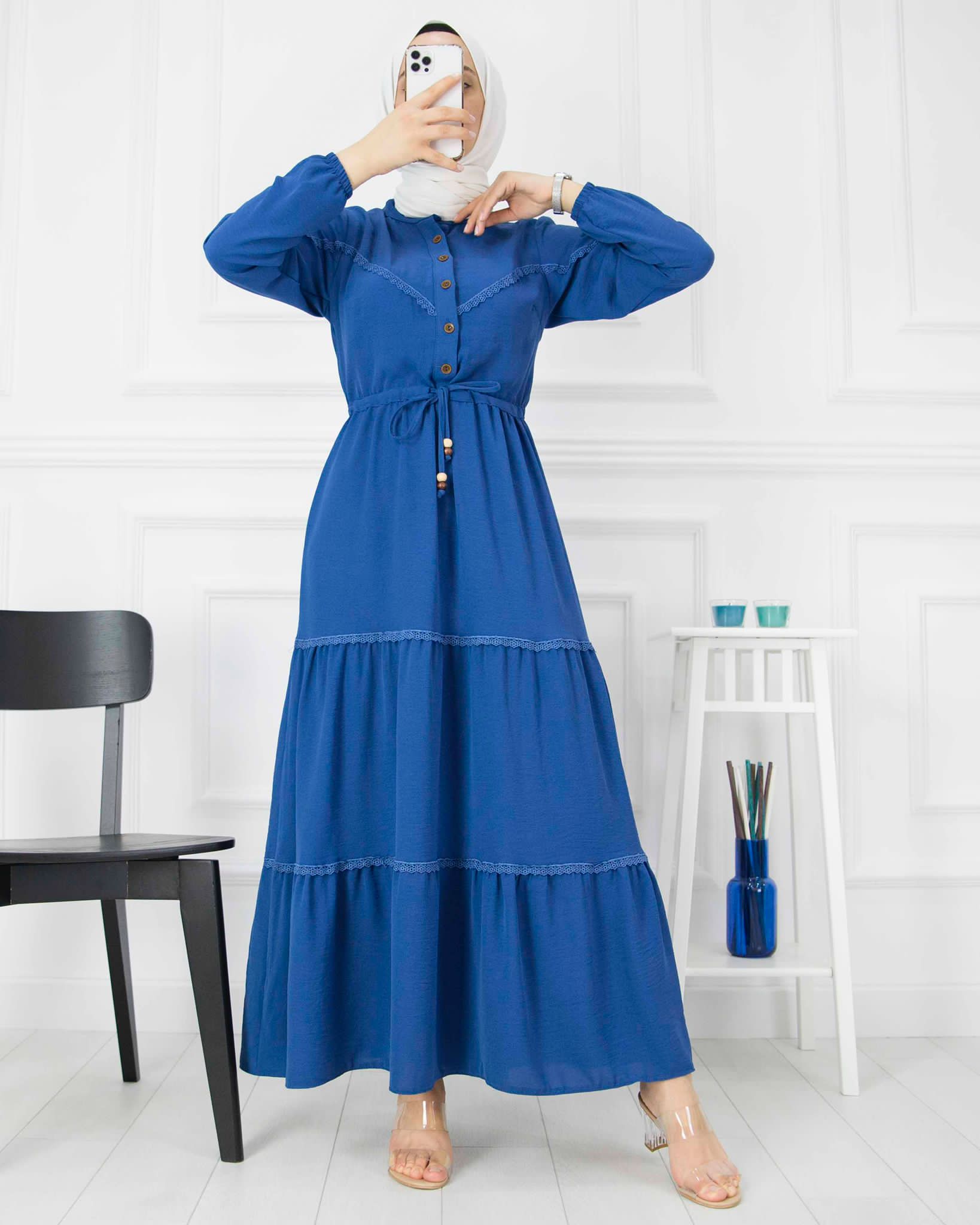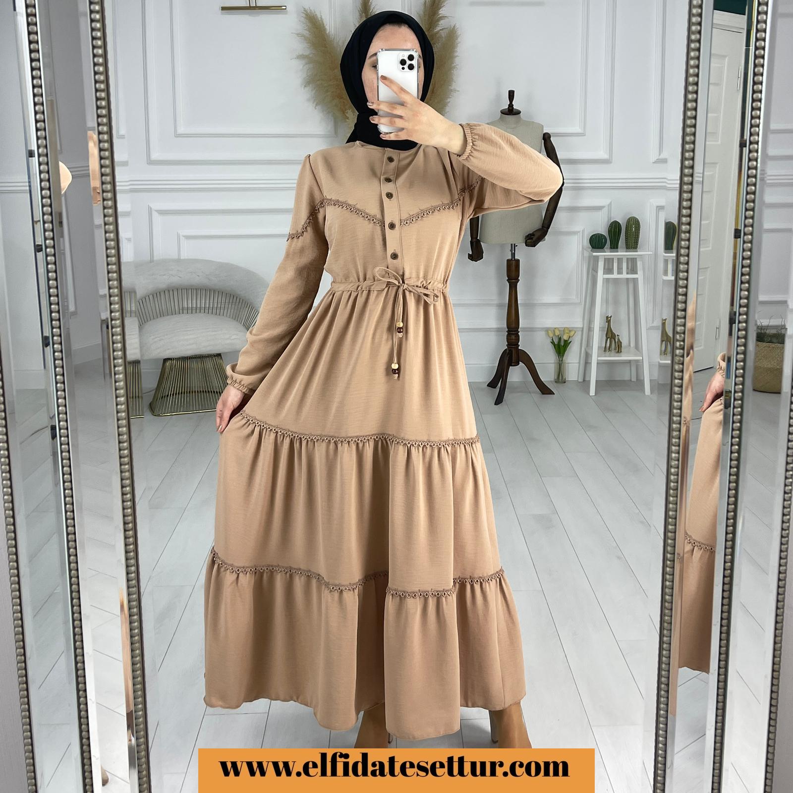 Ön kısmı beline kadar düğmelidir-Bel kısmında sıkıştırılabilen tünelli bağcık vardır-Bilek kısmı lastiklidir-Etek kısmı kat kat büzgülüdür üzeri güpür detaylıdır