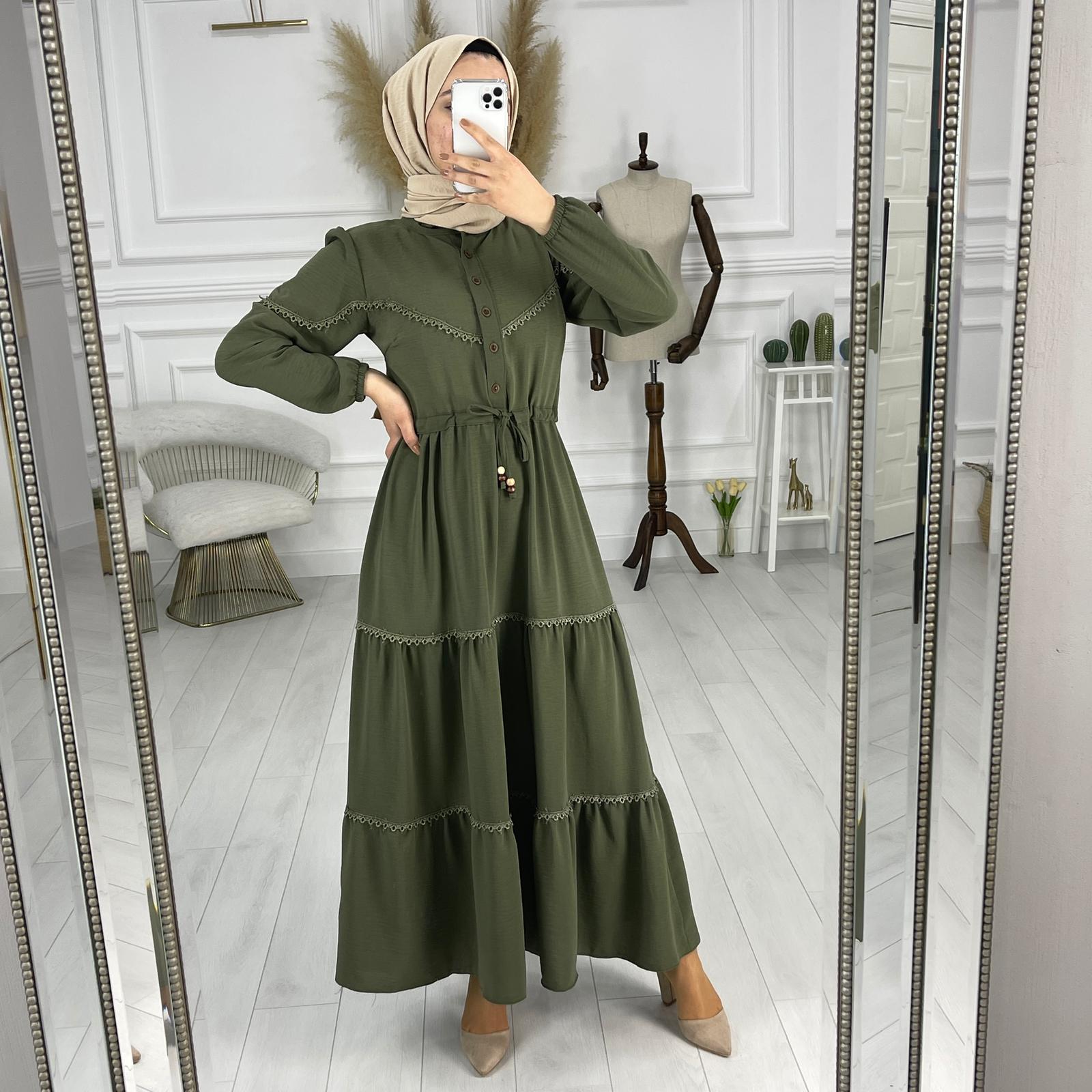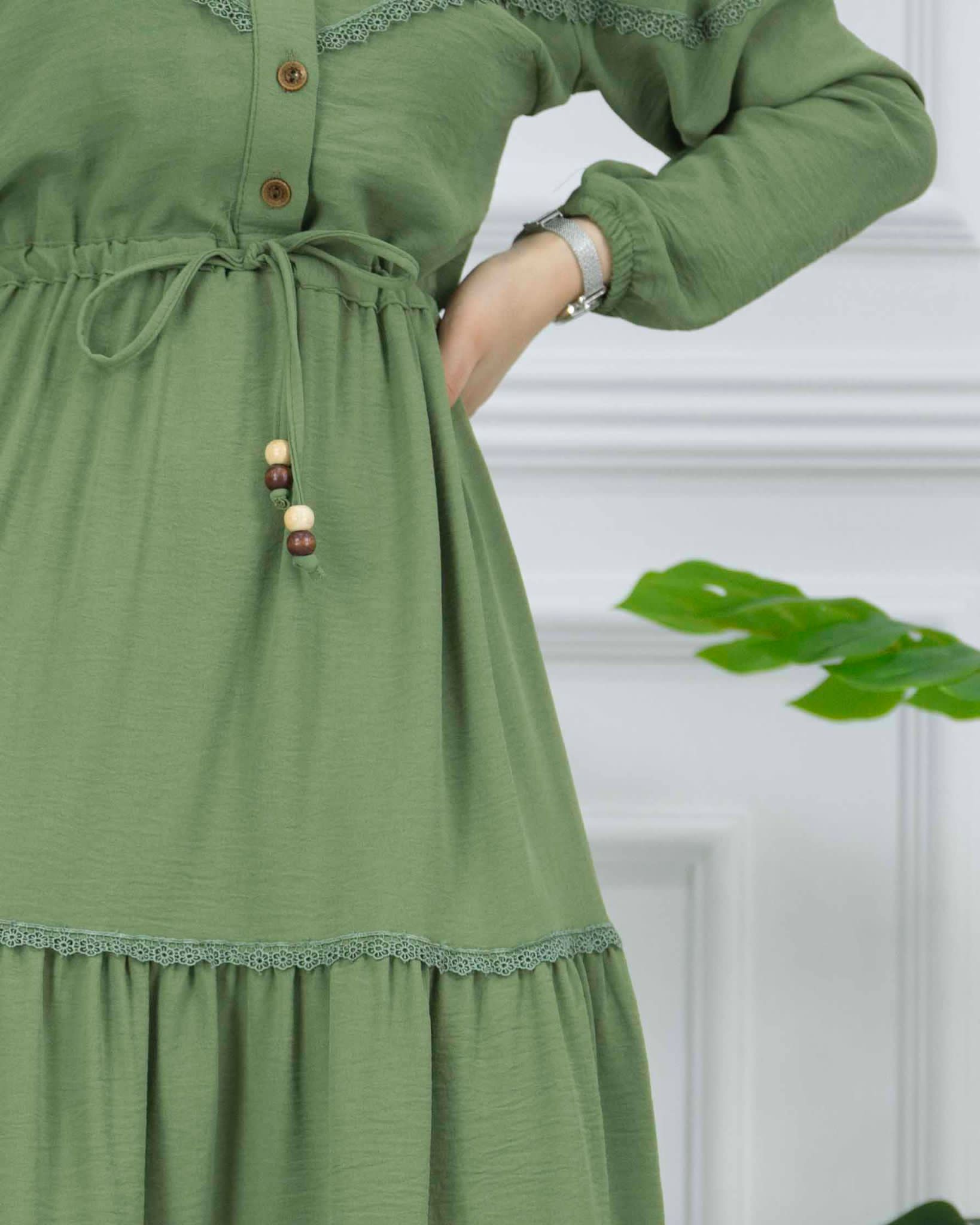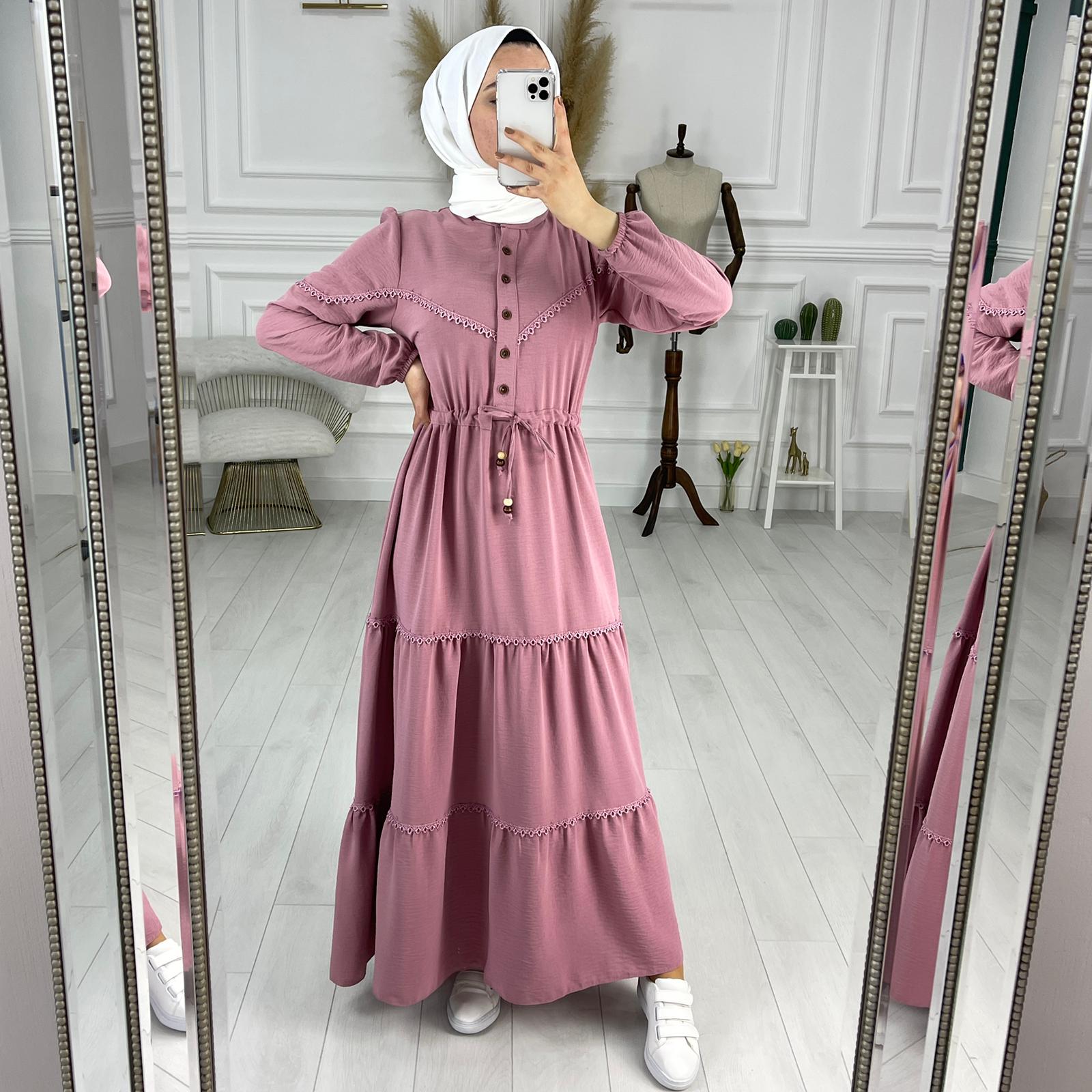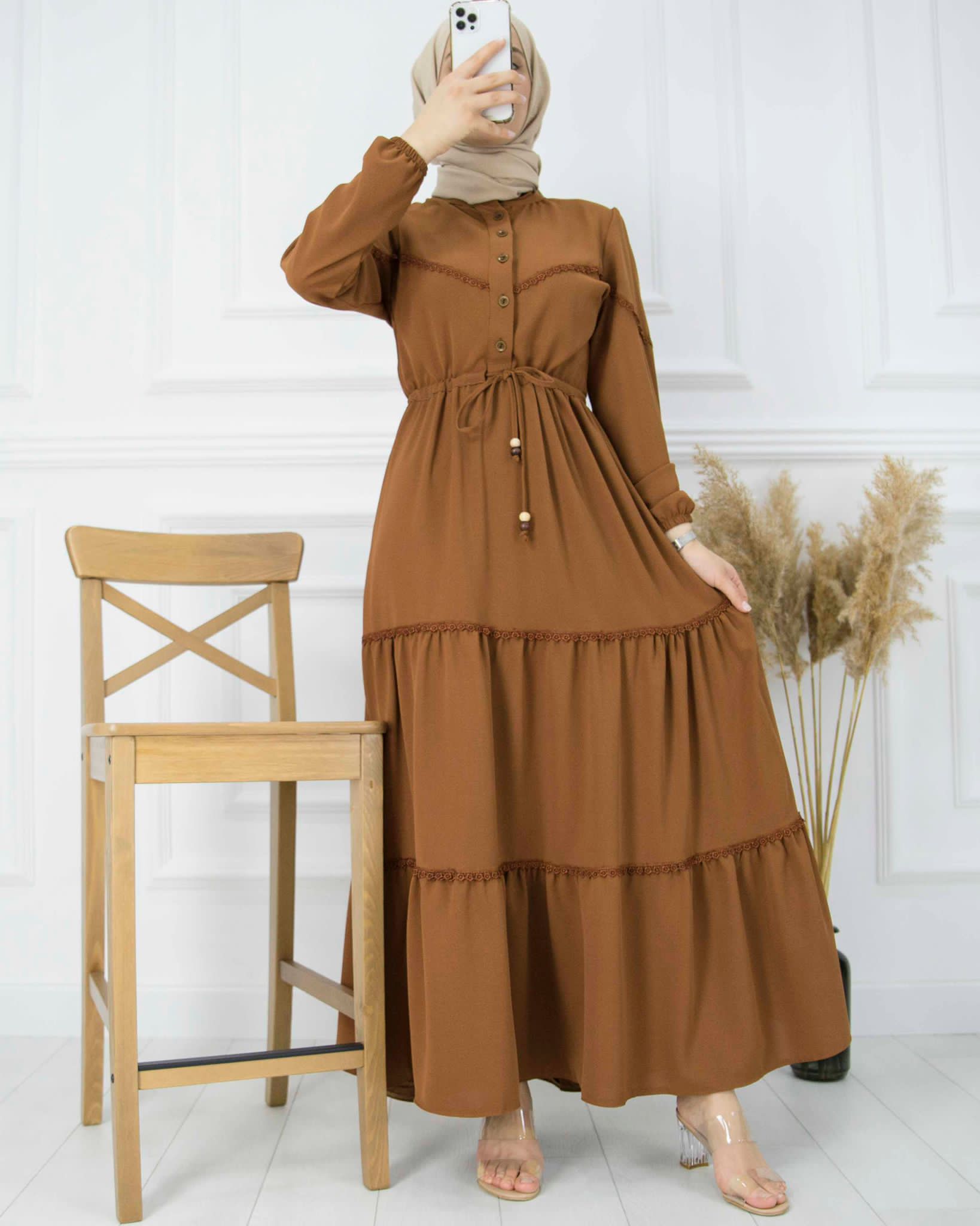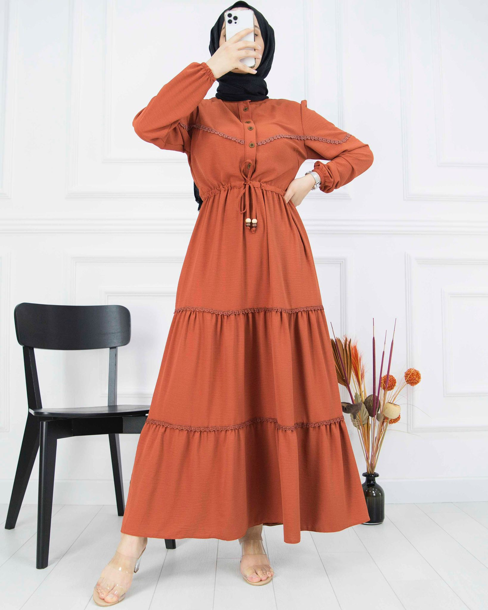 Ön kısmı beline kadar düğmelidir-Bel kısmında sıkıştırılabilen tünelli bağcık vardır-Bilek kısmı lastiklidir-Etek kısmı kat kat büzgülüdür üzeri güpür detaylıdır