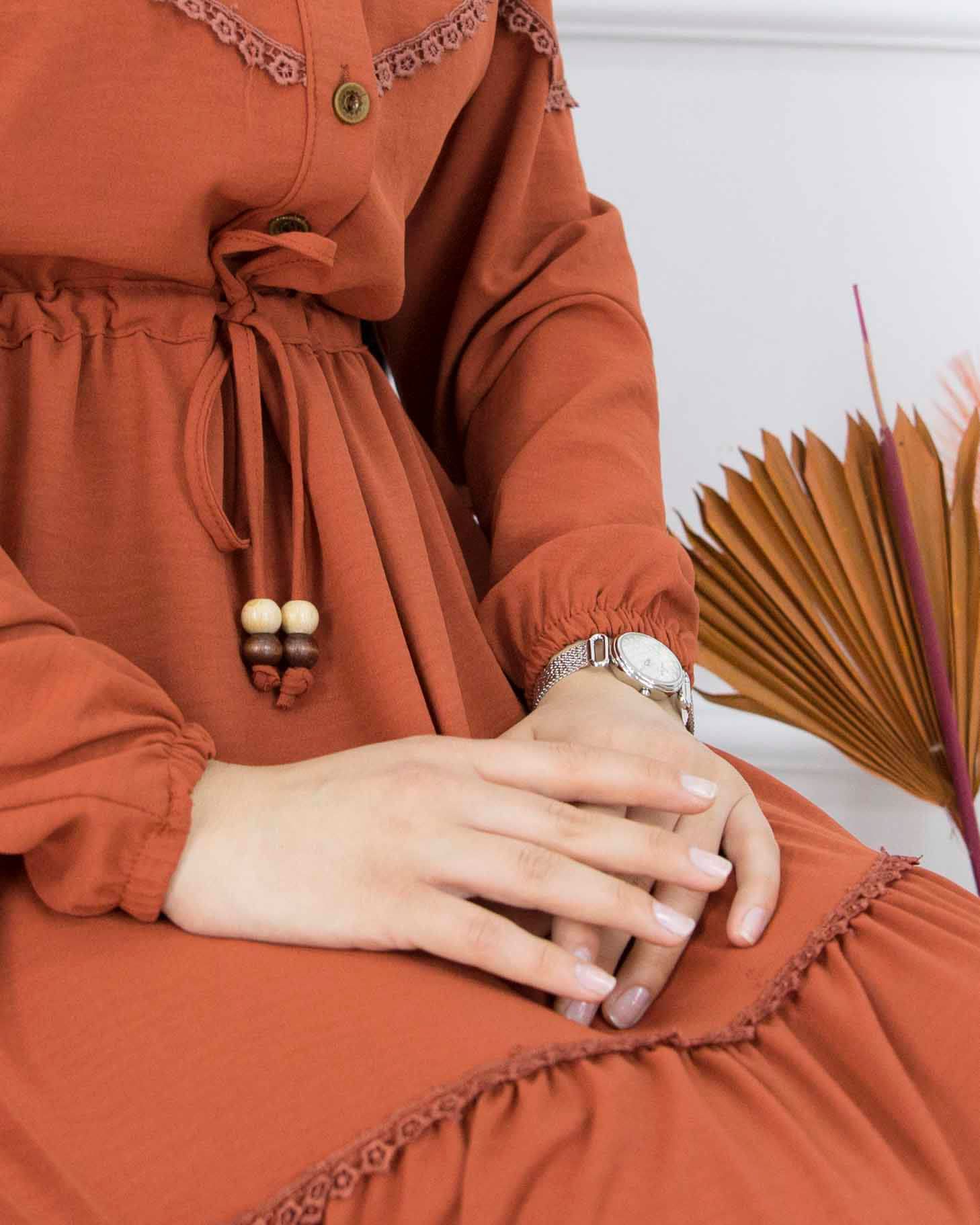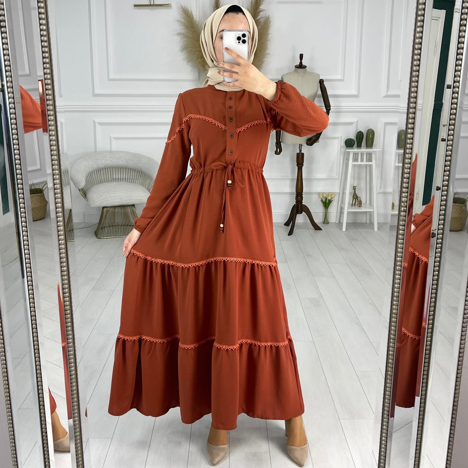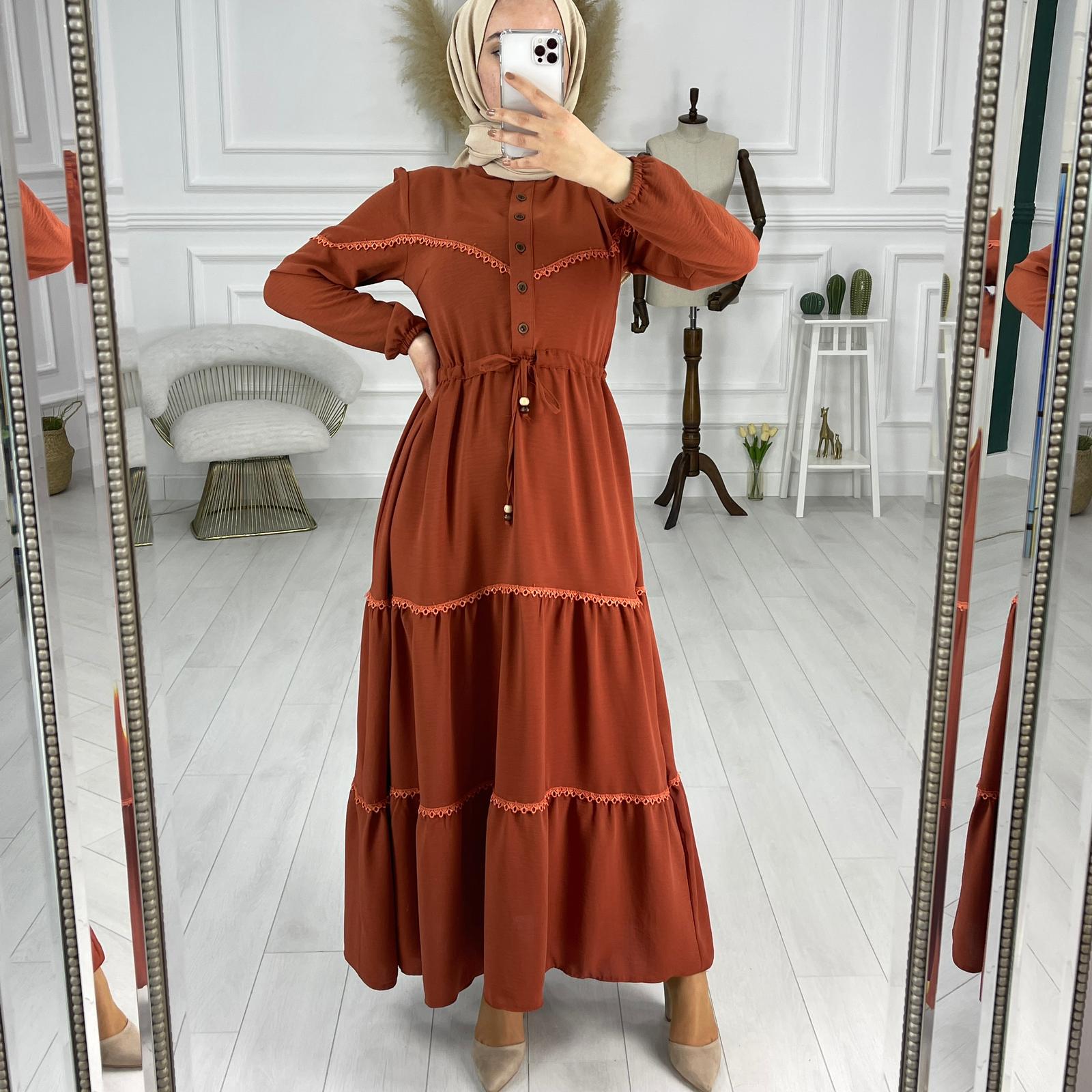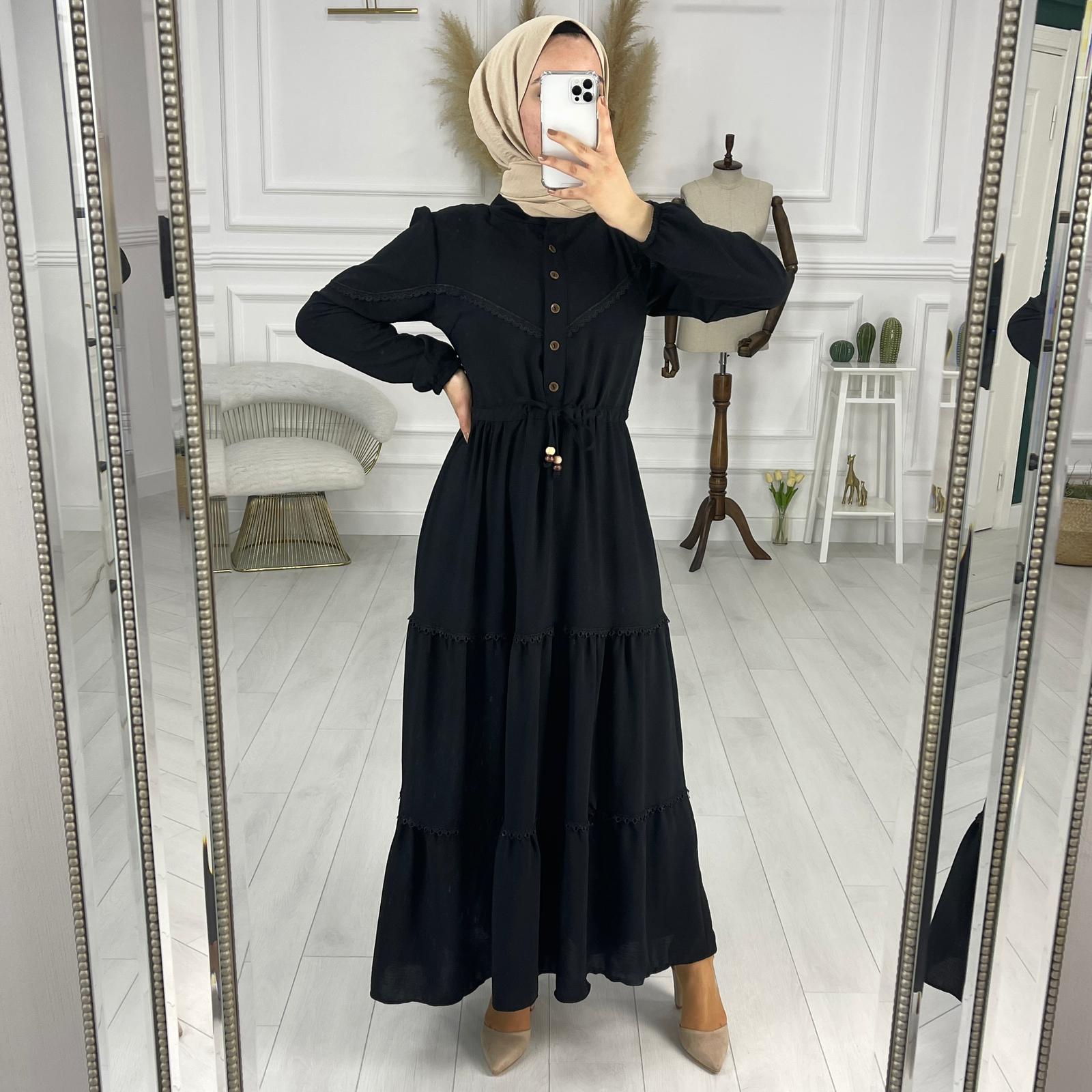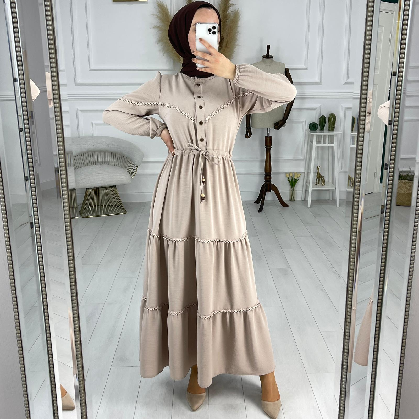 Ön kısmı beline kadar düğmelidir-Bel kısmında sıkıştırılabilen tünelli bağcık vardır-Bilek kısmı lastiklidir-Etek kısmı kat kat büzgülüdür üzeri güpür detaylıdır
