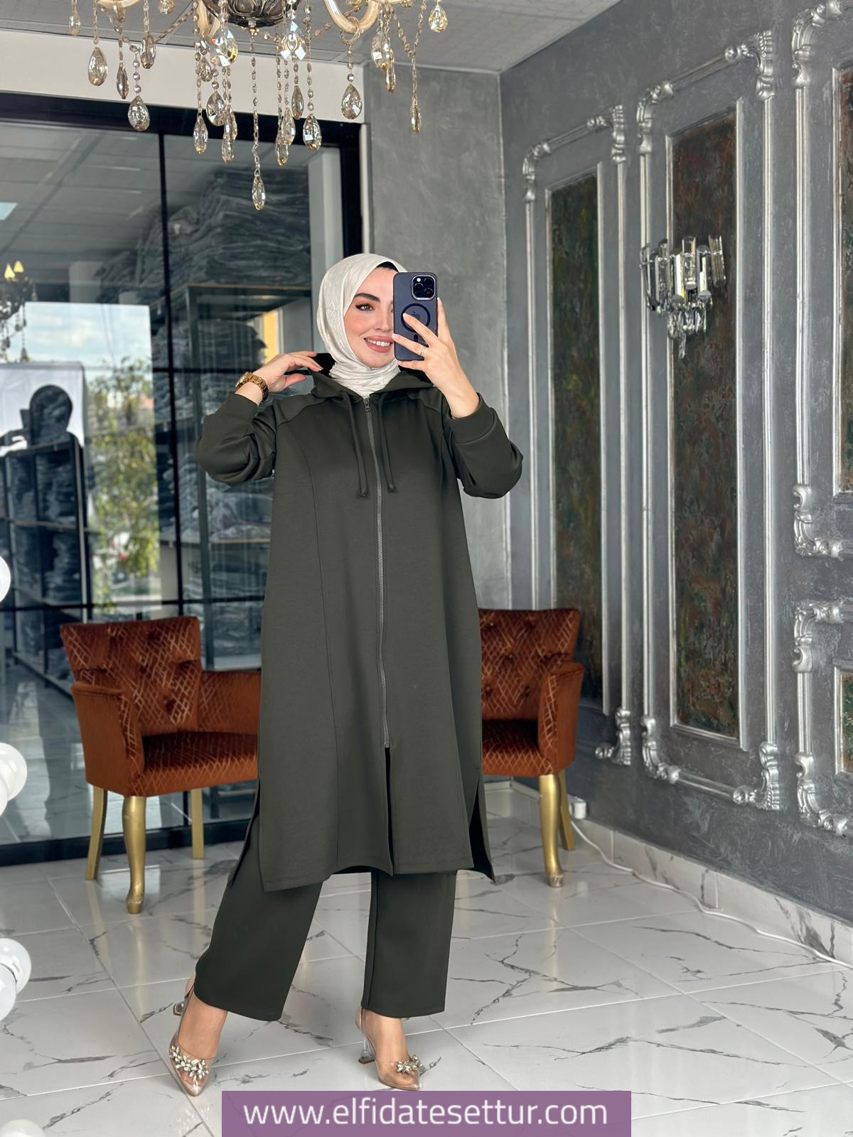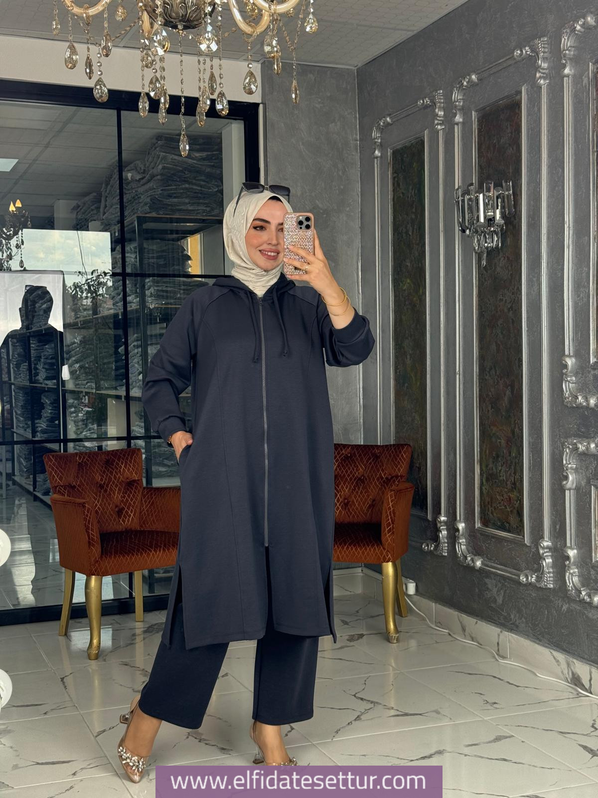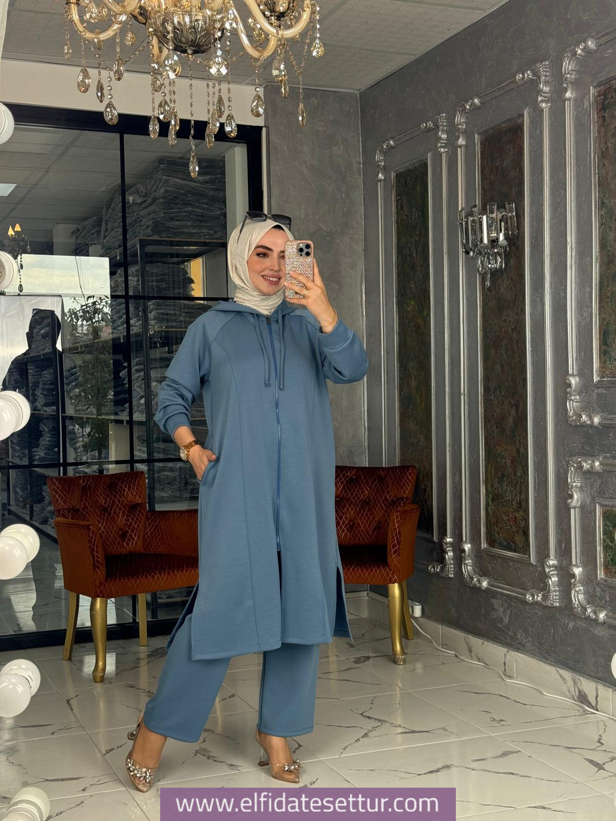 Kumaş Pamuklu Modal, Tunik Fermuarlıdır. Pantolon Cepsizdir.