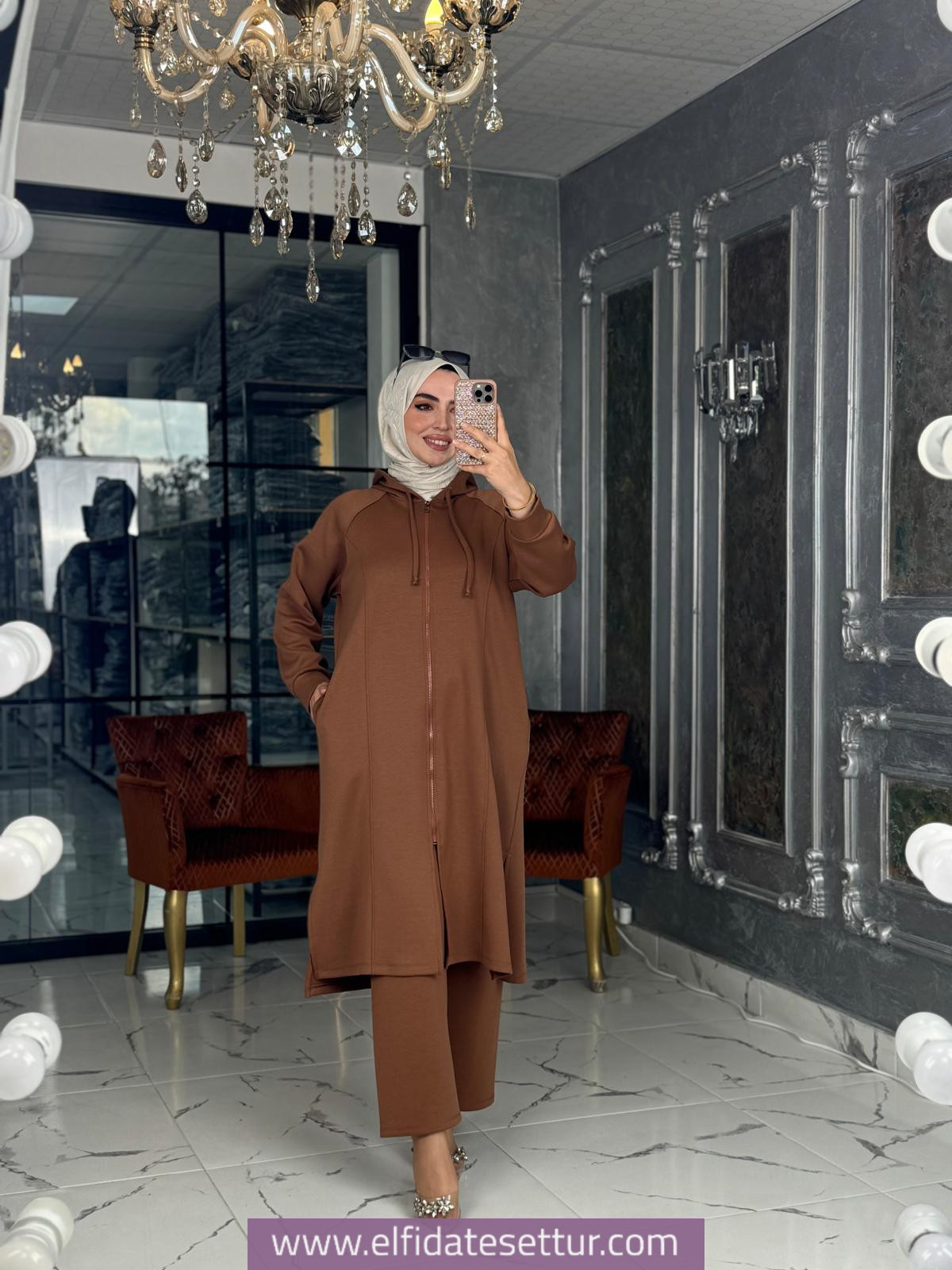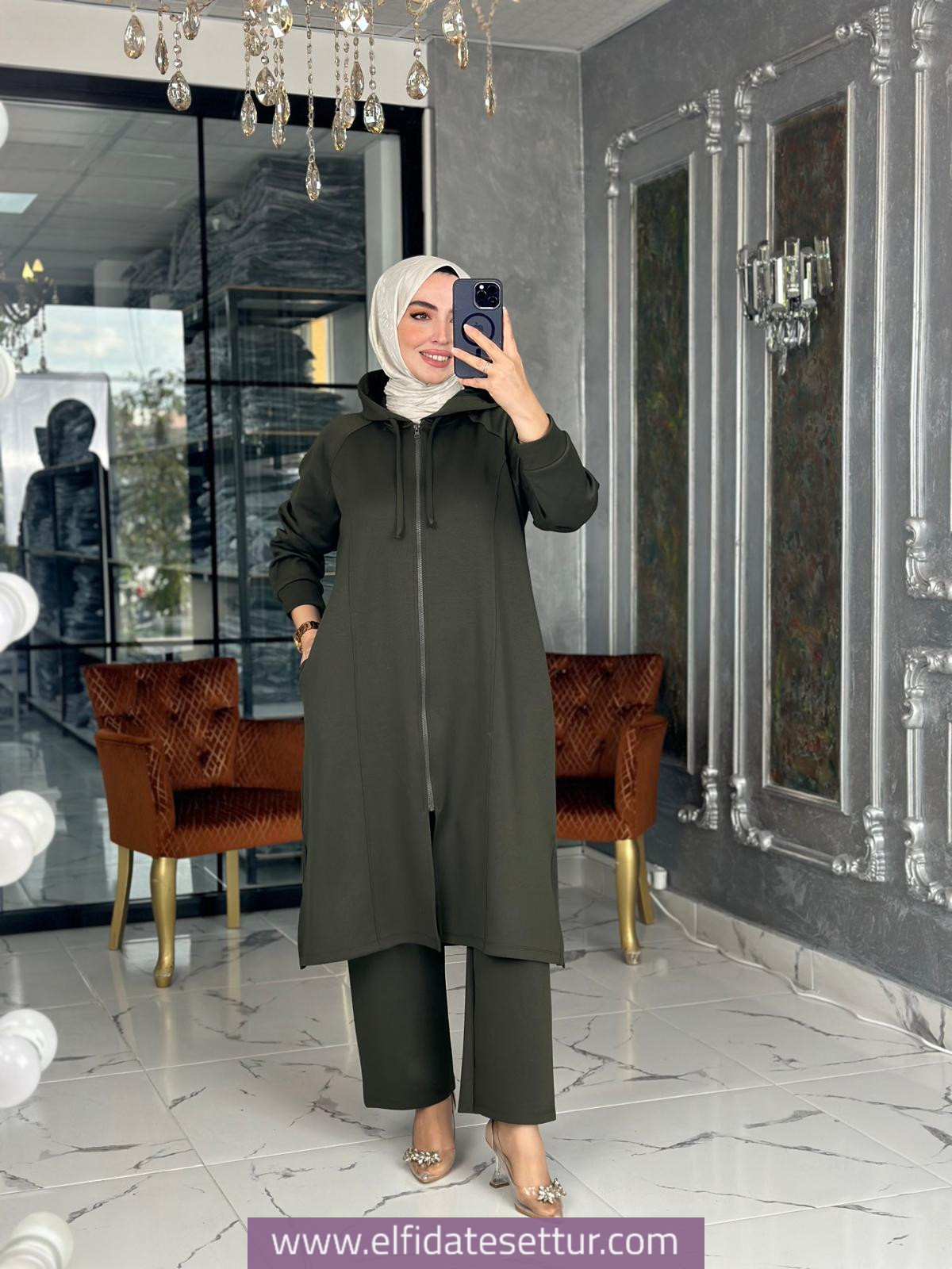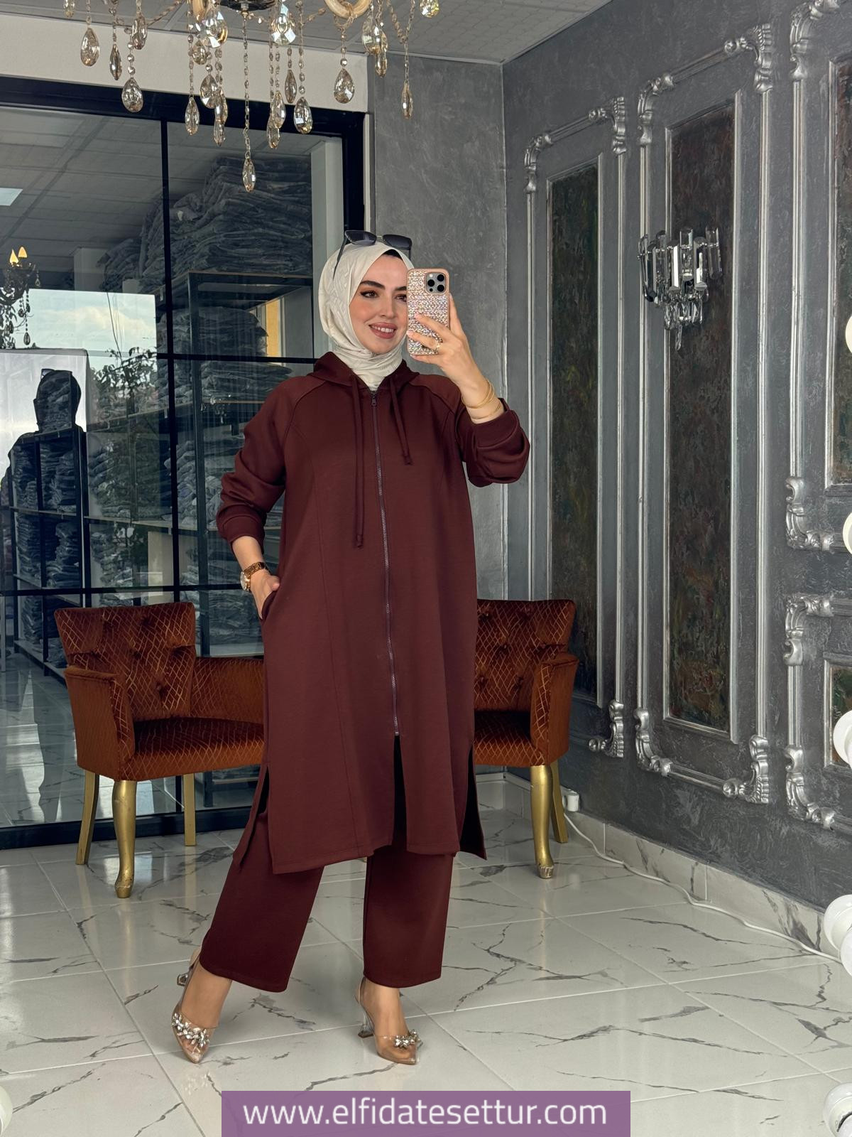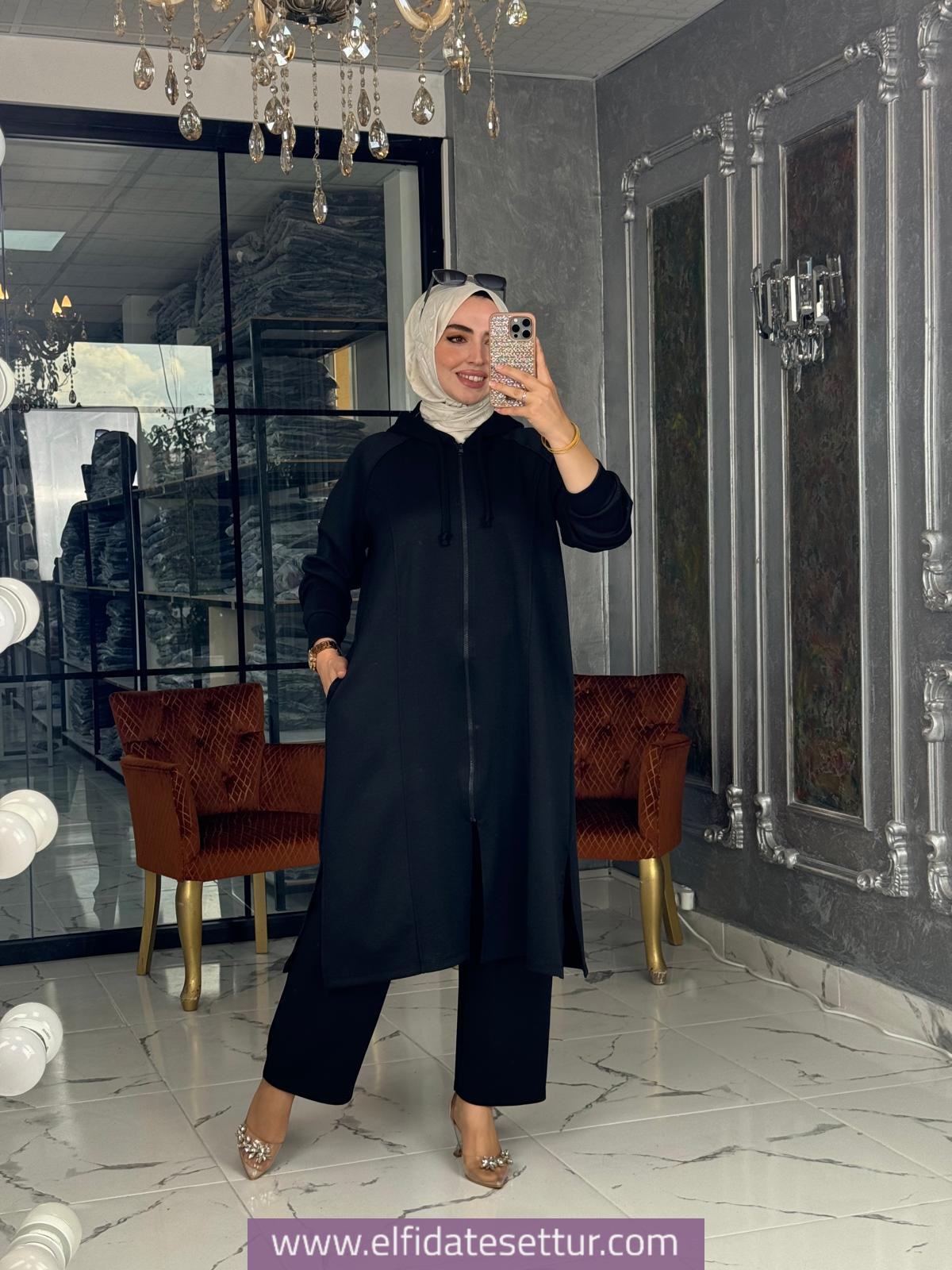 Kumaş Pamuklu Modal, Tunik Fermuarlıdır. Pantolon Cepsizdir.