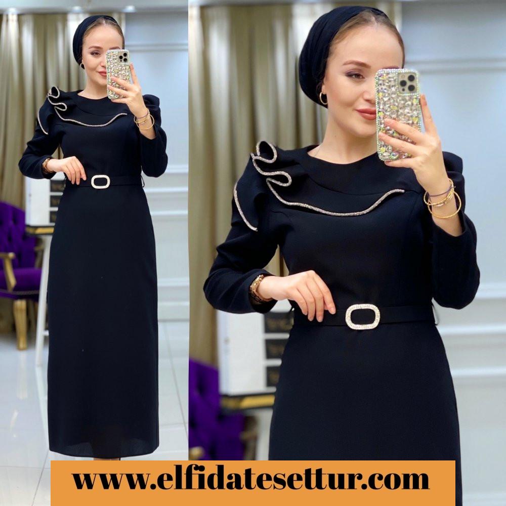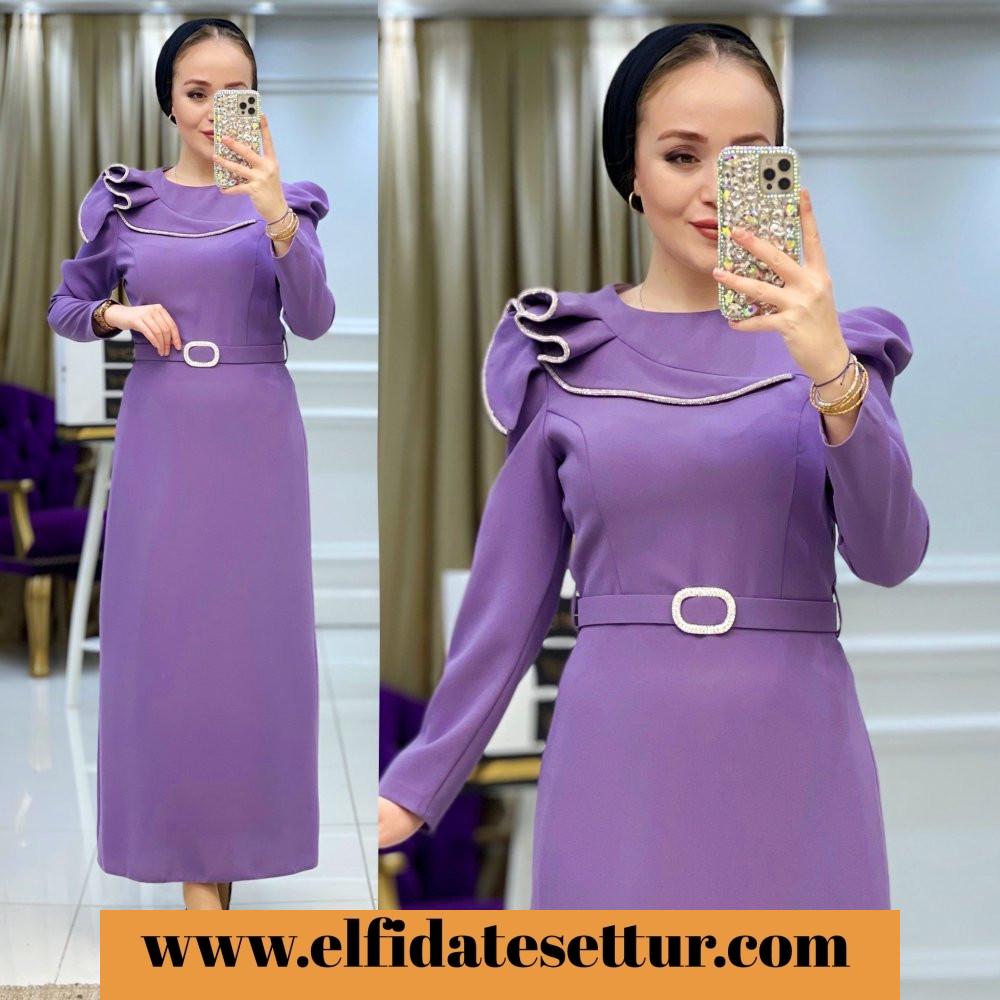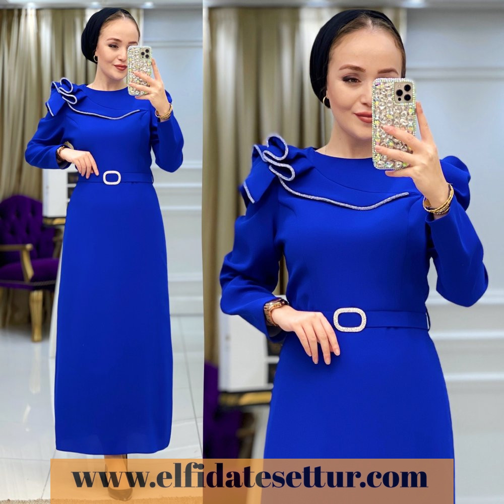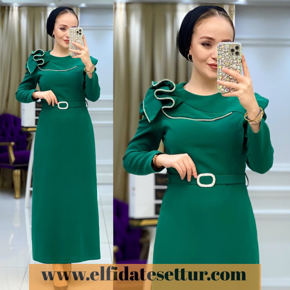 1. Sınıf İthal Krep Kumaştır. 38 Beden Ölçüsü: Elbise boy: 140 cm Göğüs: 100 cm Omuz: 38 cm Elbise yaka kısmi taş detaylı fırfırlıdır. Elbise seyyar kemerlidir. Kemer taş detaylıdır. Elbise boydan boya astarlıdır.