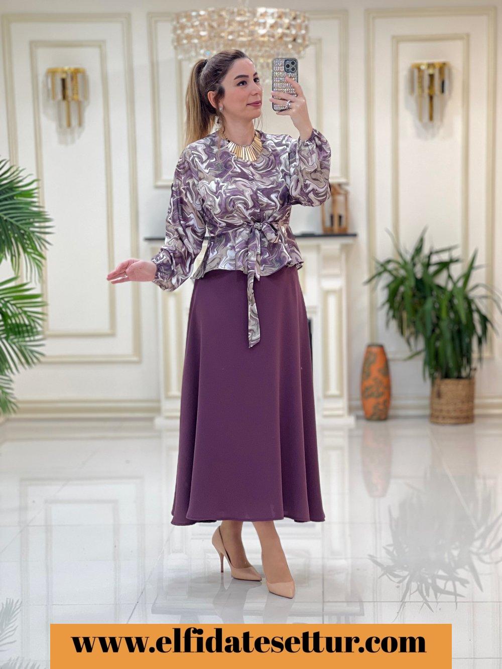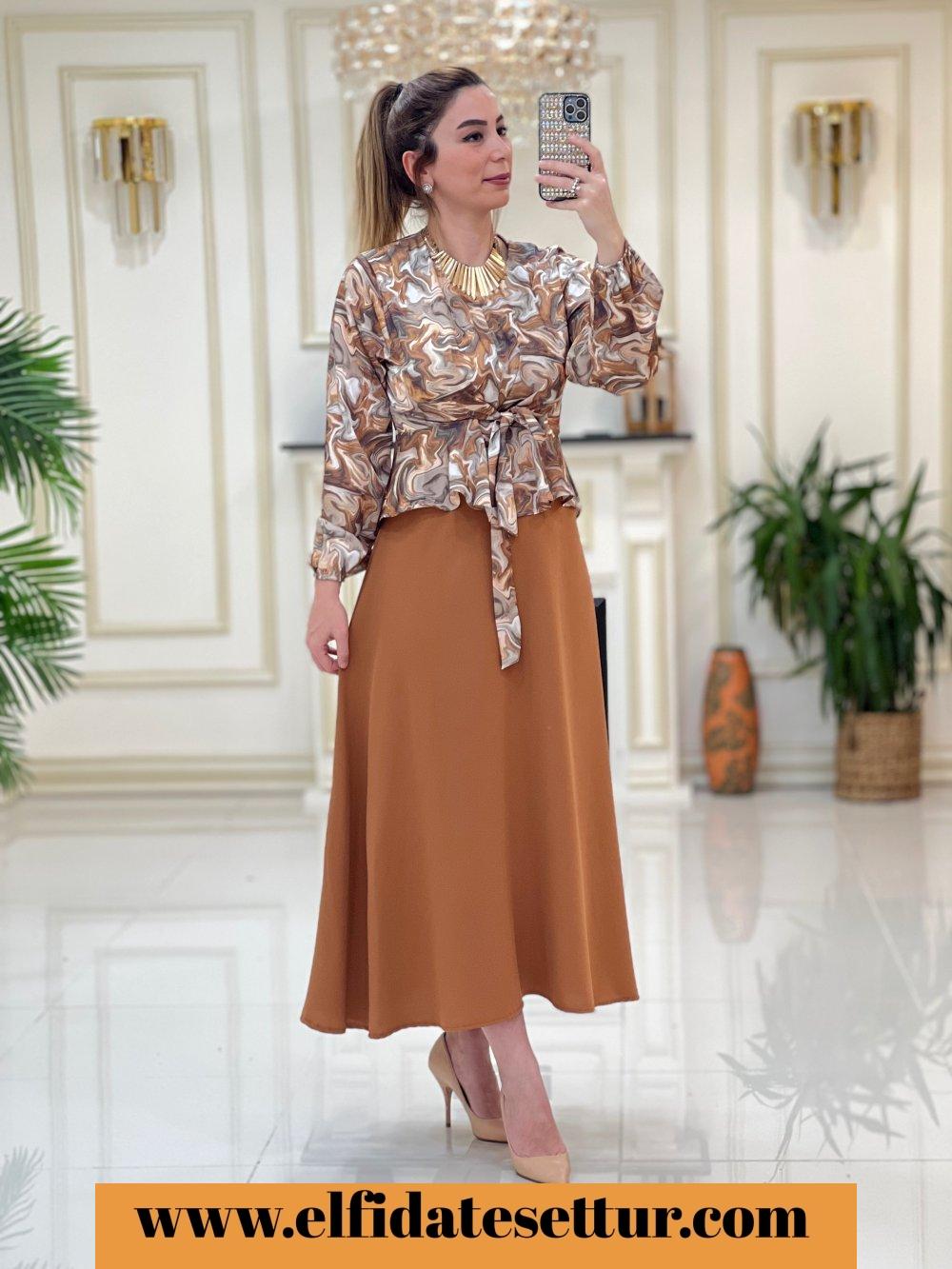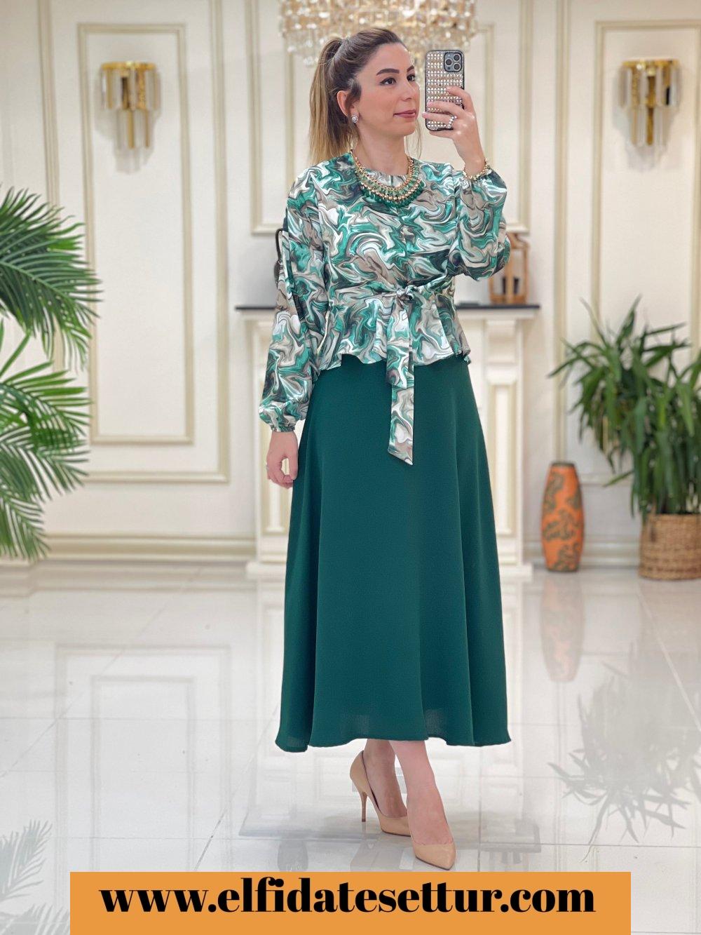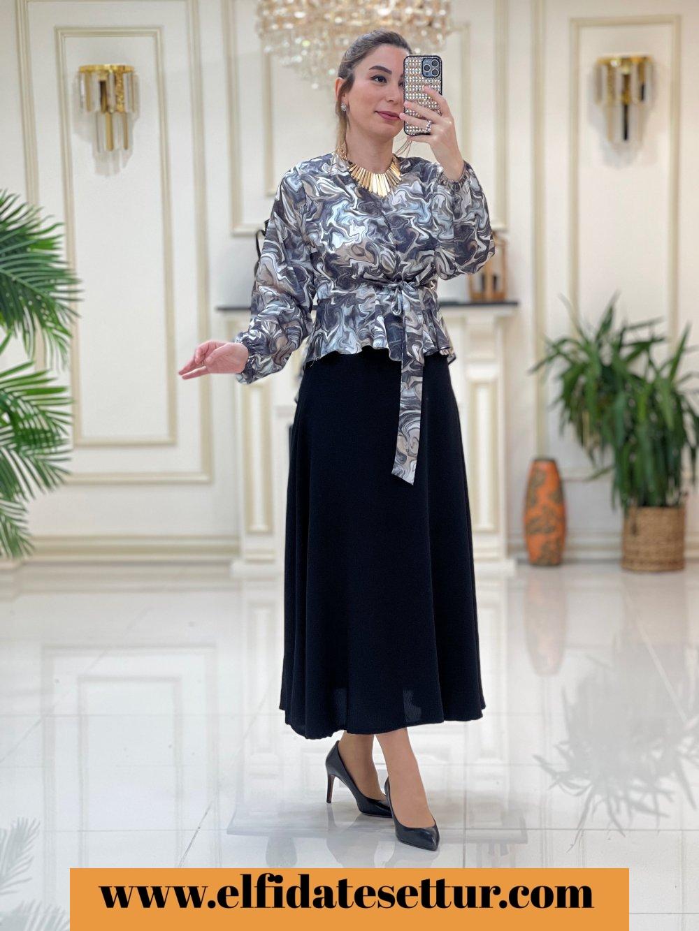 1. Sınıf Bluz Baskılı Saten Kumaştır. Etek Krep Kumaştır. 38 Beden Ölçüsü: Bluz ön boy: 45 cm Bluz arka boy: 55 cm Göğüs: 98 cm Omuz: 40 cm Etek boy: 95 cm Etek bel: 40 cm