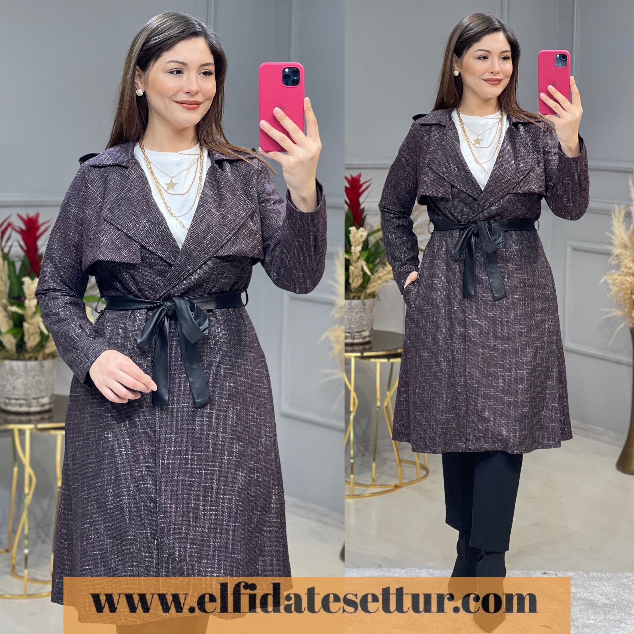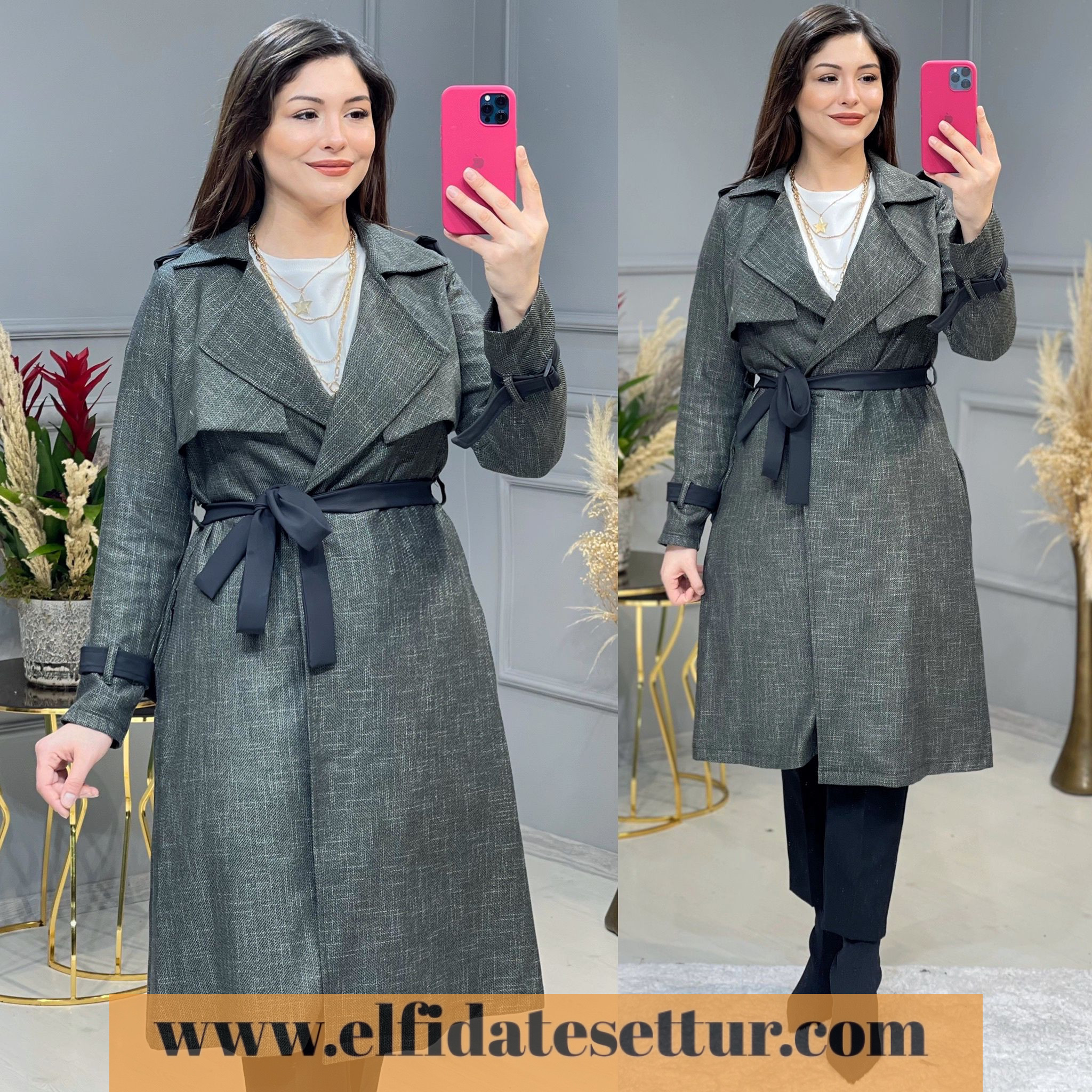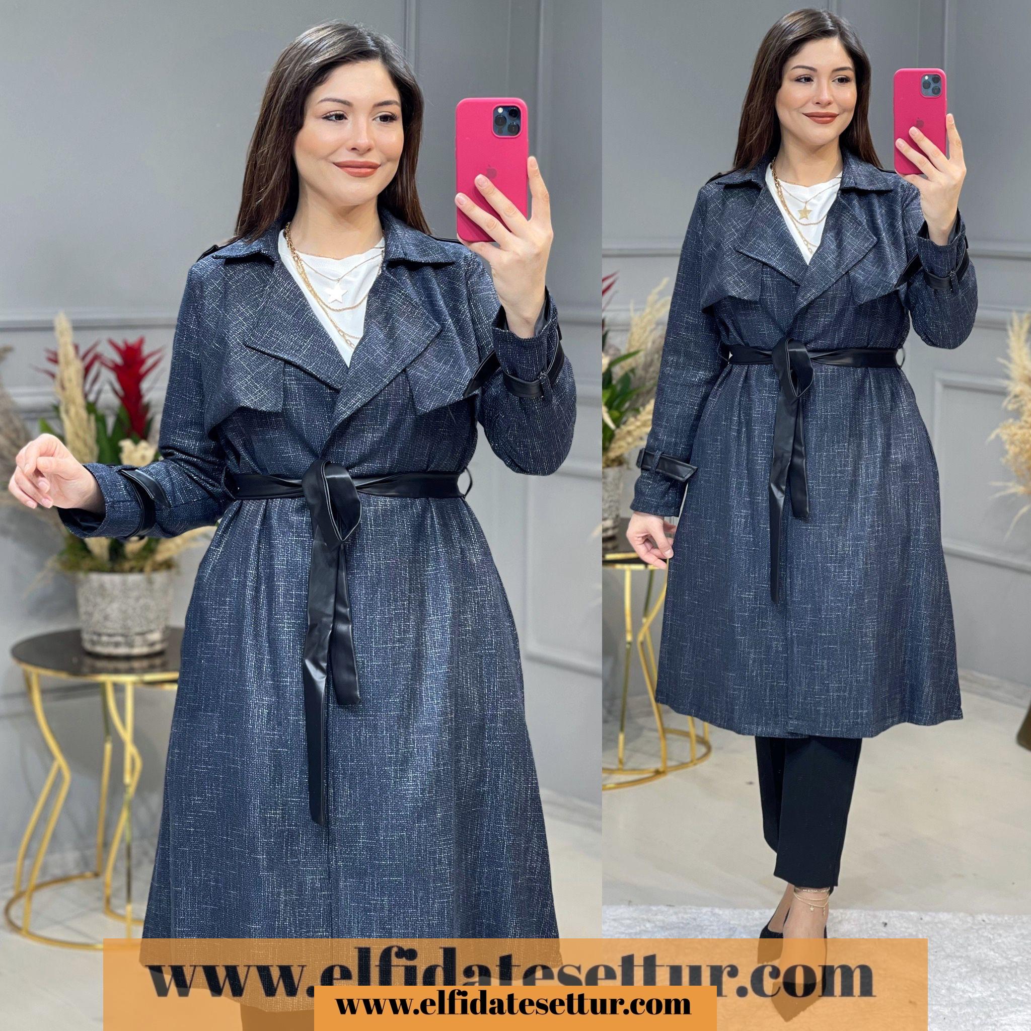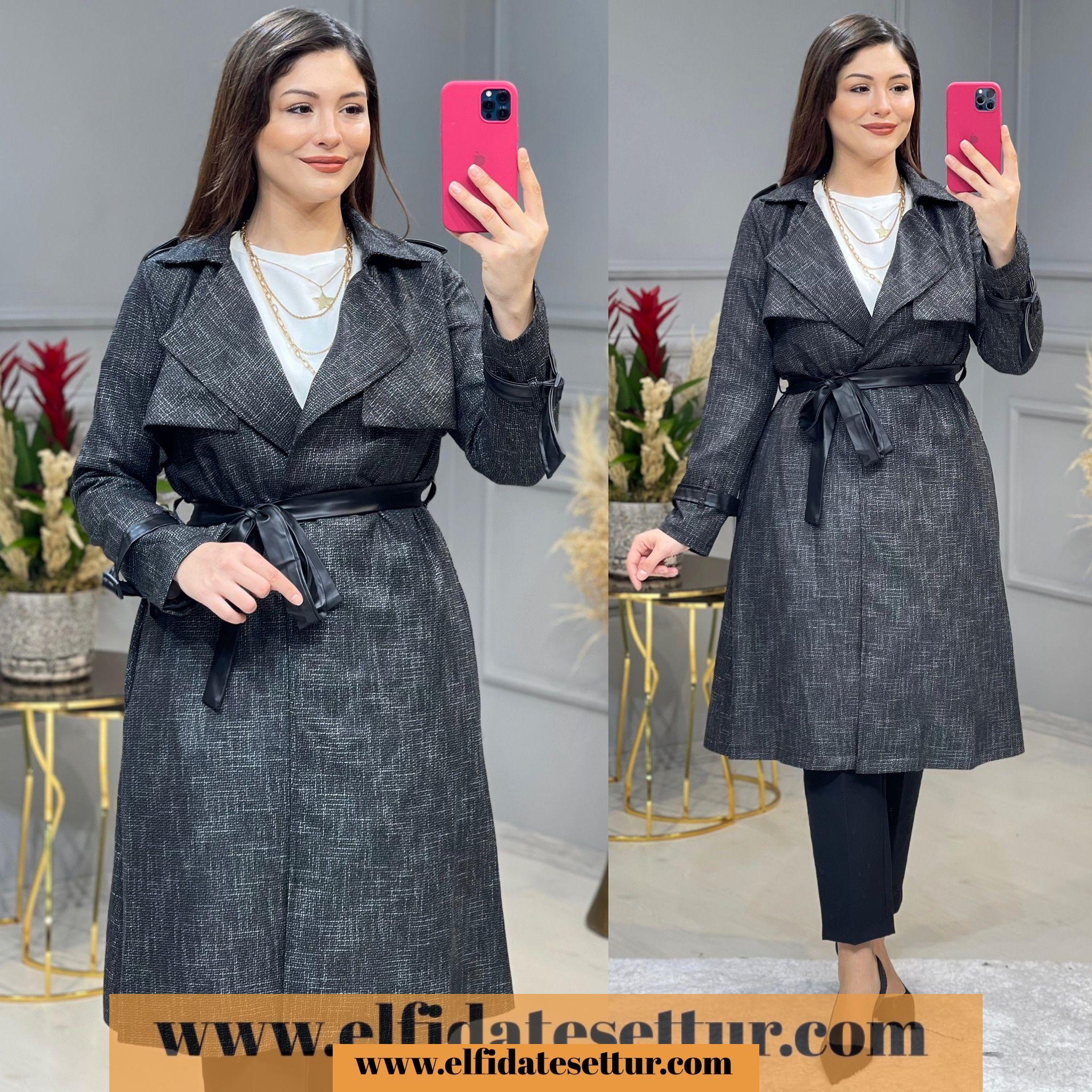 Kol uçlarında deri kemer detayları bulunmaktadır.