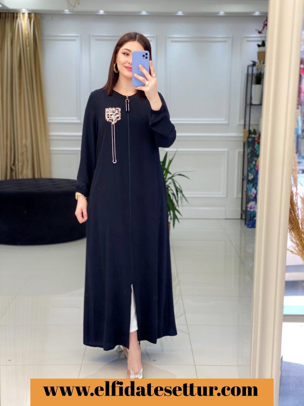 1. Sınıf Hürrem Kumaştır. 40 Beden Ölçüleri: Ferace boy: 140 cm Göğüs: 104 cm Omuz: 38 cm Ferace boydan boya fermuarlıdır. sol kısmı leopar taş detaylıdır.
