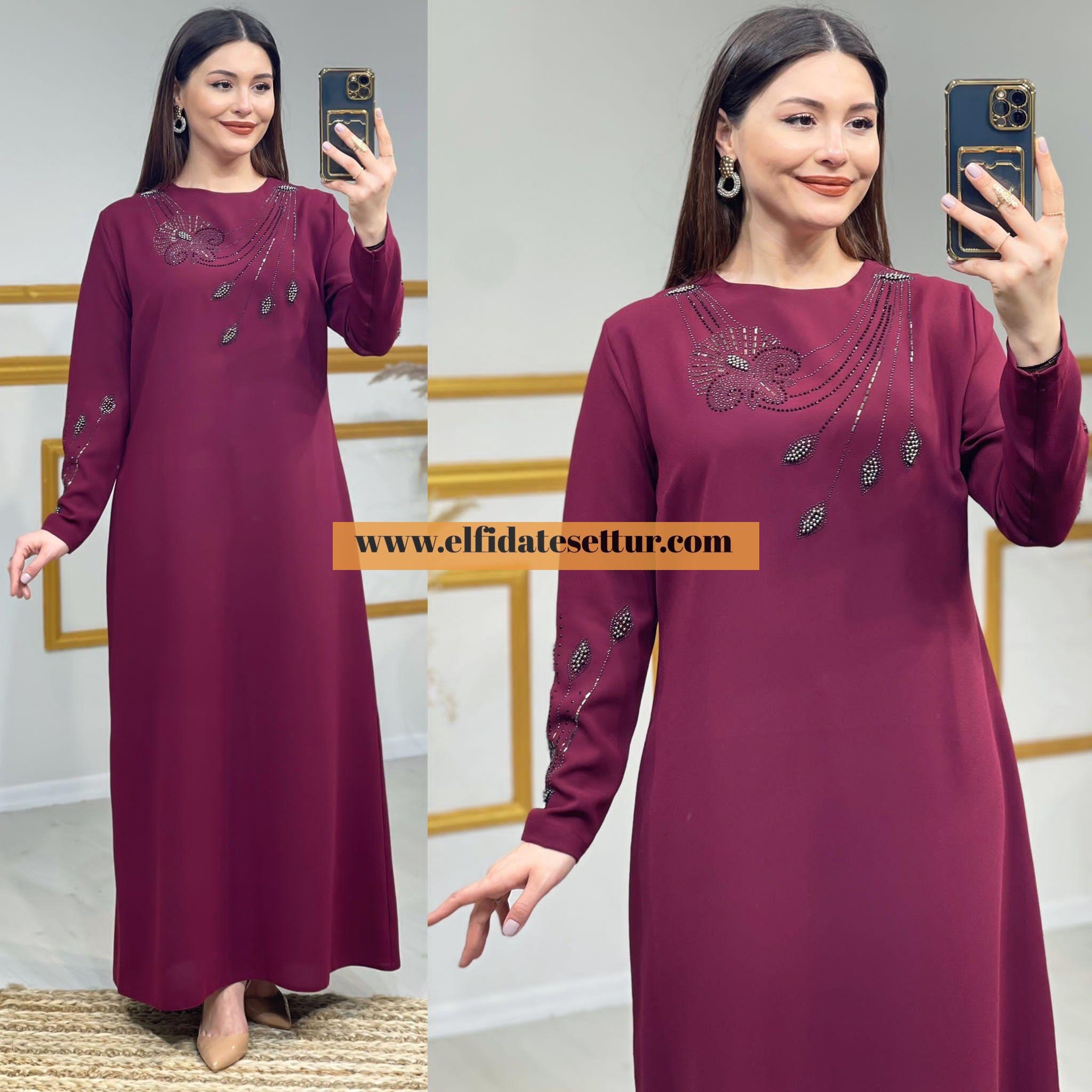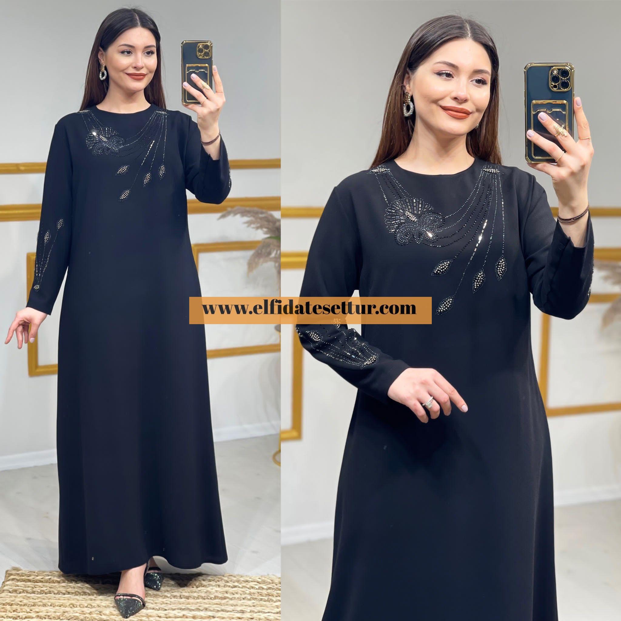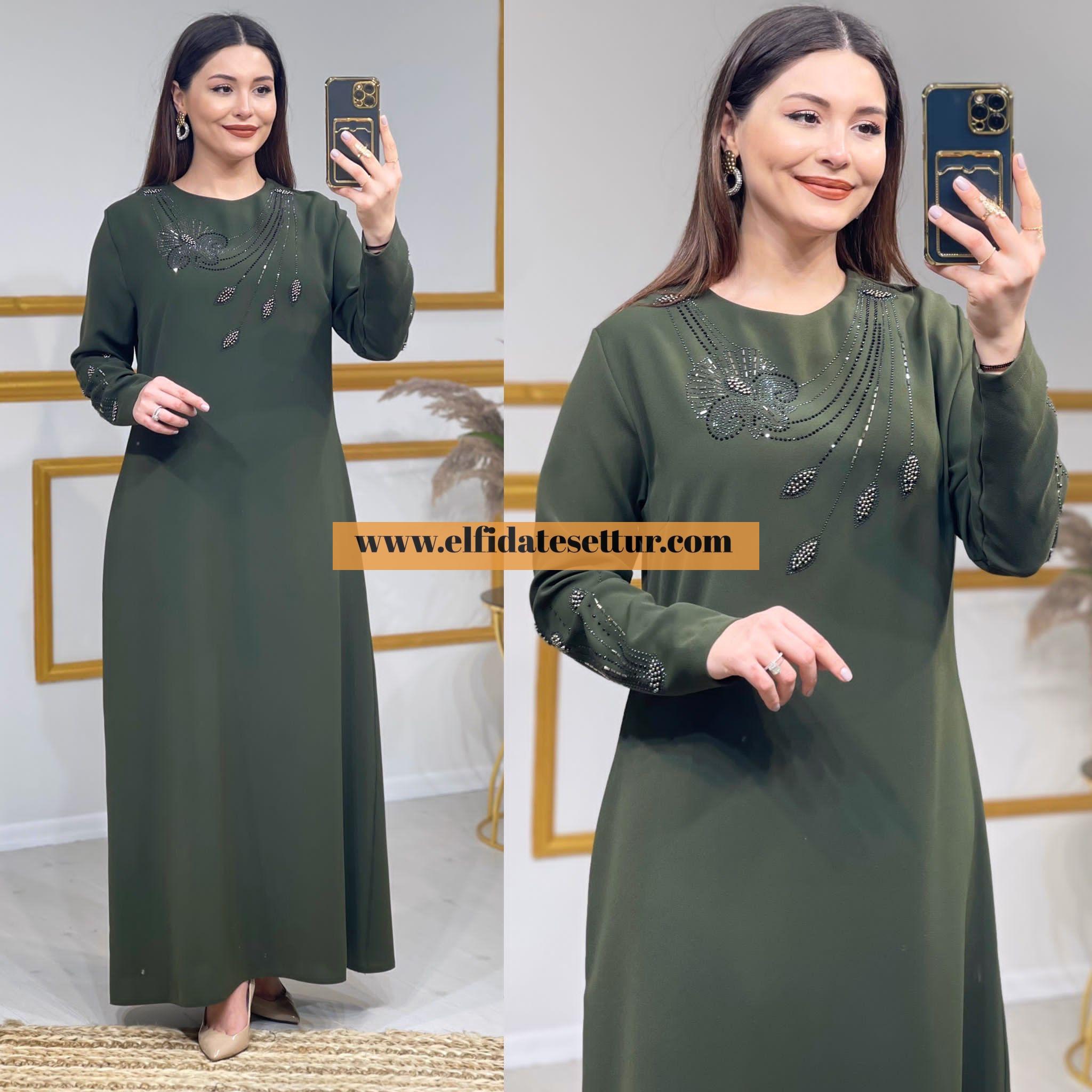 Yaka kısmı ve kolları yaprak desenli taş işleme detaylıdır.