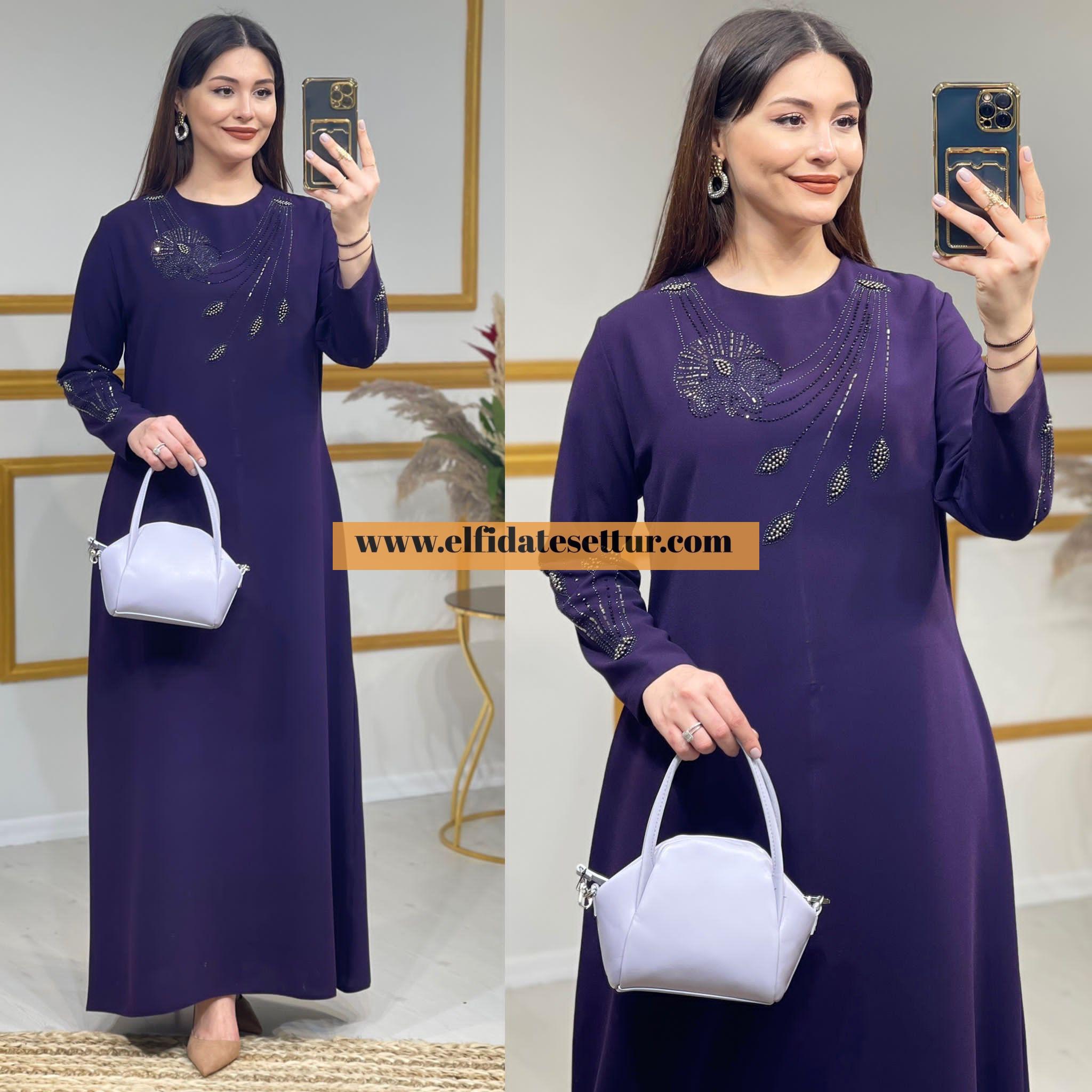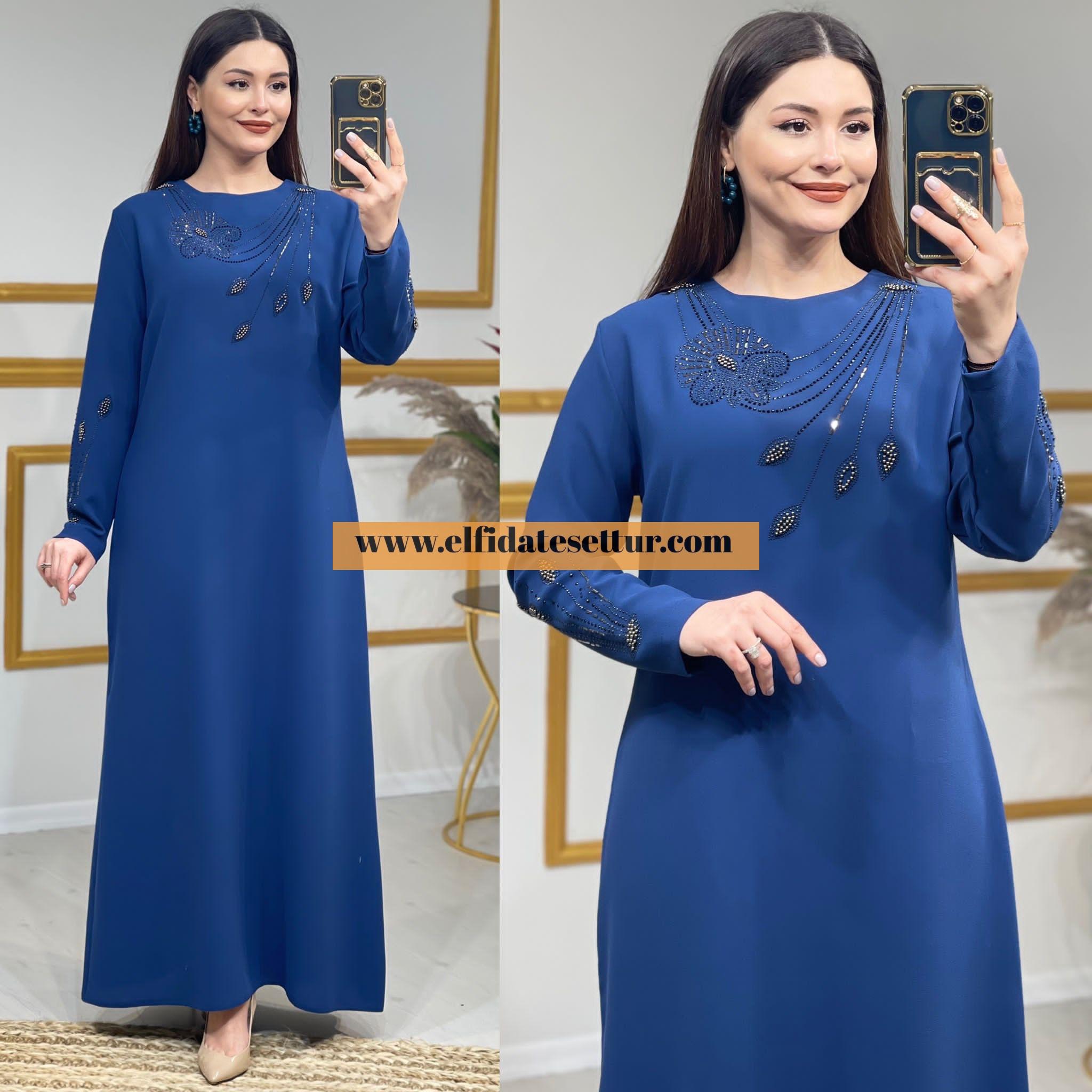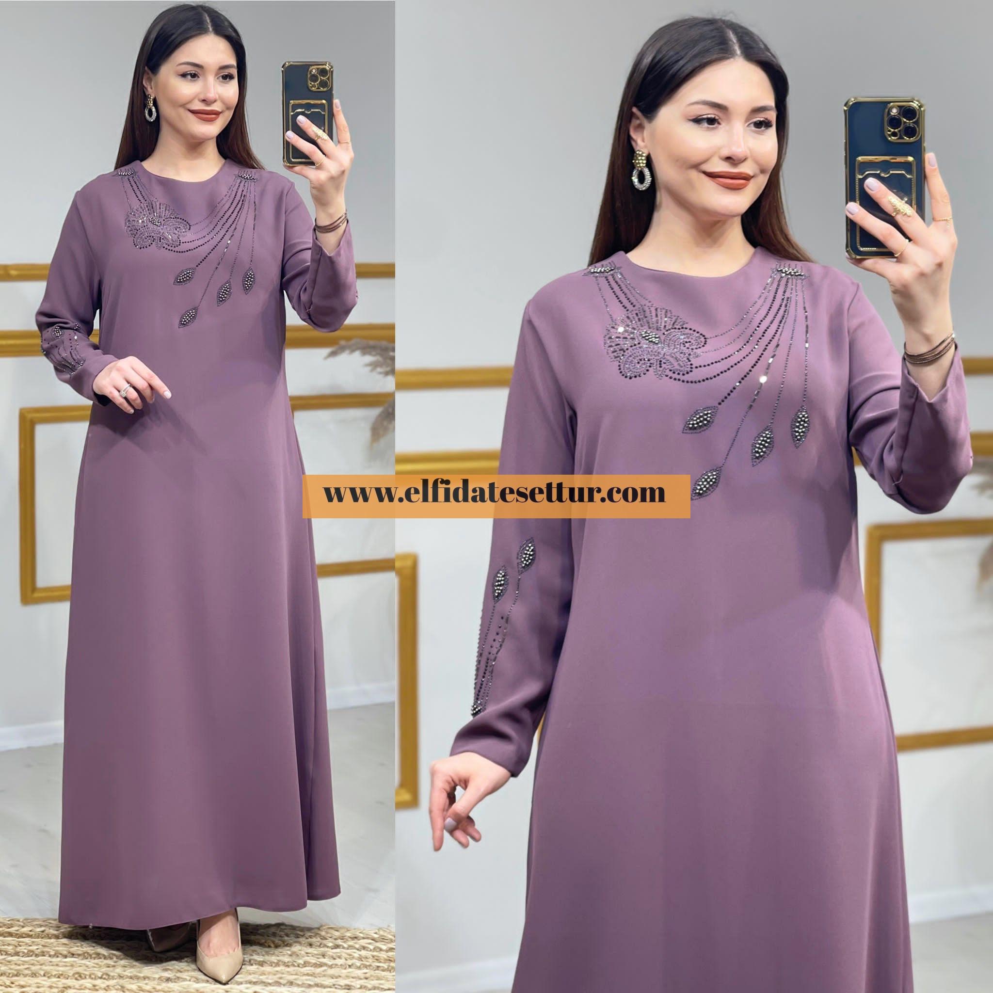 Yaka kısmı ve kolları yaprak desenli taş işleme detaylıdır.