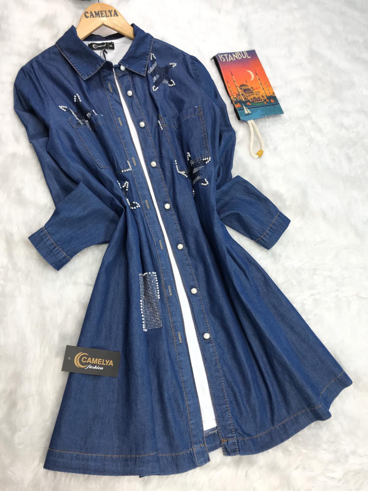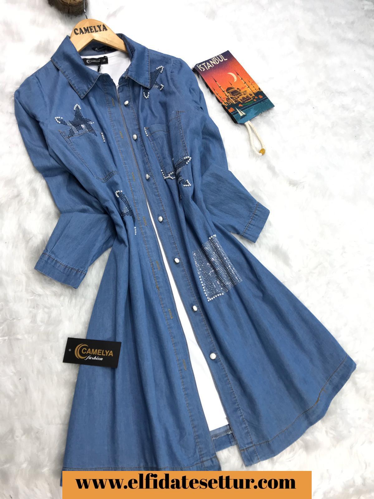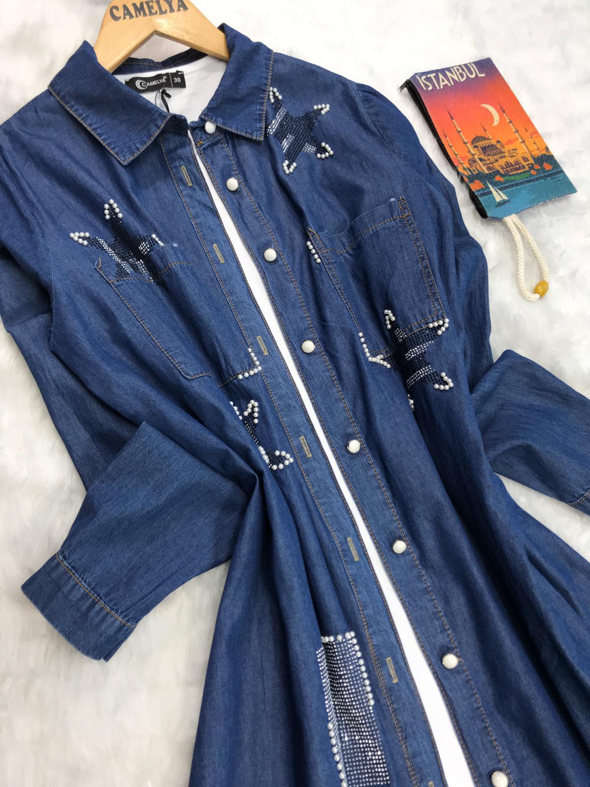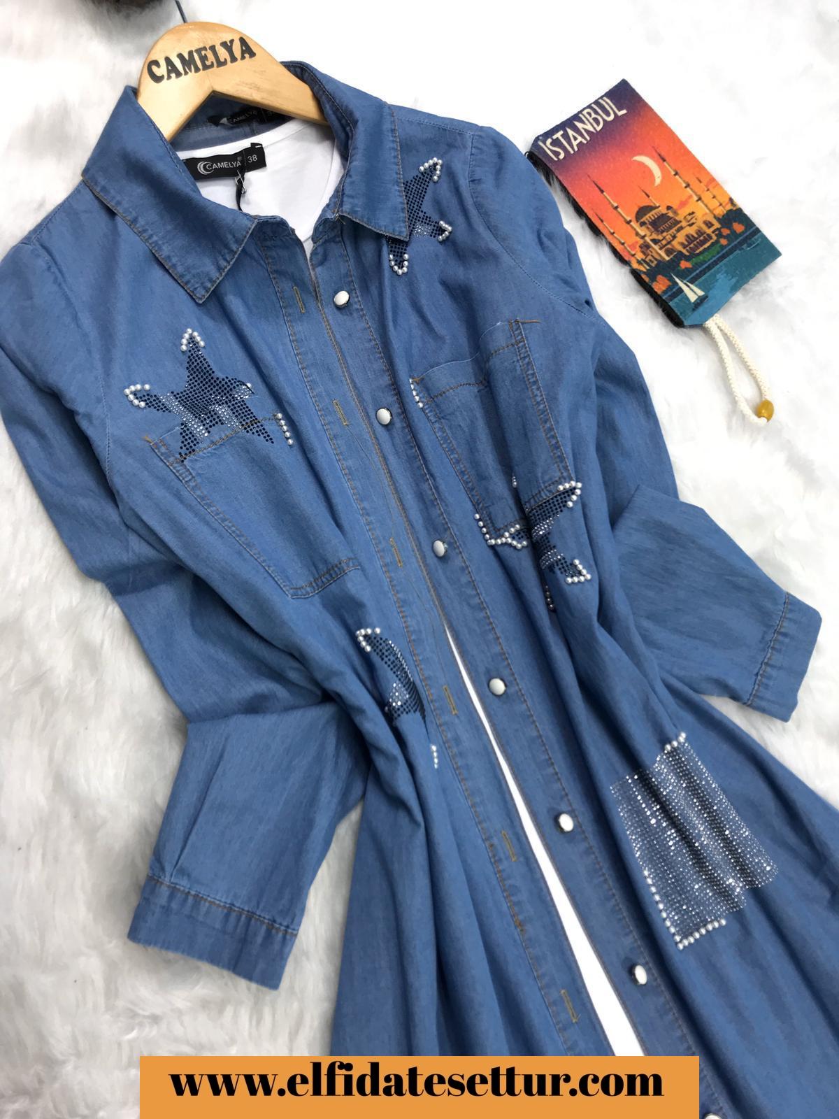 Yıldız 🌟 detaylı içlik dahil kot tuniklerimiz stoklarda (S) 6519 (G)