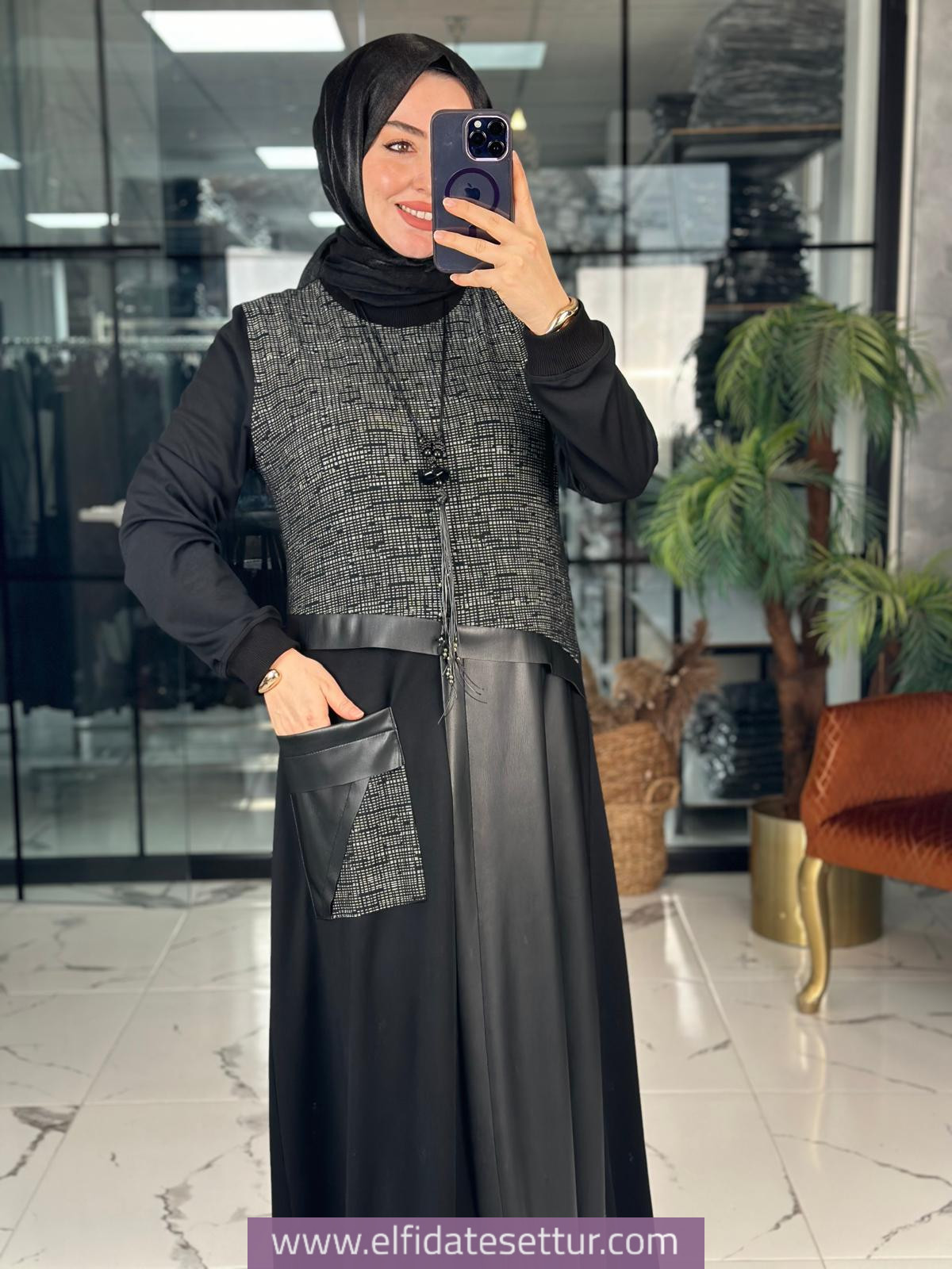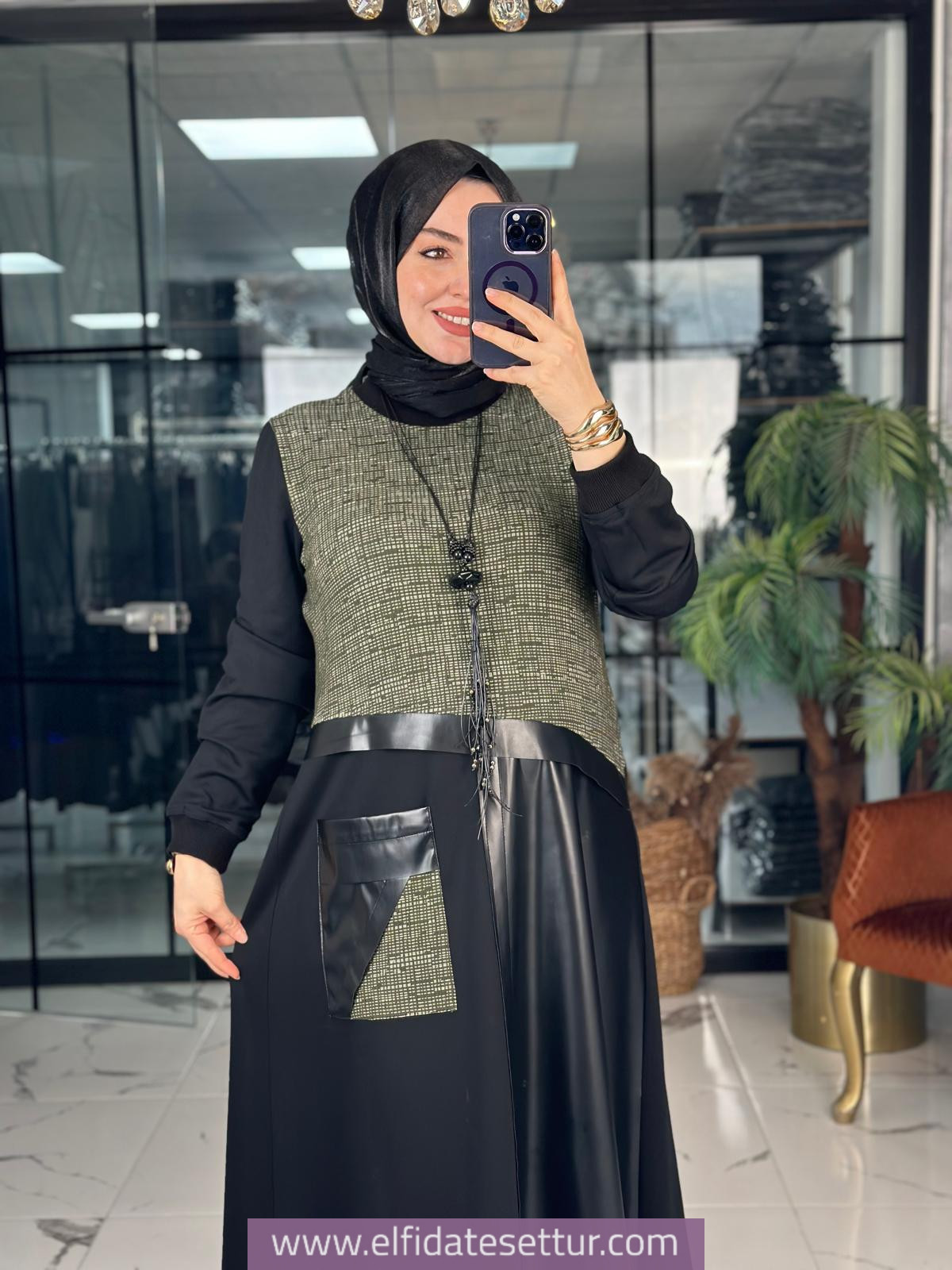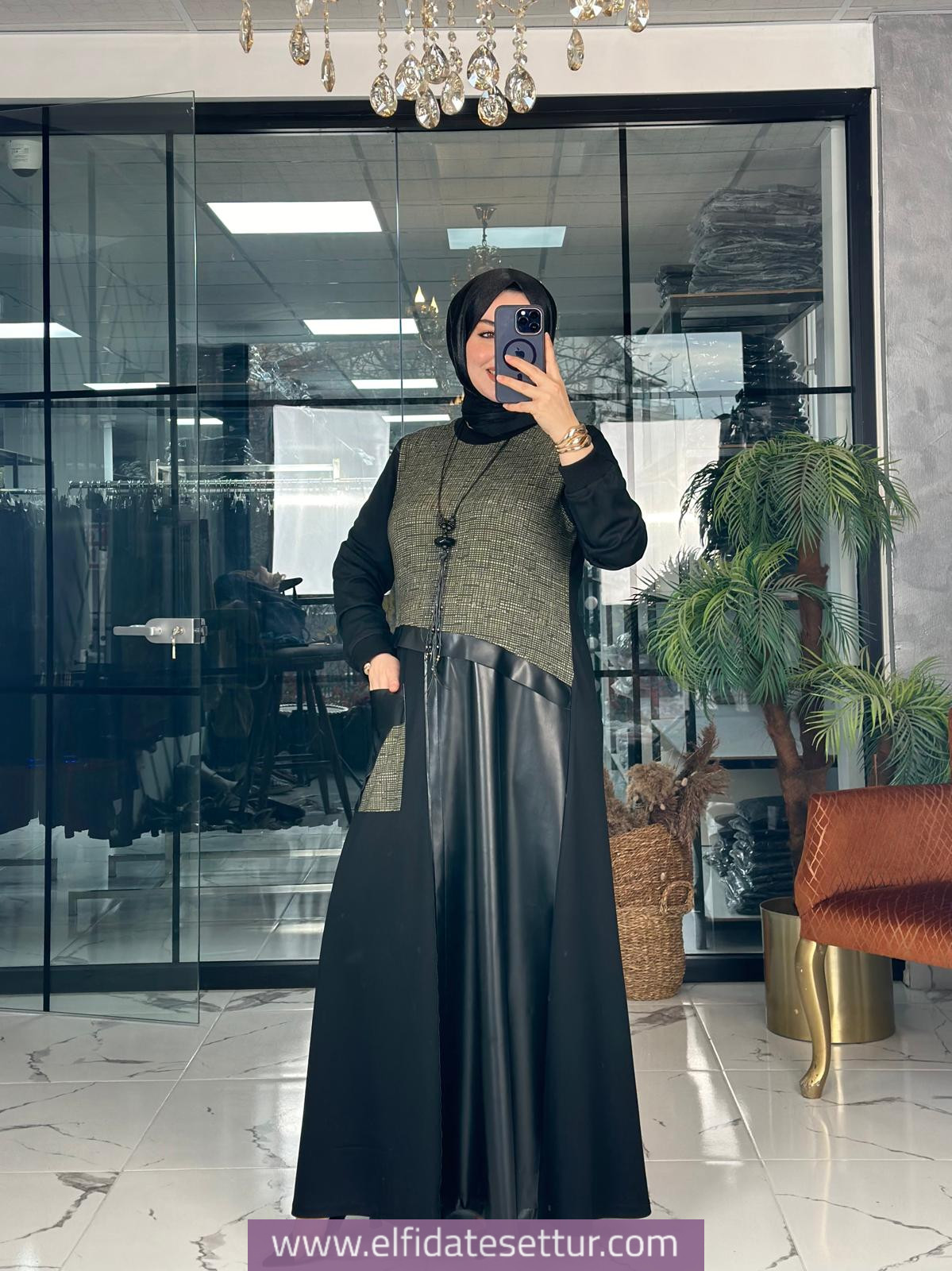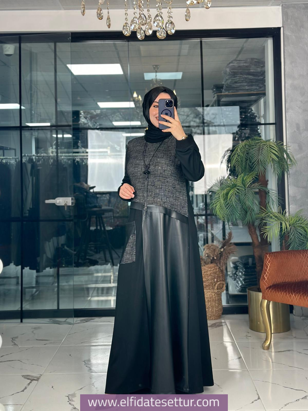 Kumaşı krep kumaştır deri ve örme kombinli.