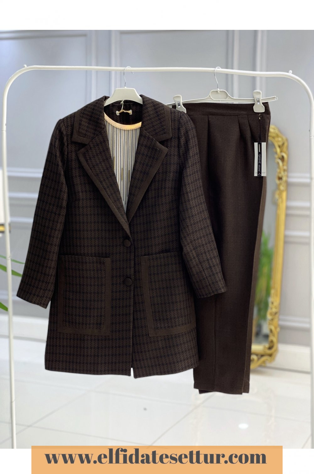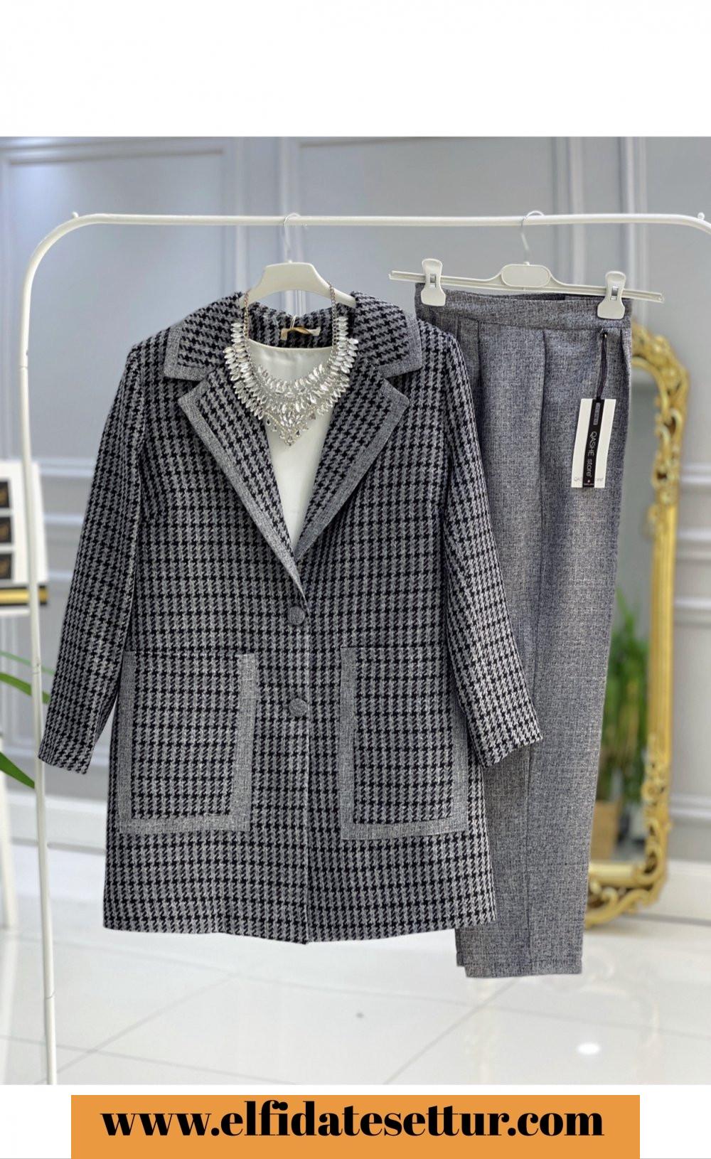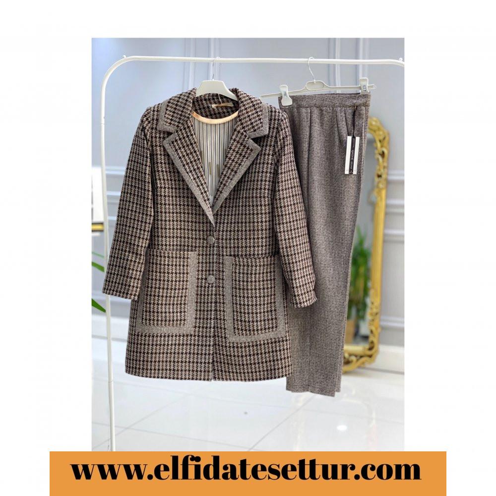1. Sınıf Dokuma Krep Kumaştır. 38 Beden Ölçüsü: Ceket boy: 85 cm Göğüs: 100 cm Omuz: 38 Ceket önden düğme detaylıdır. Ceket kazağa desenlidir. Pantolon boy: 95 cm Pantolon önden fermuarlı ve düğmelidir.