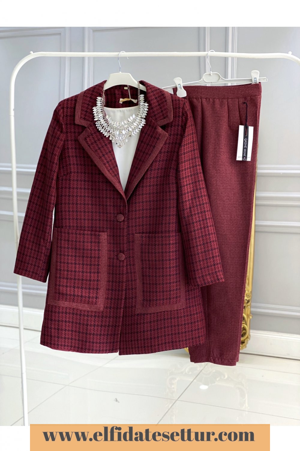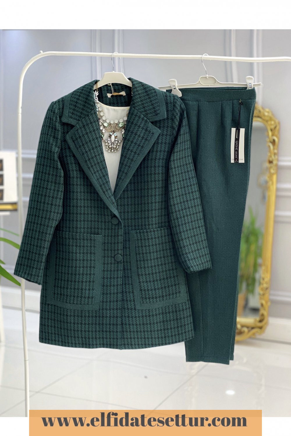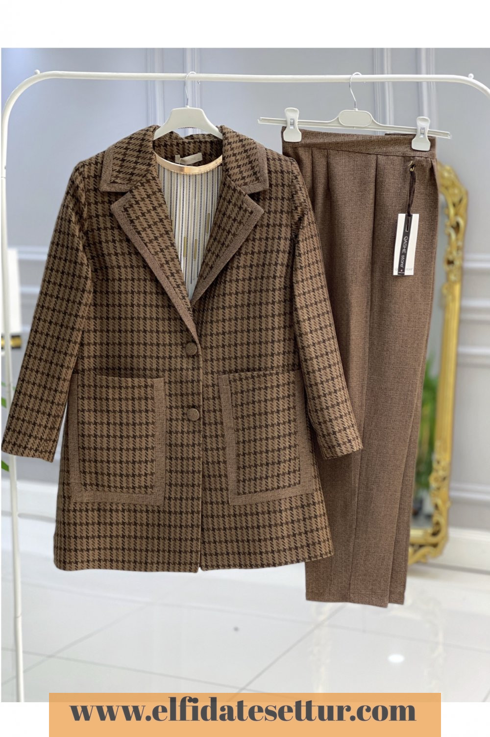 1. Sınıf Dokuma Krep Kumaştır. 38 Beden Ölçüsü: Ceket boy: 85 cm Göğüs: 100 cm Omuz: 38 Ceket önden düğme detaylıdır. Ceket kazağa desenlidir. Pantolon boy: 95 cm Pantolon önden fermuarlı ve düğmelidir.
