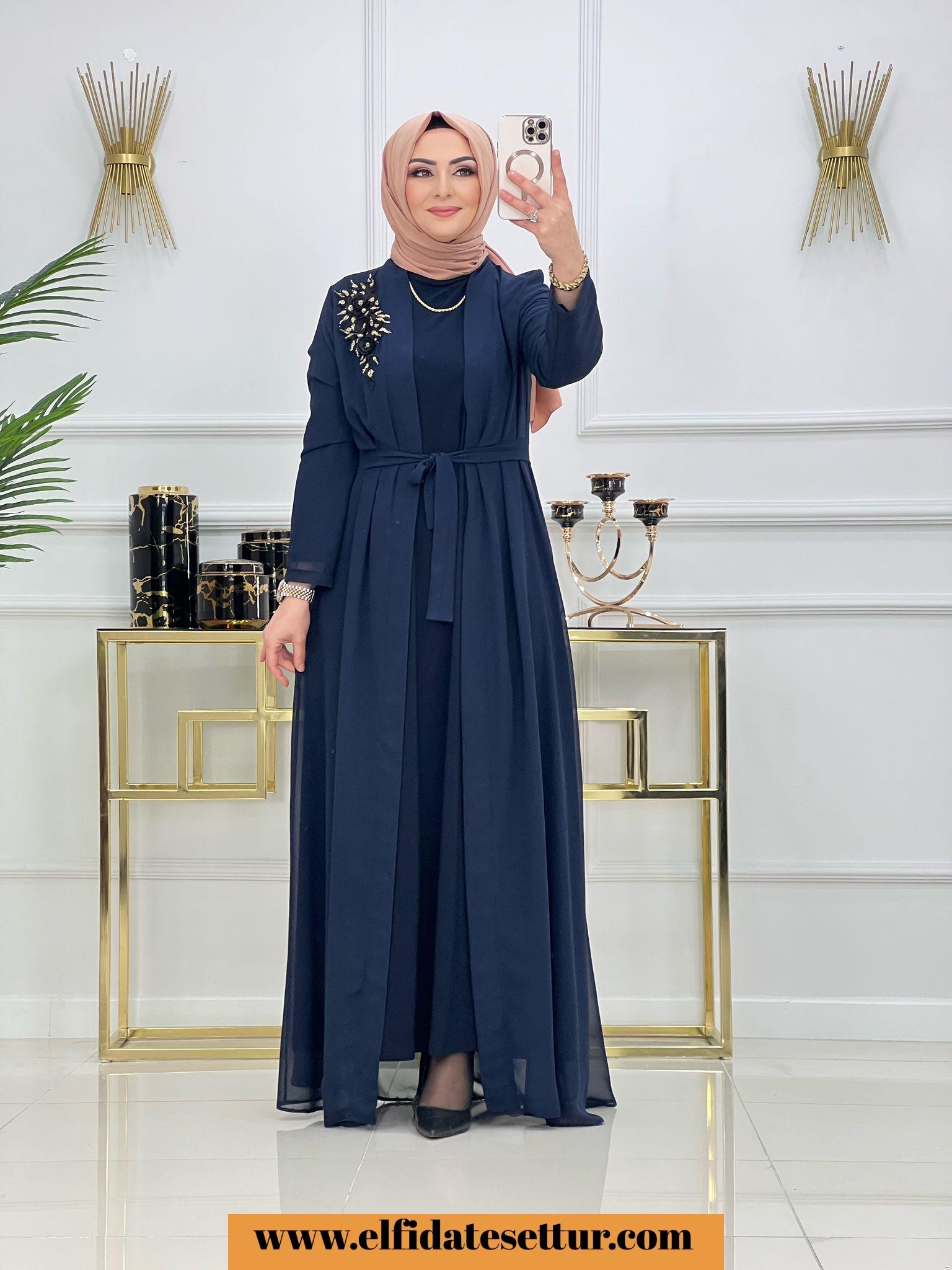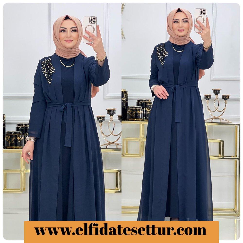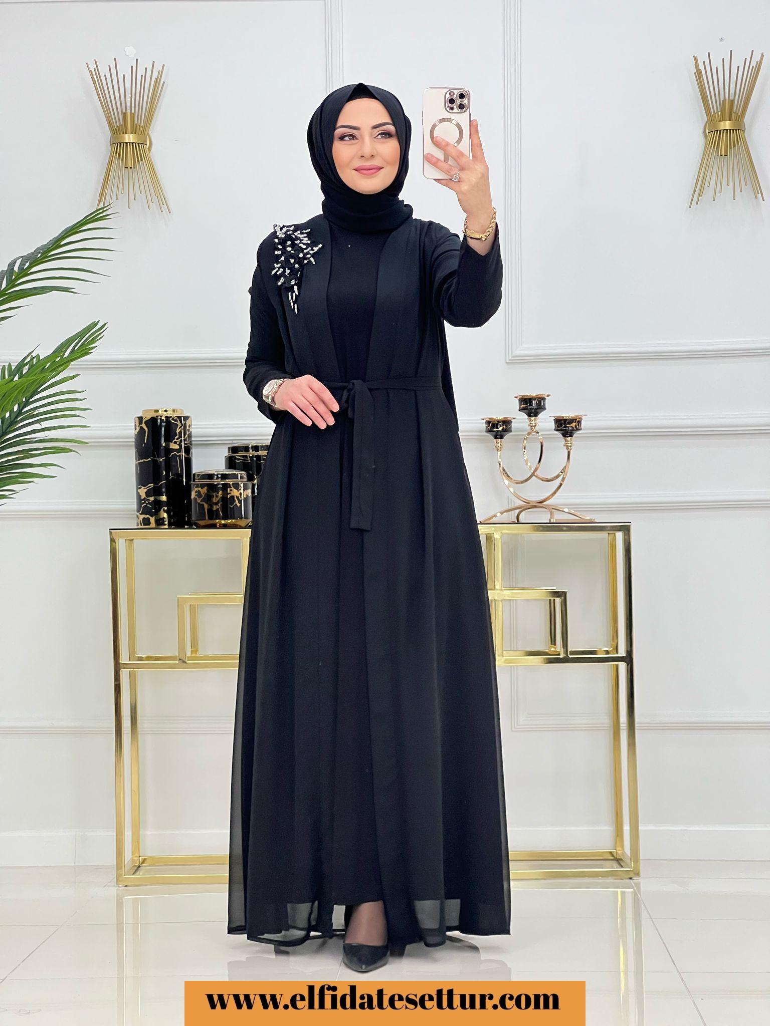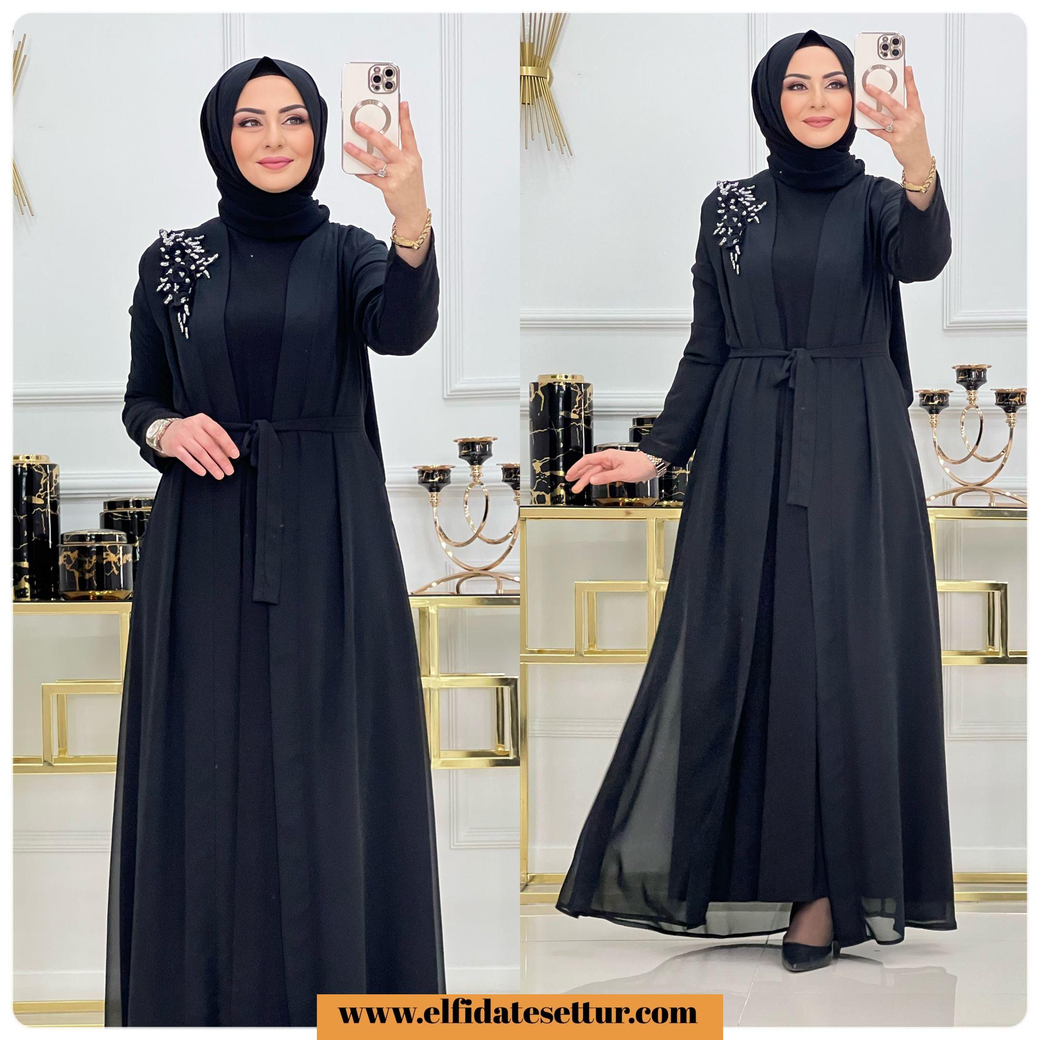 Ürün uzun kollu tilda kumaş elbise ve işleme detaylı tül abaya olarak iki parçadan oluşmaktadır