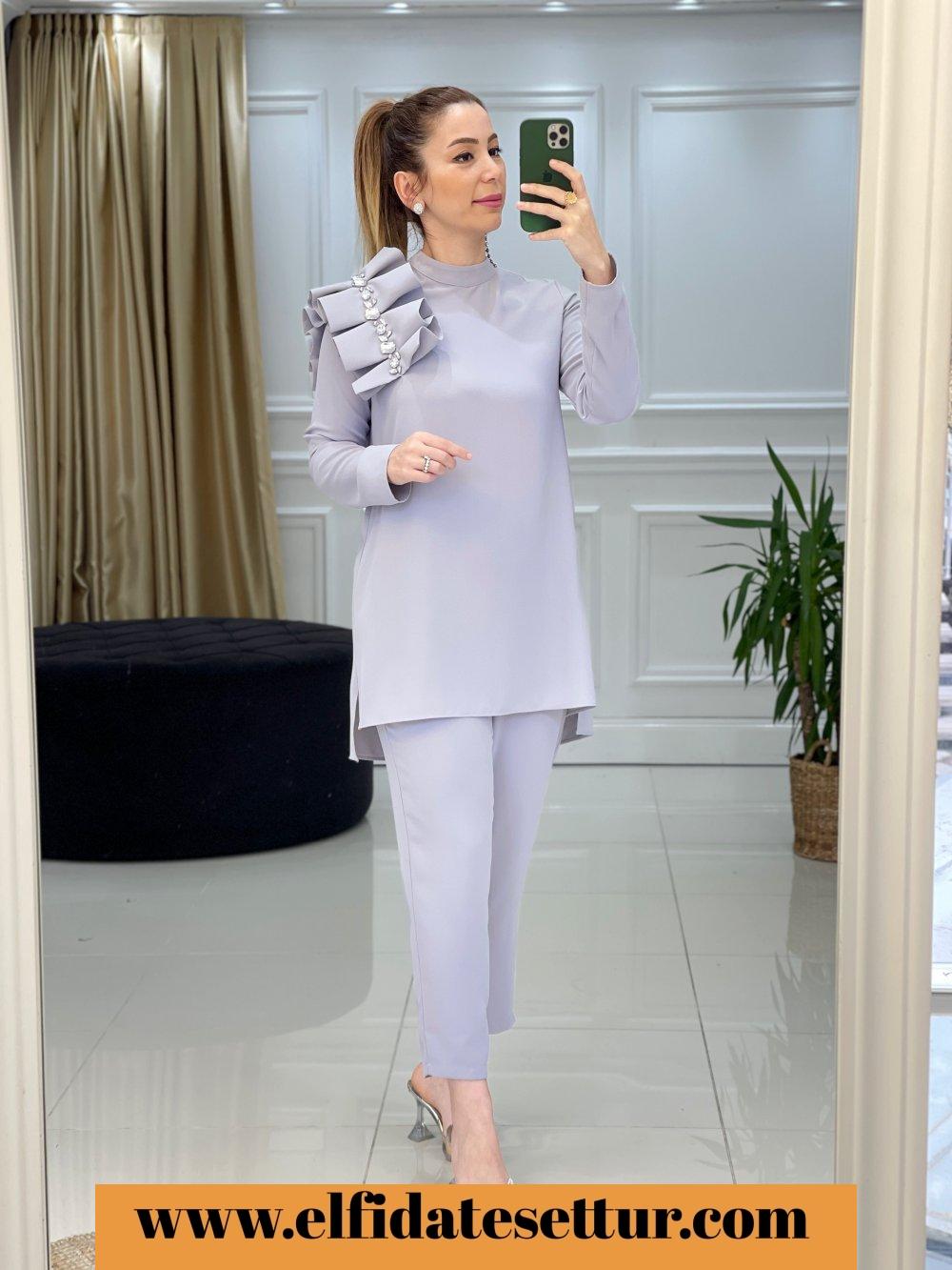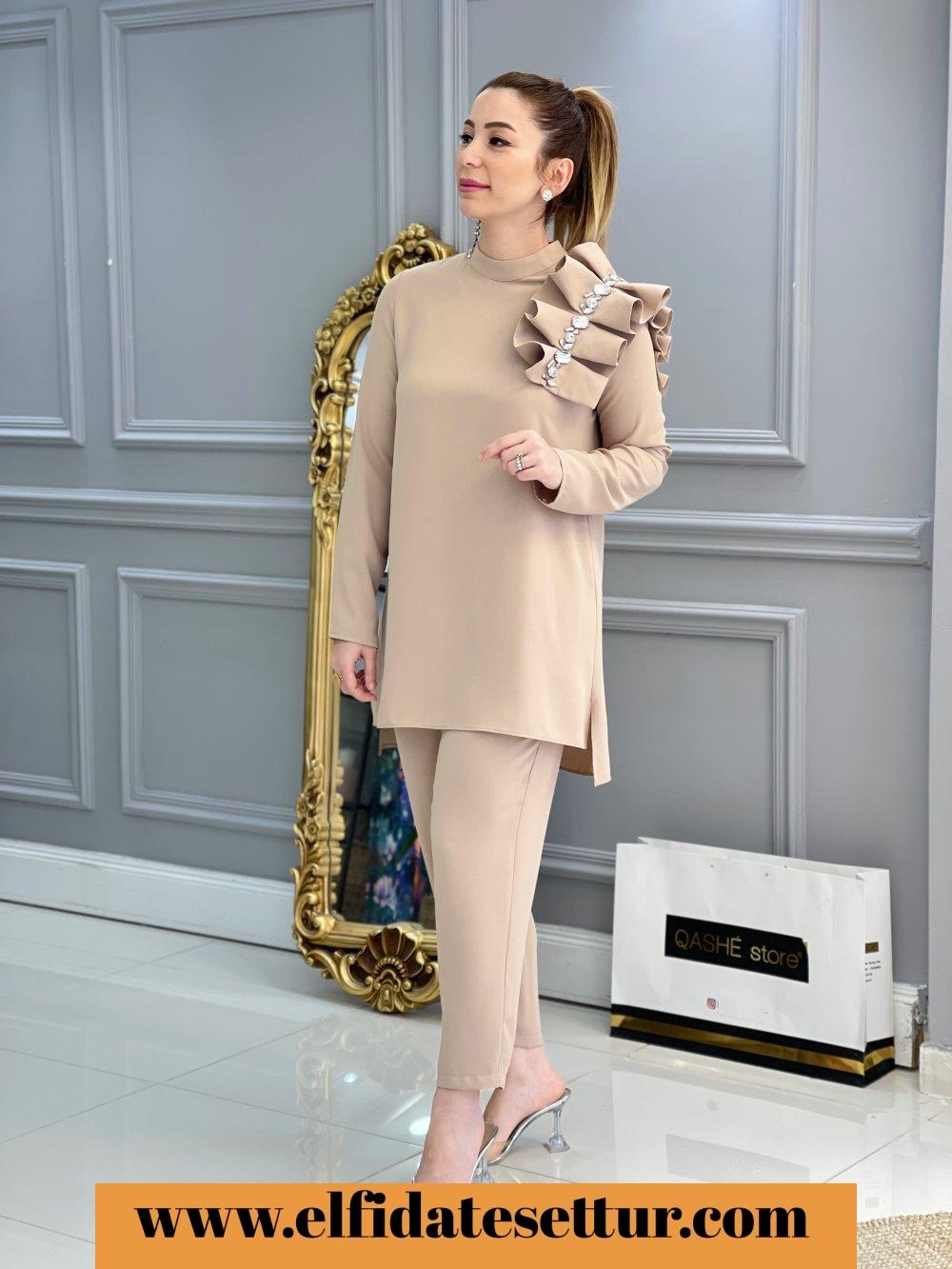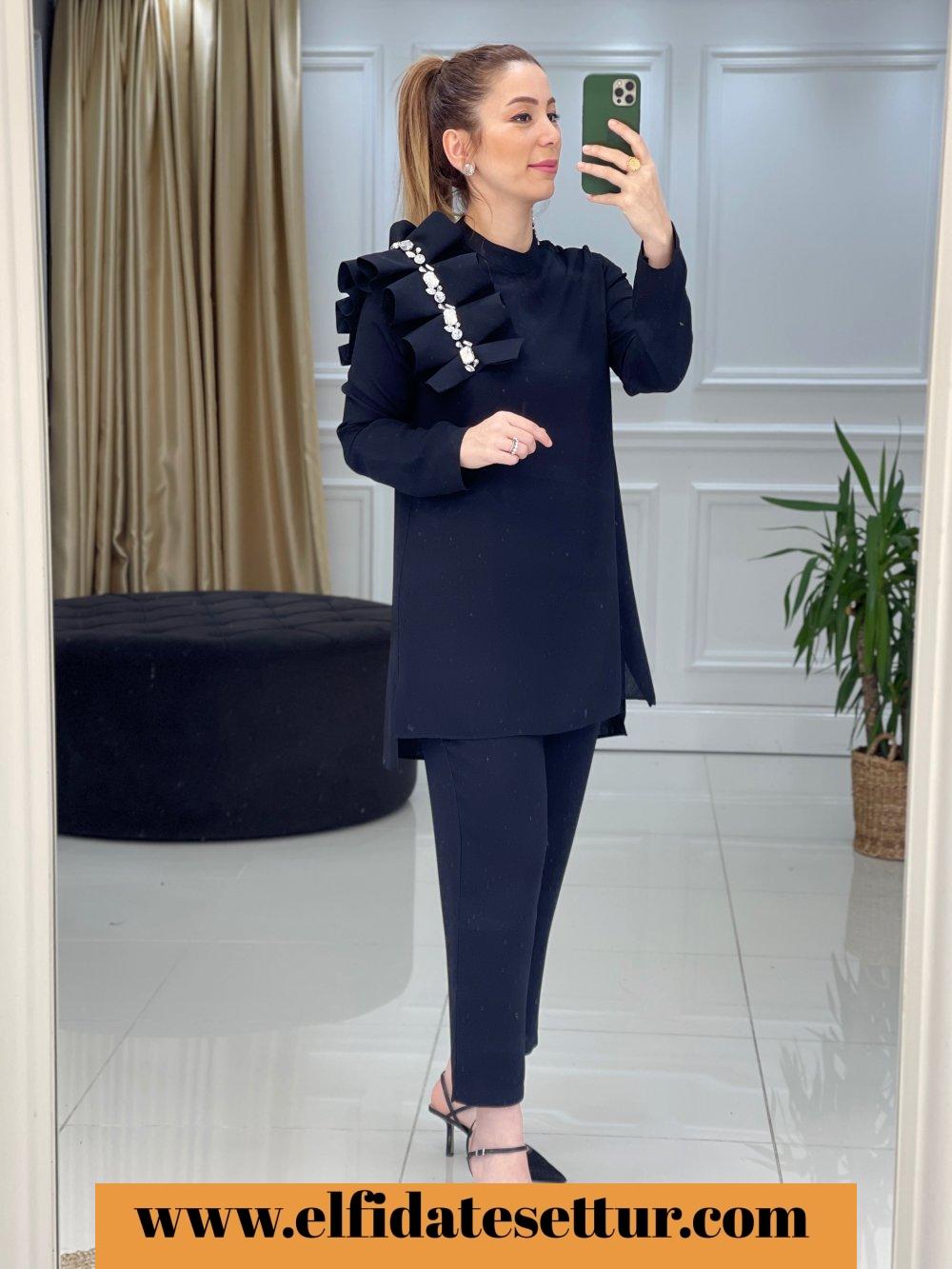 1. Sınıf İthal Krep Kumaştır. 36 Beden Ölçüleri: Tunik ön boy: 80 cm Tunik arka boy: 85 cm Göğüs: 94 cm Omuz: 38 cm Tunik omuz kısmı fırfır taş detaylıdır. Pantolon boy: 95 cm Beli yarım lastiklidir.