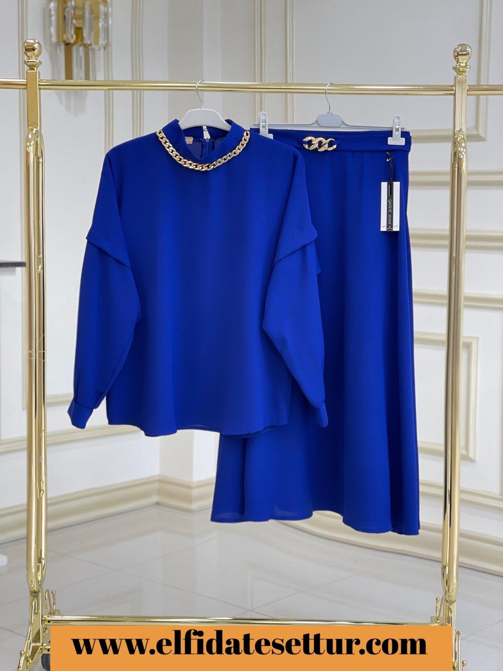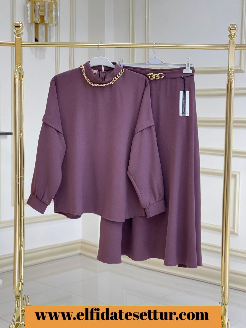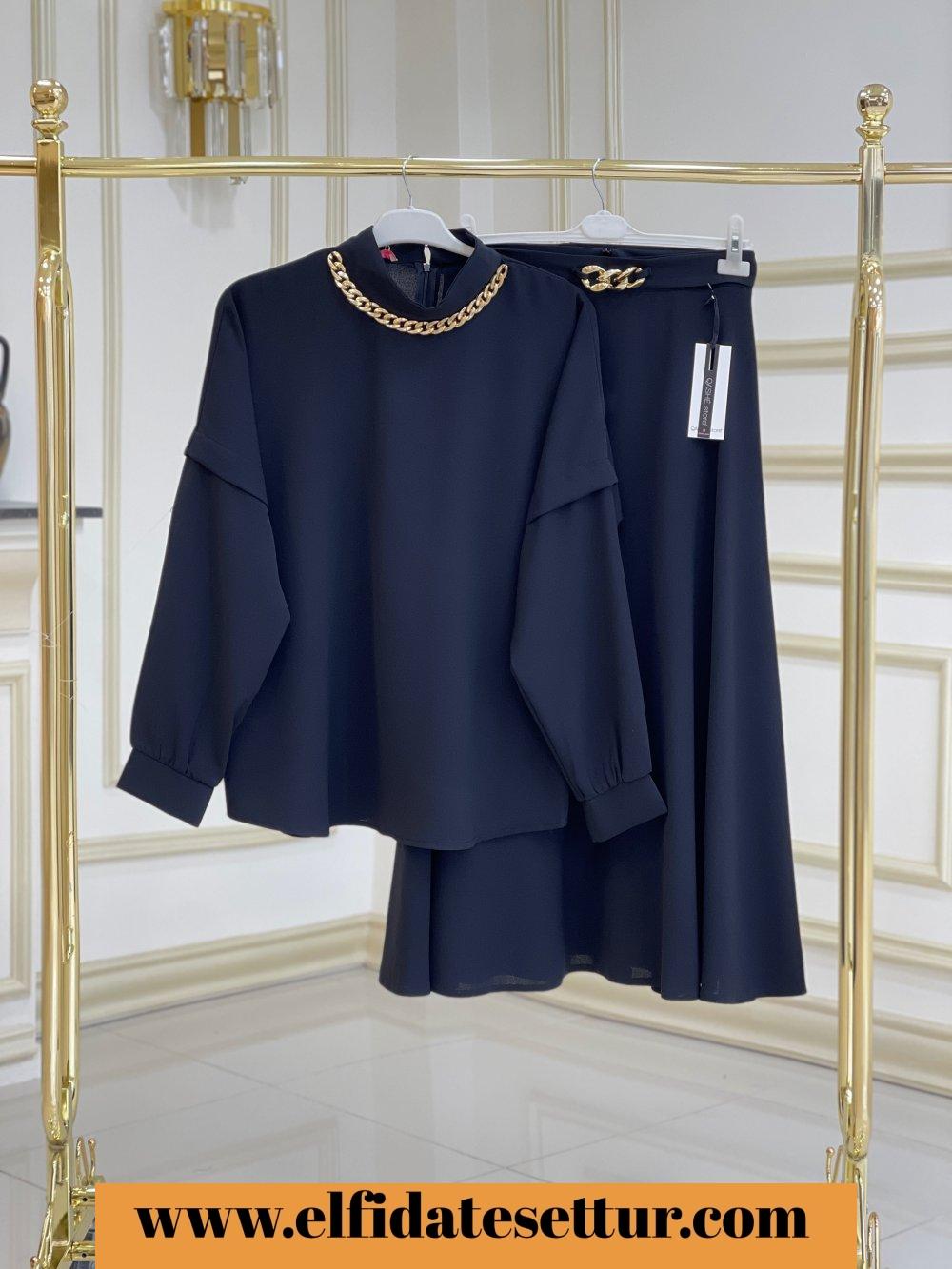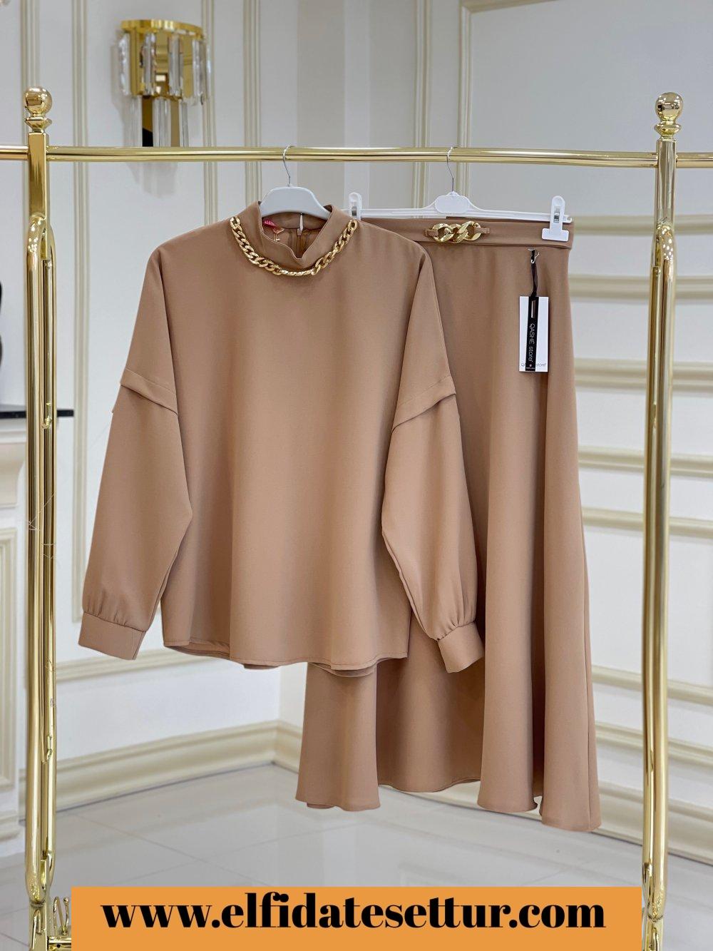 1. Sınıf İthal Krep Kumaştır. 38 Beden Ölçüsü: Tunik boy: 70 cm Etek boy: 95 cm Etek bel: 38 cm Yaka kısım ve etek bel kısmı zincir detaylıdır.