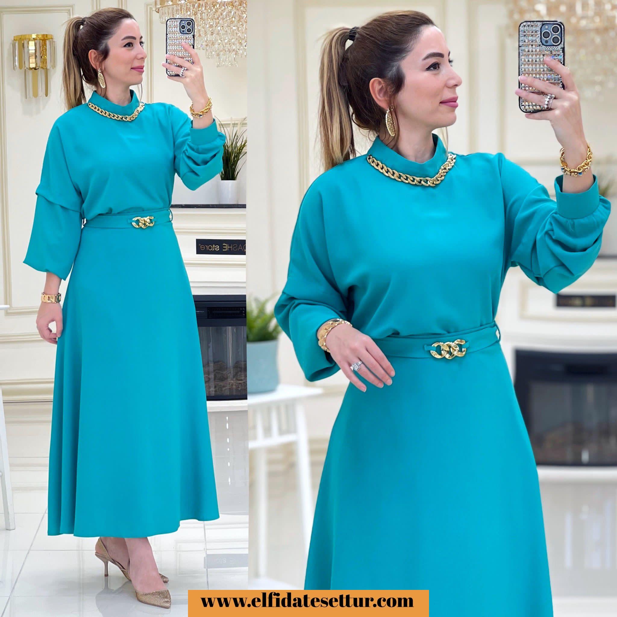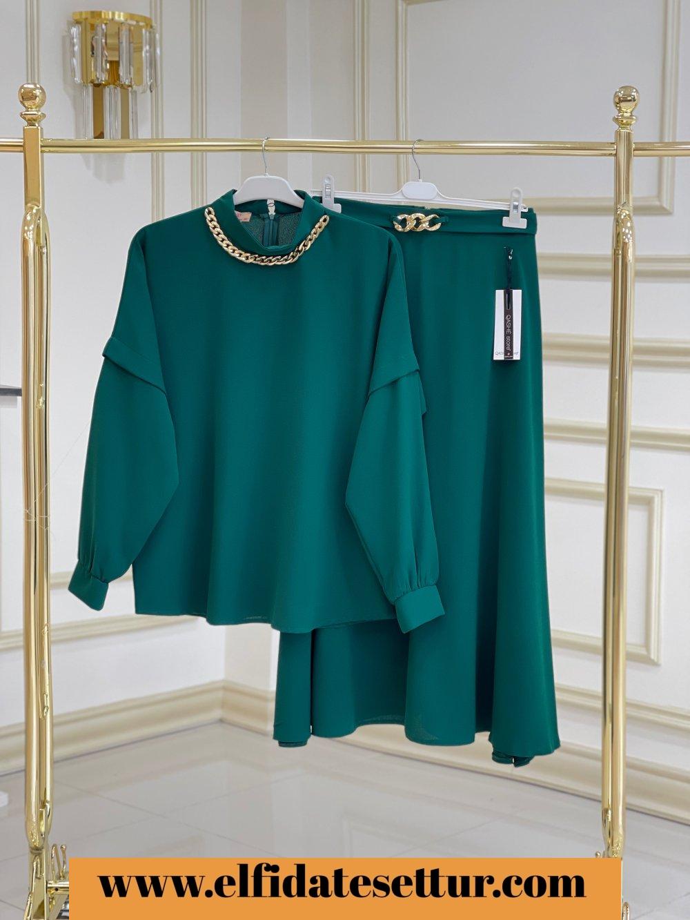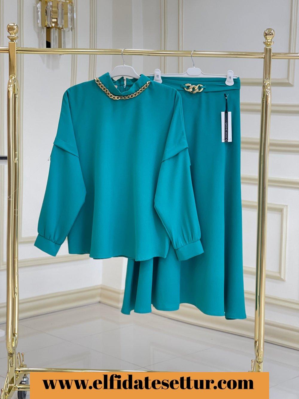 1. Sınıf İthal Krep Kumaştır. 38 Beden Ölçüsü: Tunik boy: 70 cm Etek boy: 95 cm Etek bel: 38 cm Yaka kısım ve etek bel kısmı zincir detaylıdır.