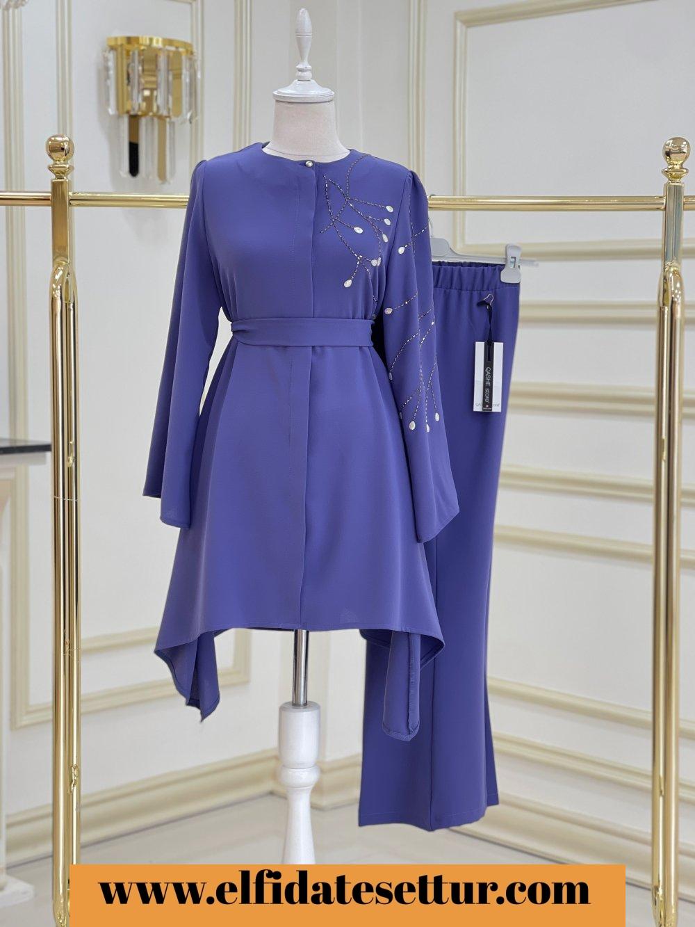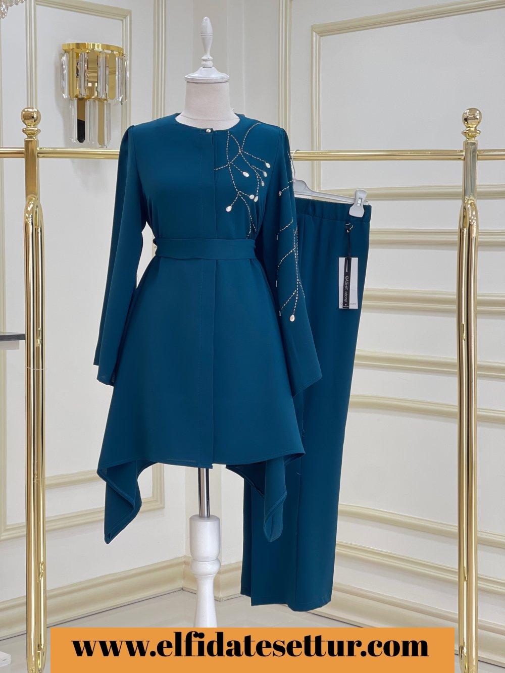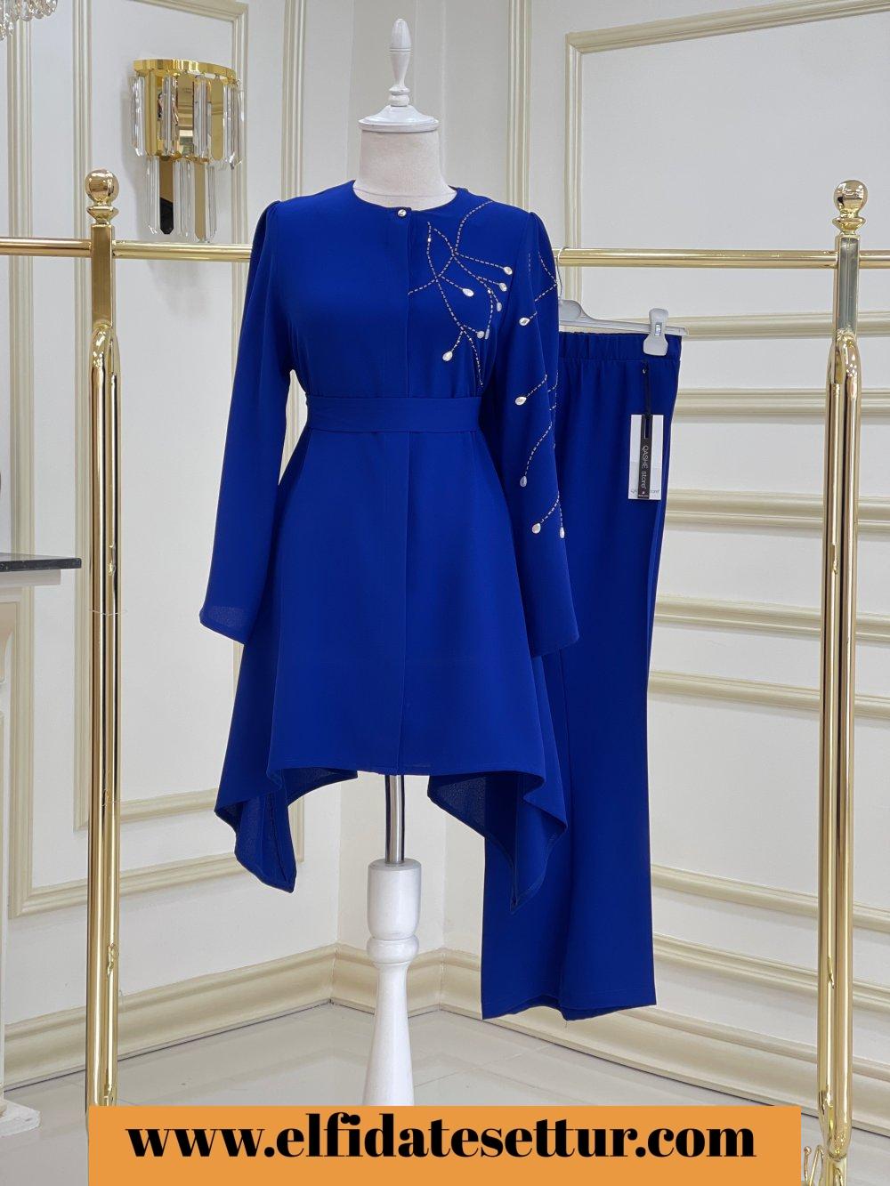 1. Sınıf İthal Krep Kumaştır. 38 Beden Ölçüsü: Tunik ön boy: 85 cm Tunik yan boy: 100 cm Göğüs: 114 cm Omuz: 38 cm Tunik boydan düğme detaylıdır. Tunik taş detaylıdır. Pantolon boy: 95 cm Pantolon beli lastiklidir.