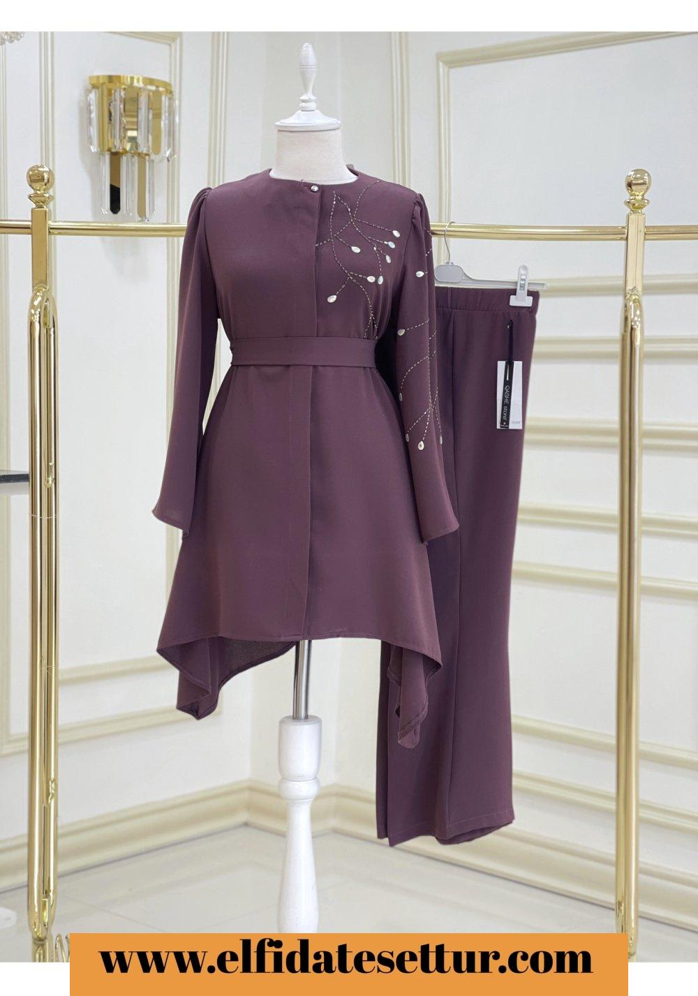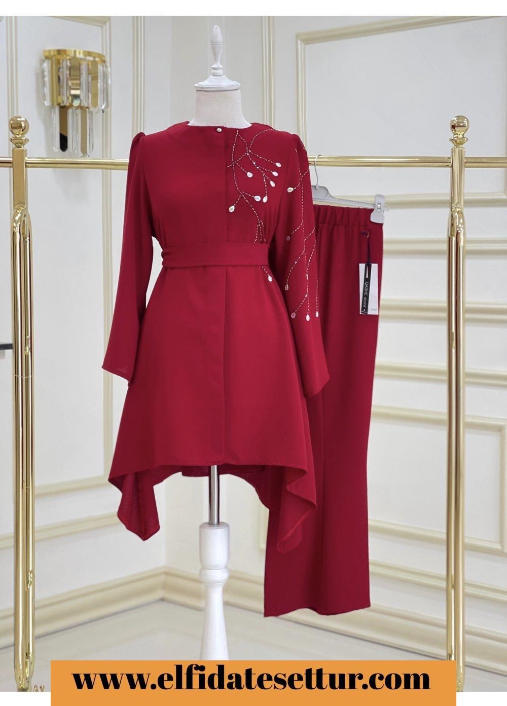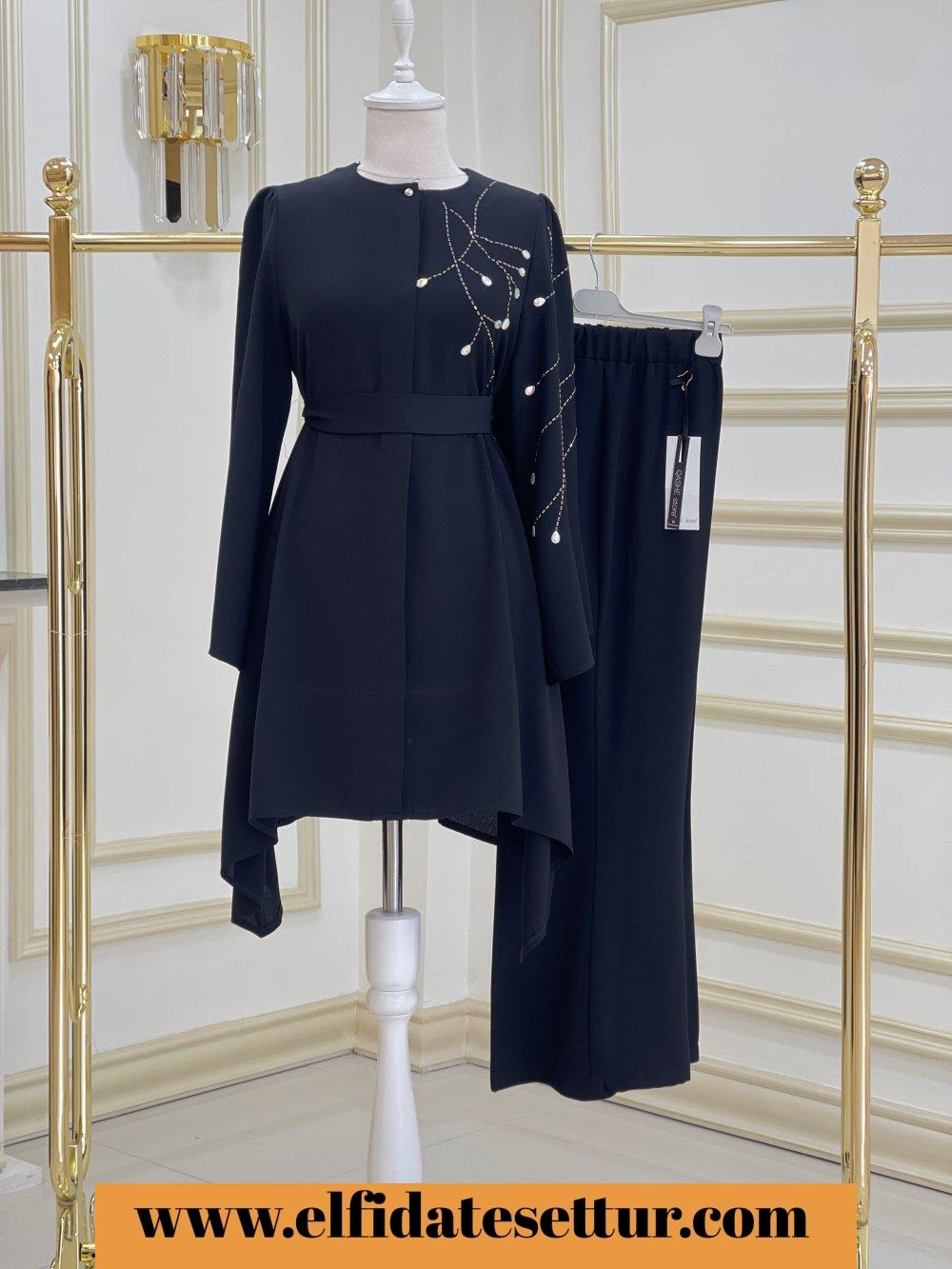 1. Sınıf İthal Krep Kumaştır. 38 Beden Ölçüsü: Tunik ön boy: 85 cm Tunik yan boy: 100 cm Göğüs: 114 cm Omuz: 38 cm Tunik boydan düğme detaylıdır. Tunik taş detaylıdır. Pantolon boy: 95 cm Pantolon beli lastiklidir.