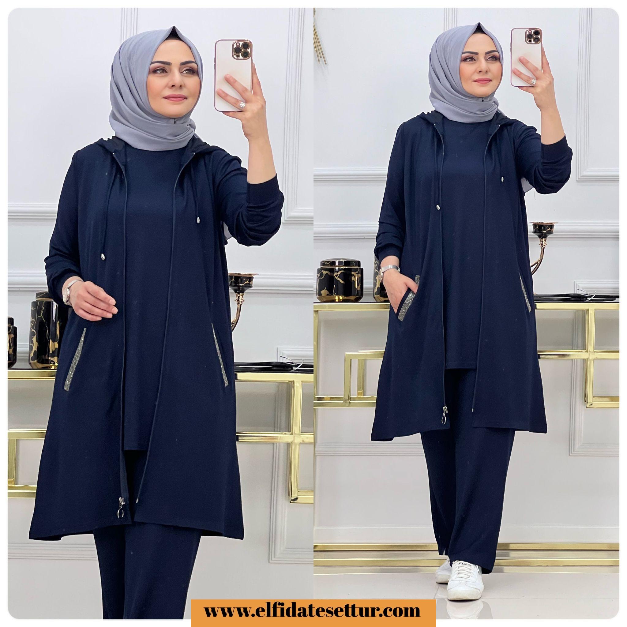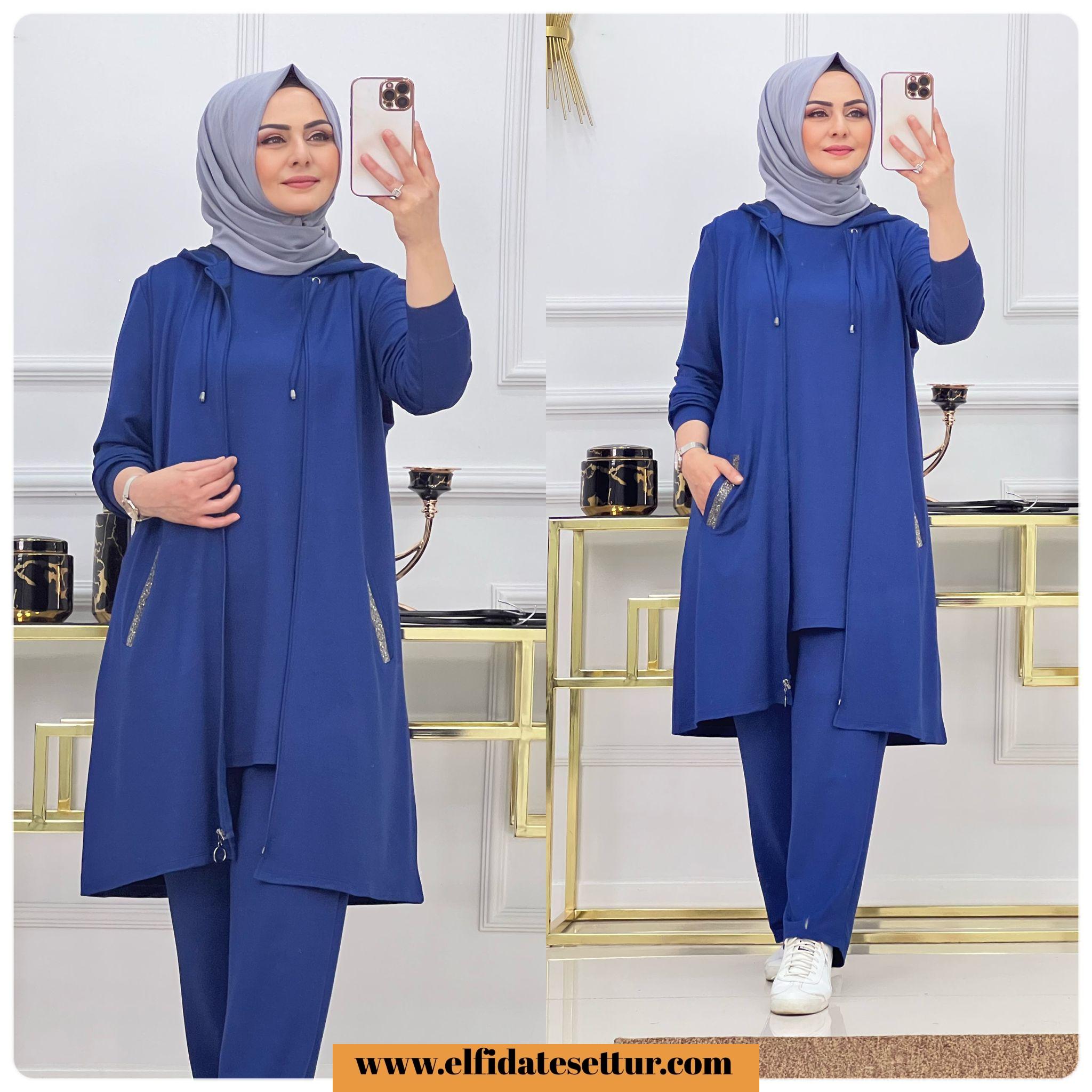 Uzun kollu içlik- kapşonlu yelek ve pantolon olarak üç parçadan oluşmaktadır
