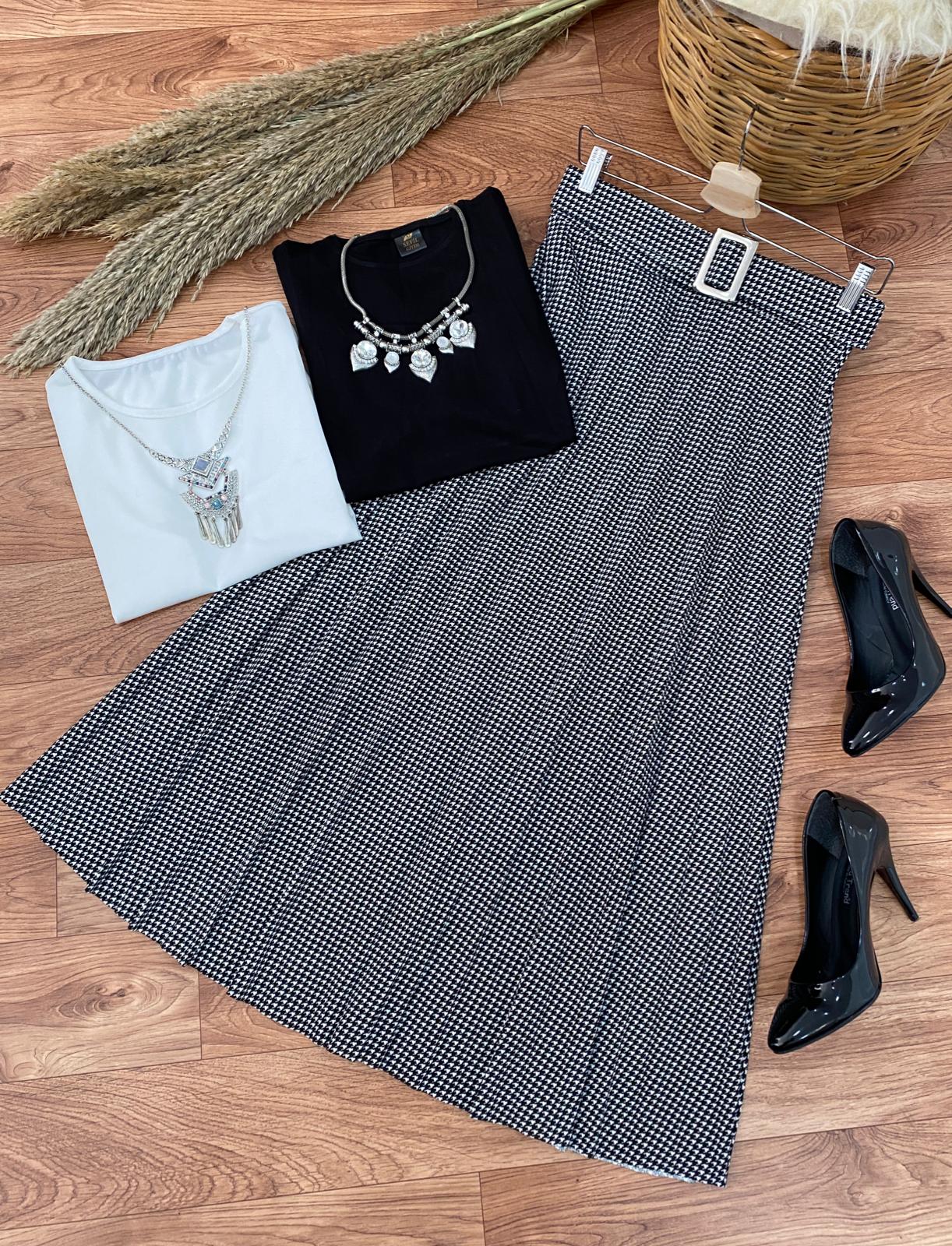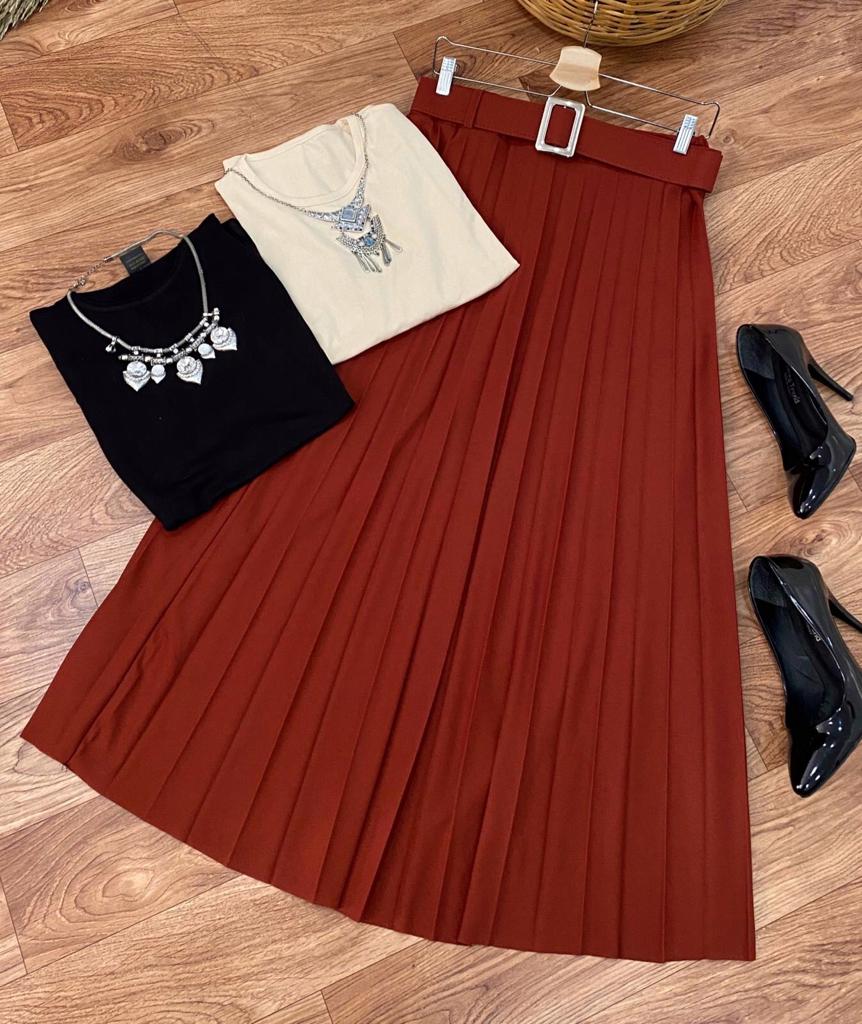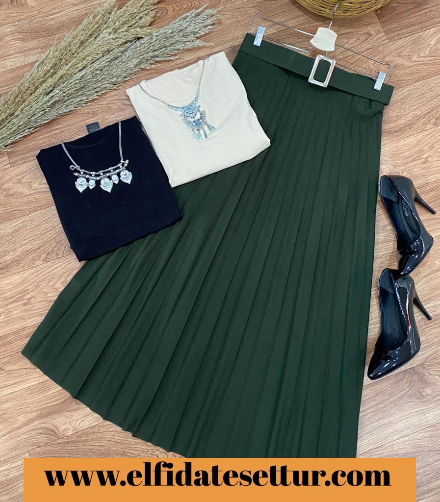 Etek ; beli lastikli, kemerli, piliseli krep kumaş