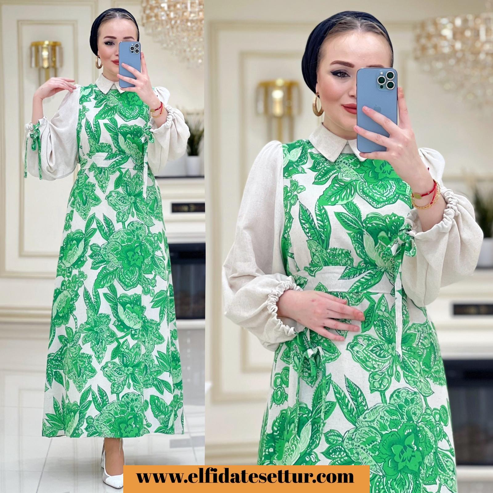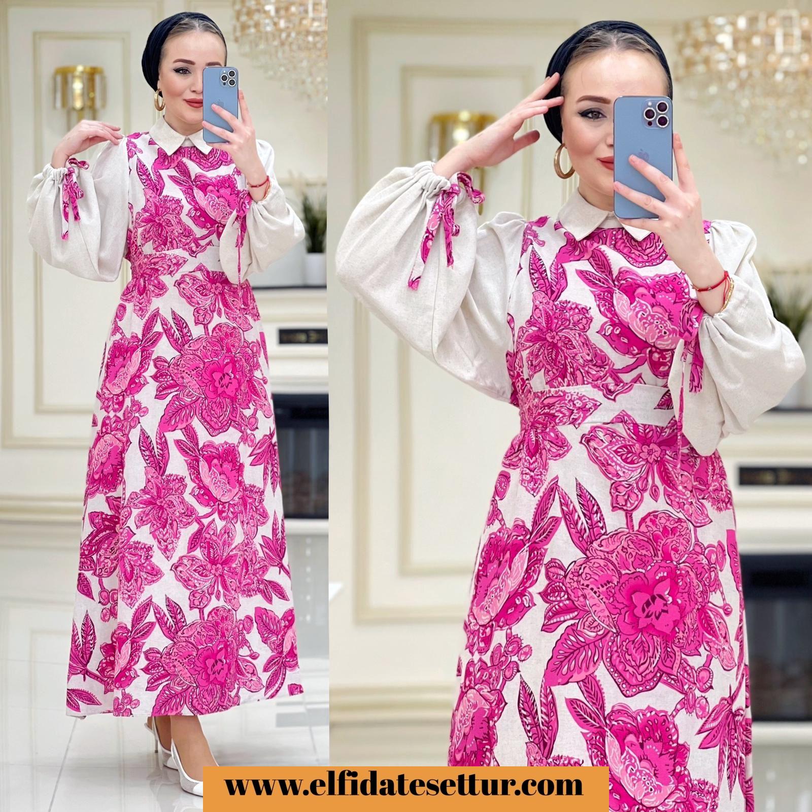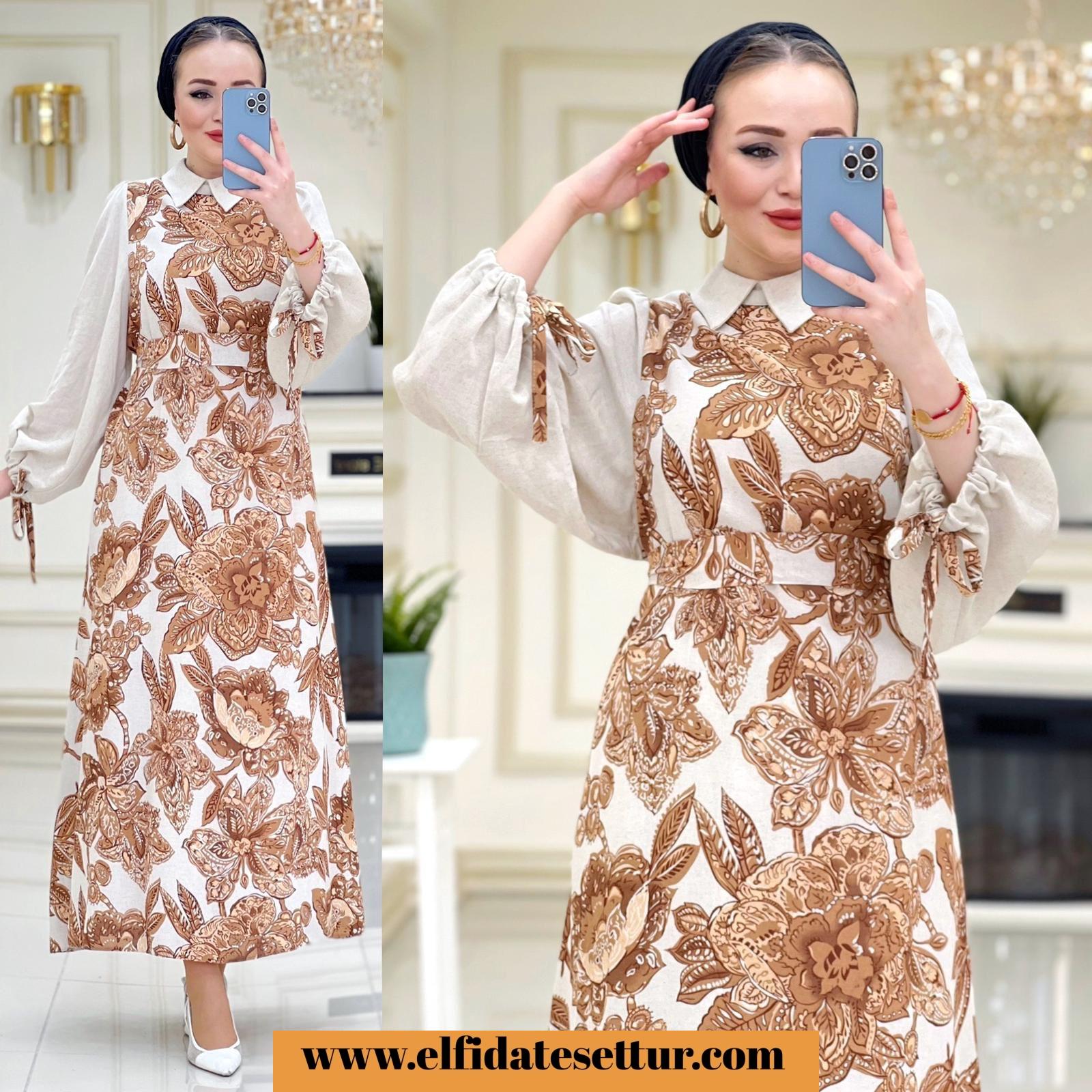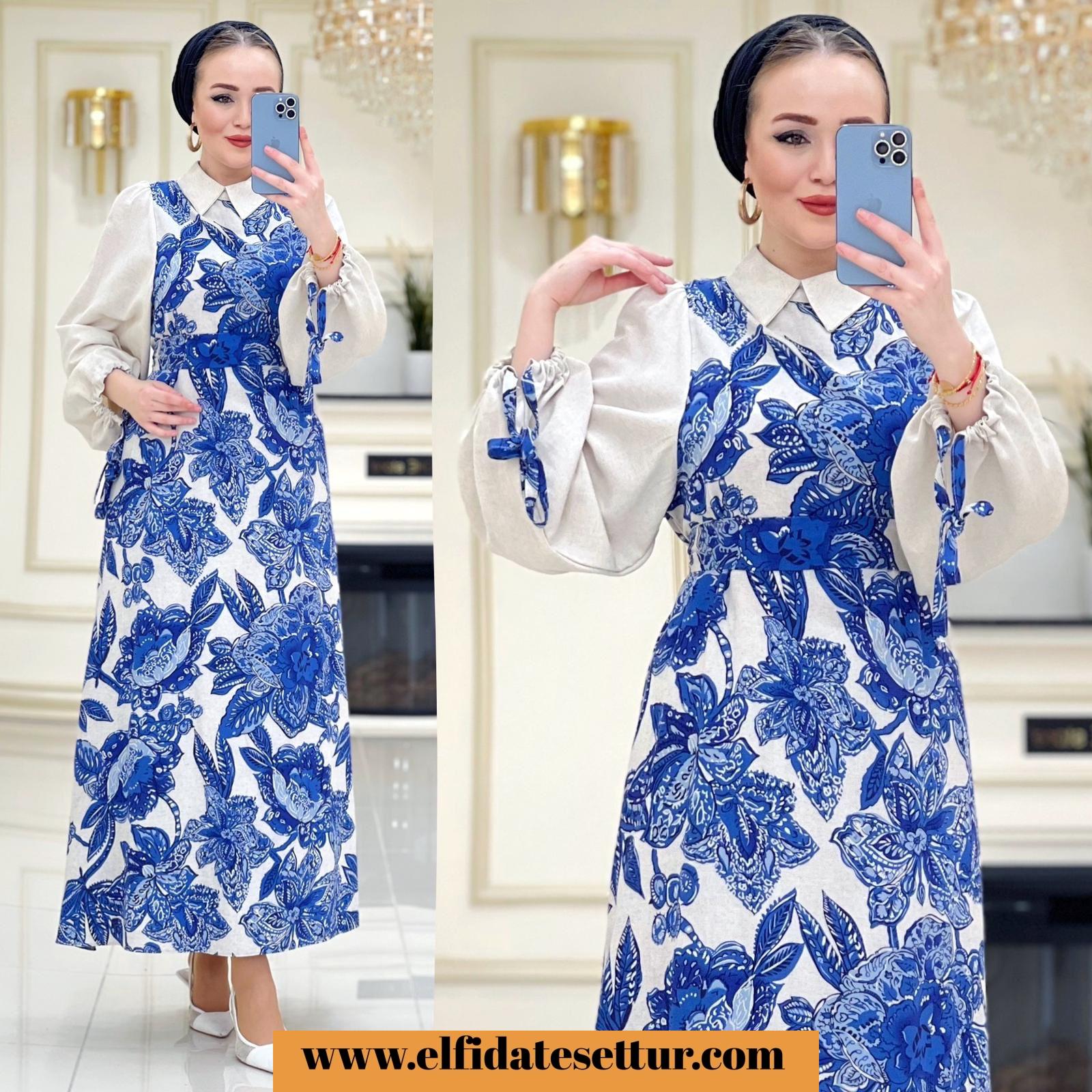 1. Sınıf Baskılı Keten Kumaştır. 1 Beden Ölçüsü: Elbise boy: 140 cm Göğüs: 114 cm Omuz: 35 cm Elbise seyyar kuşaklıdır. Elbise arkadan fermuarlıdır.