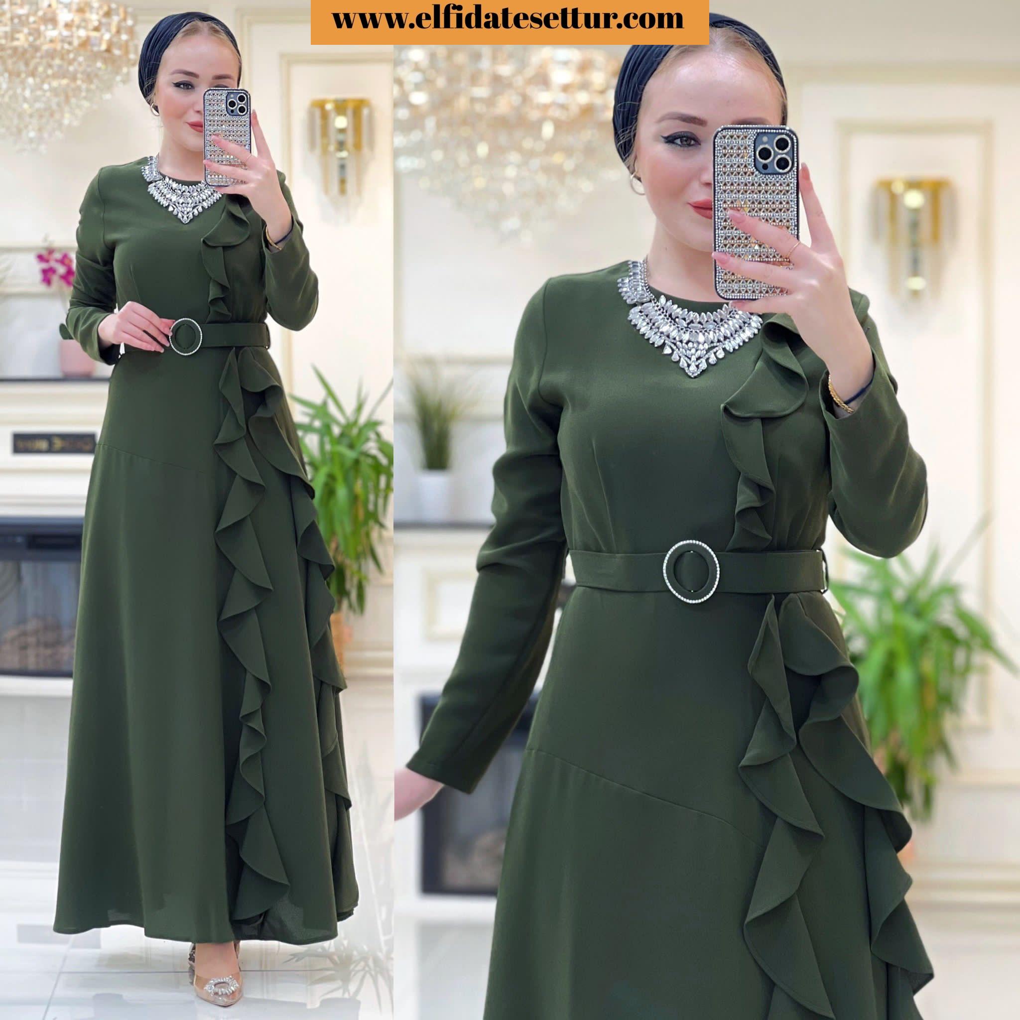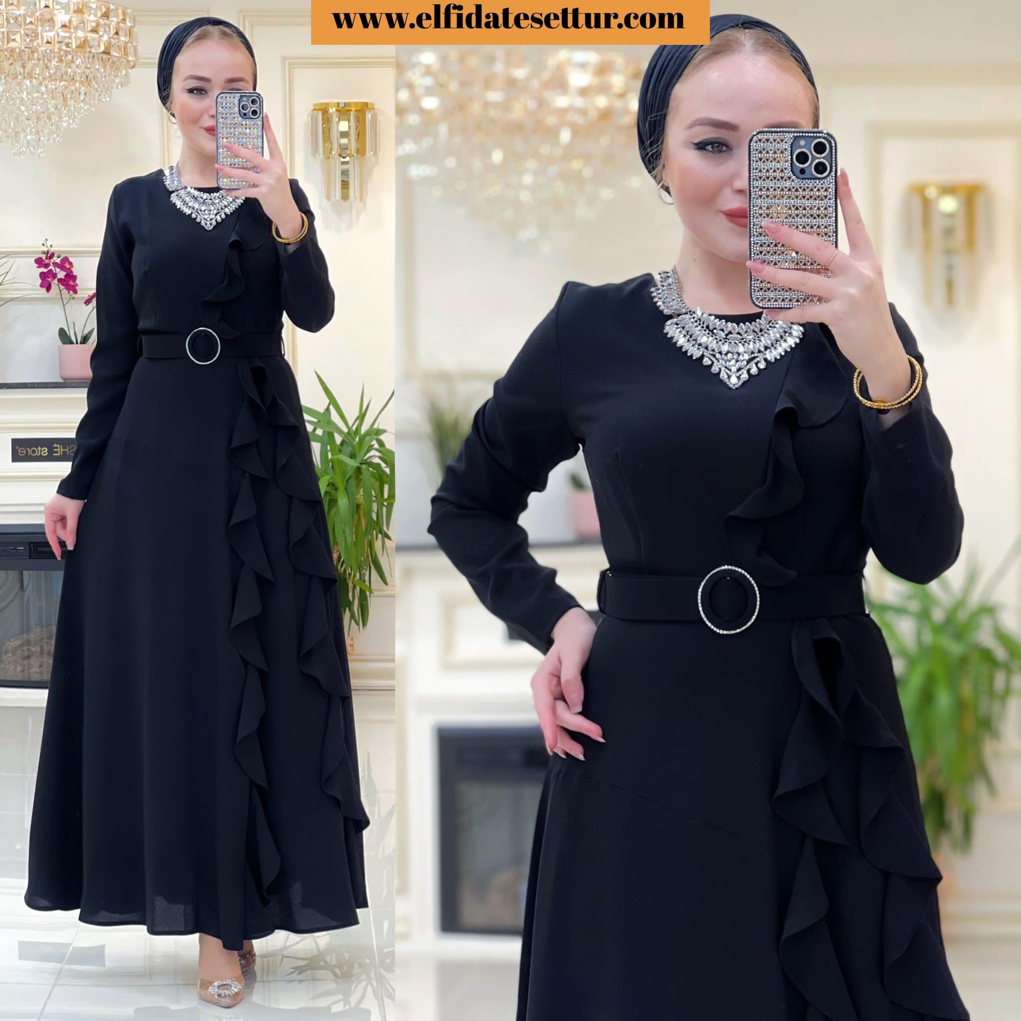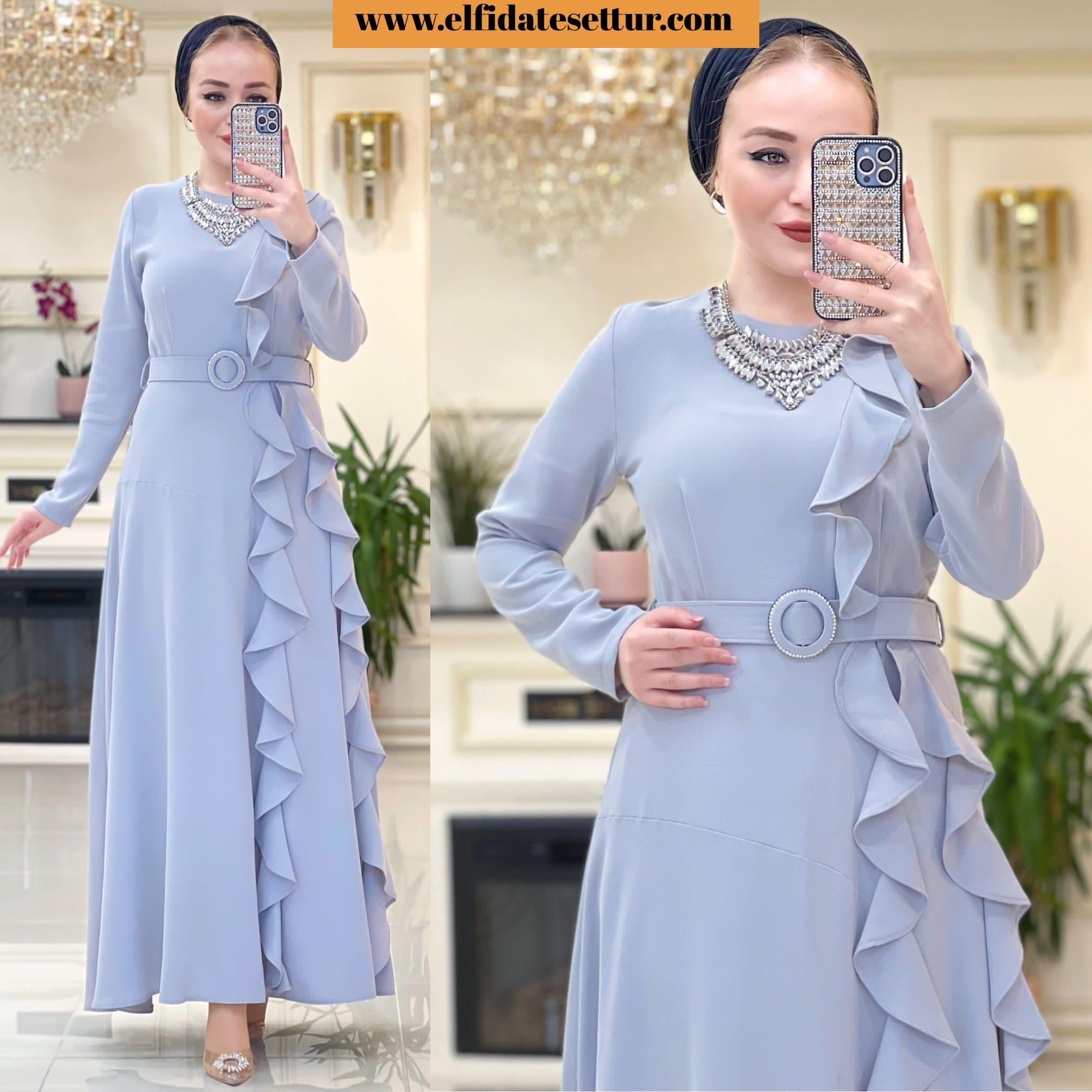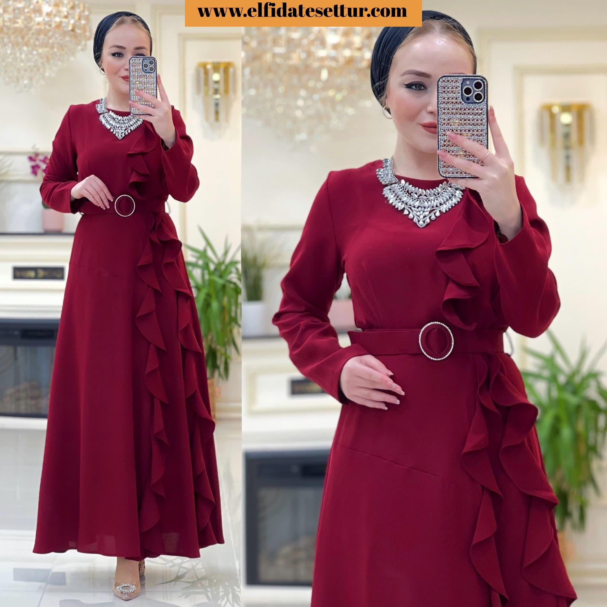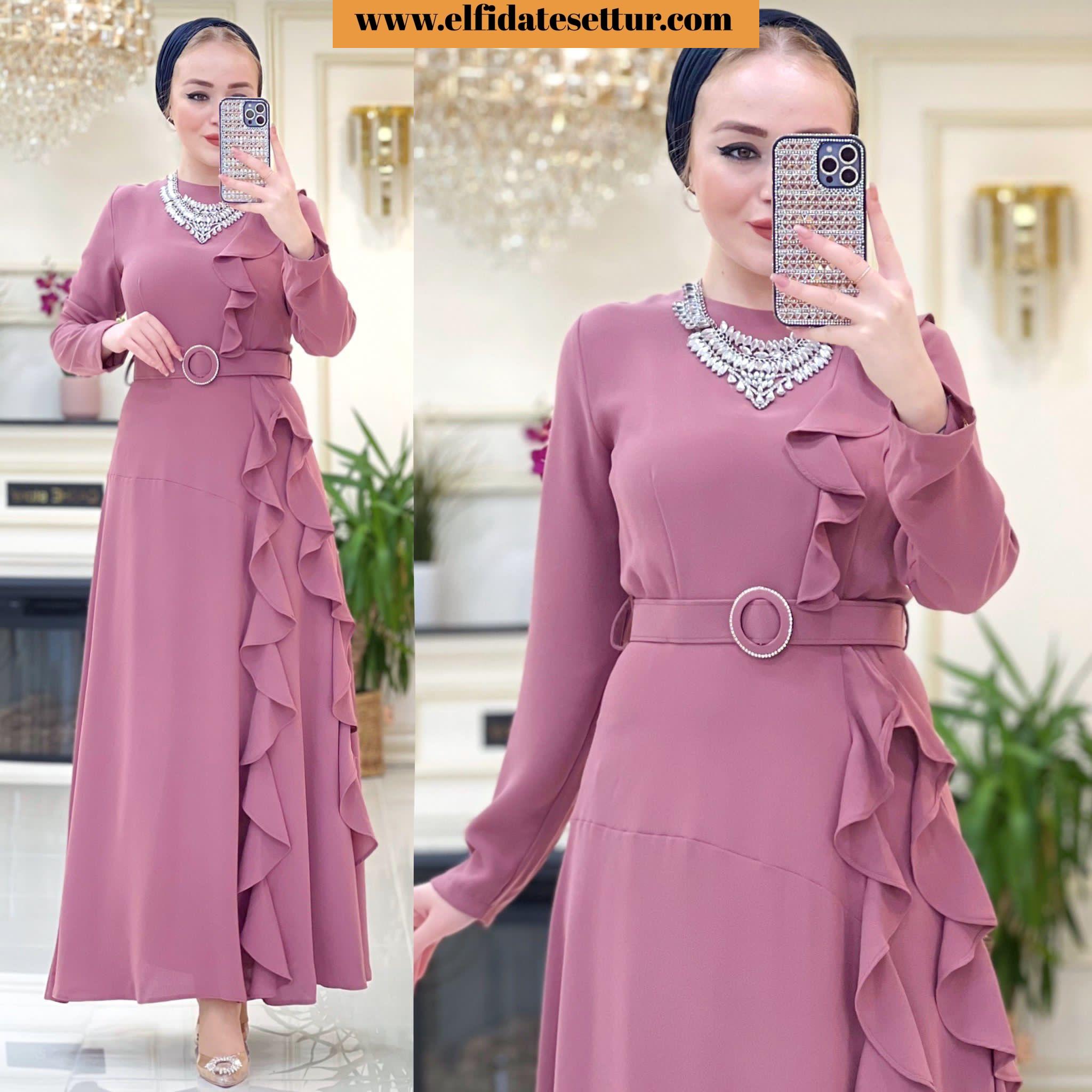1. Sınıf İthal Krep Kumaştır. 38 Beden Ölçüsü: Elbise boy: 145 cm Göğüs: 96 cm Omuz: 38 cm Elbise yanı fırfır detaylıdır. Elbise tokalı seyyar kemerlidir.