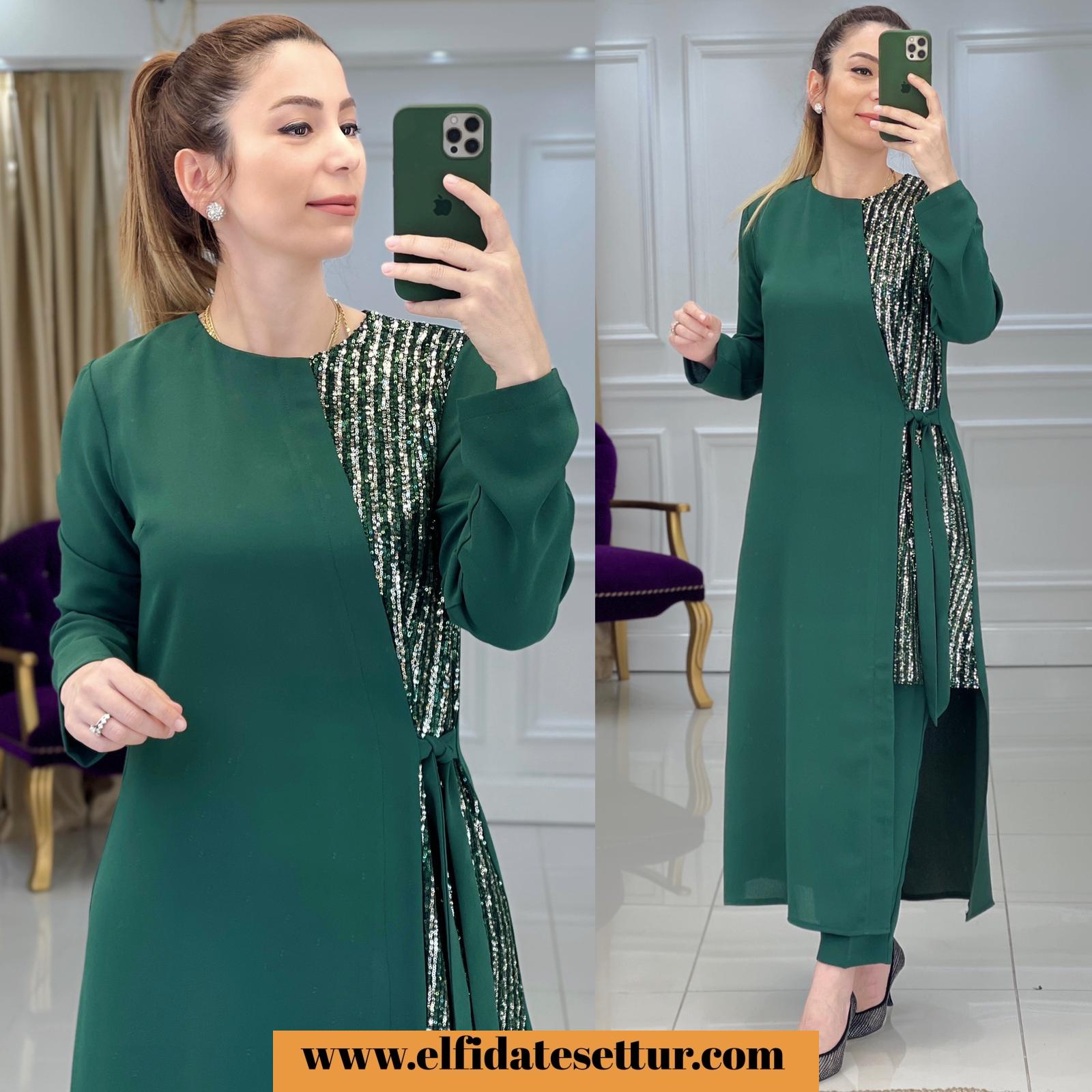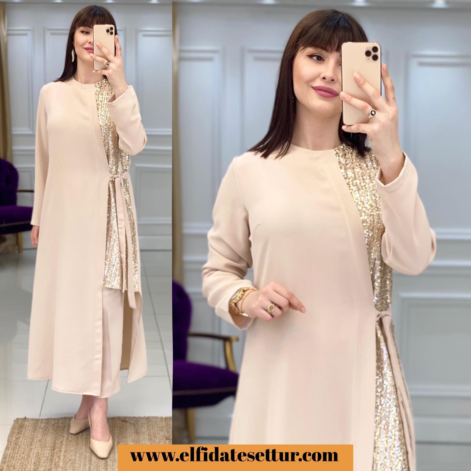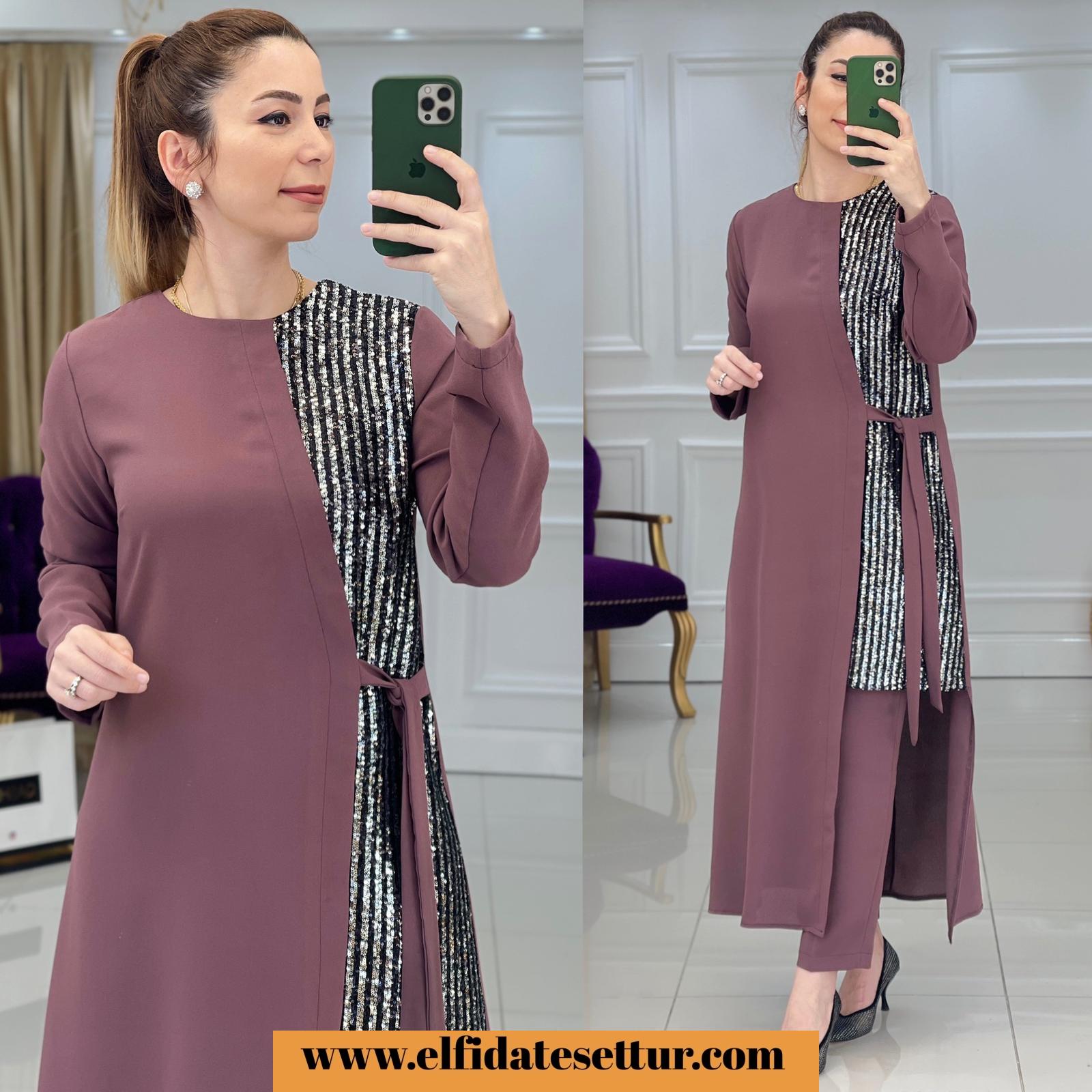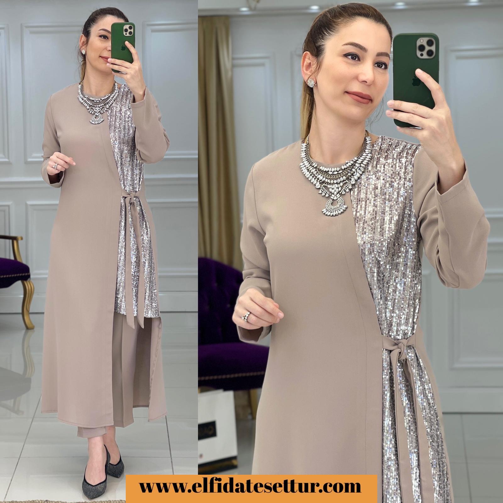 Ürün bilgileri: Takımımız 1. Kalite İthal Krep kumaştır. Ürün sağ yanında pul payet detayı vardır. Pantolon beli lastiklidir.