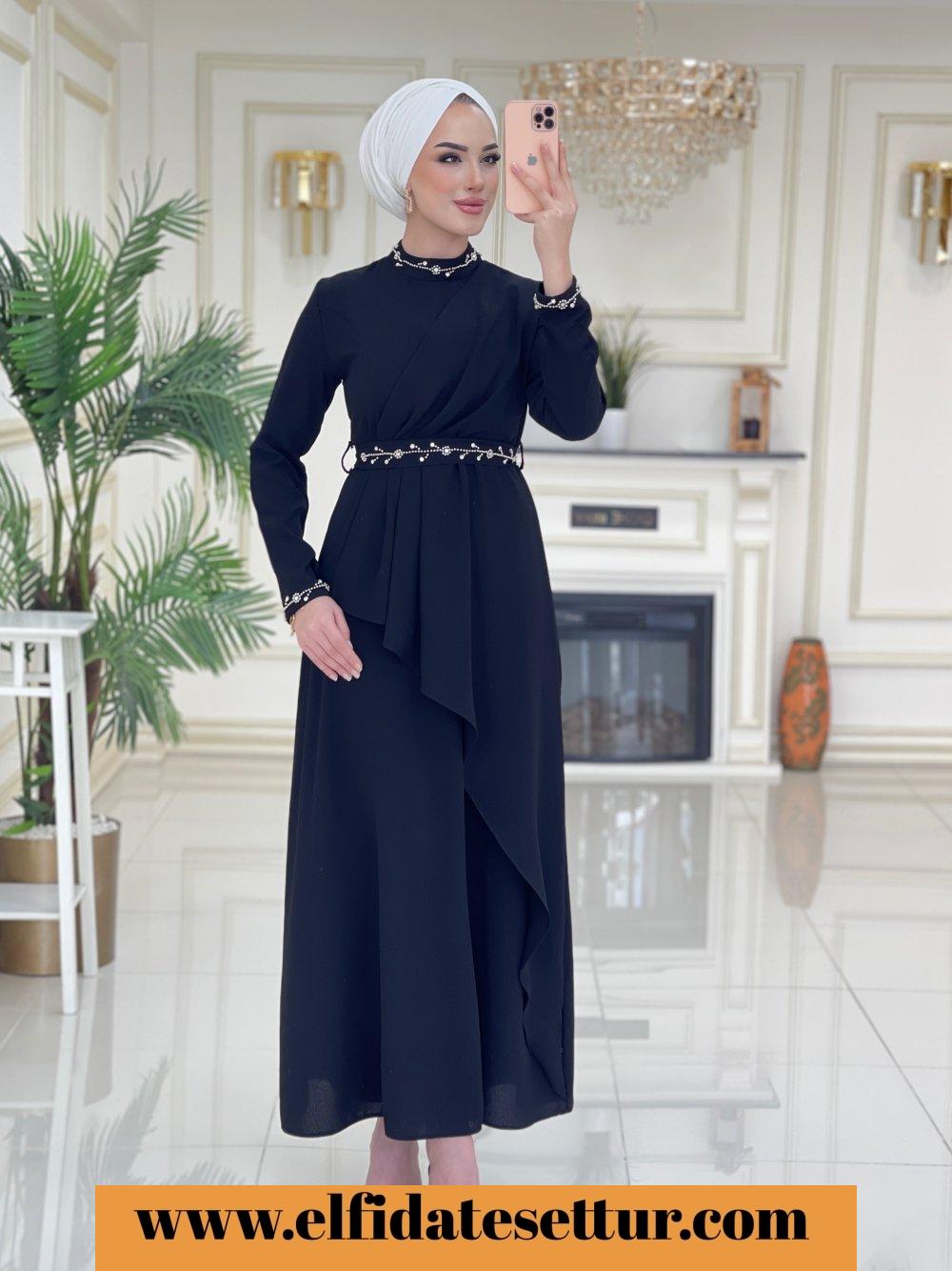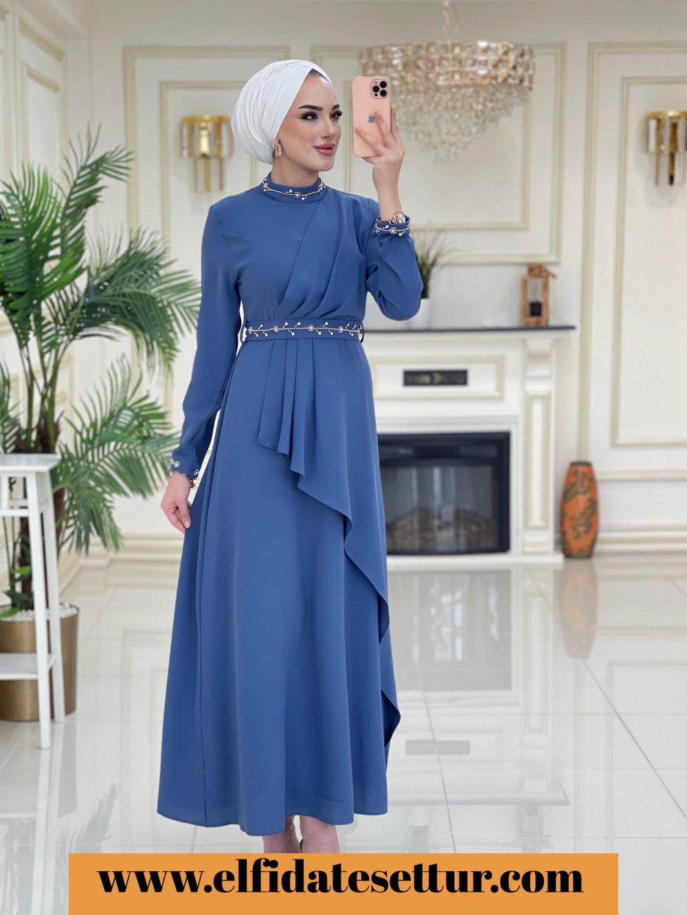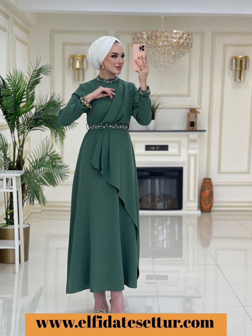 1. Sınıf Krep Kumaştır. 38 Beden Ölçüsü: Elbise boy: 143 cm Göğüs: 104 cm Omuz: 38 cm Elbise taşlı seyyar kuşaklıdır. Elbise yaka kısmı ve kol uçları taş detaylıdır.