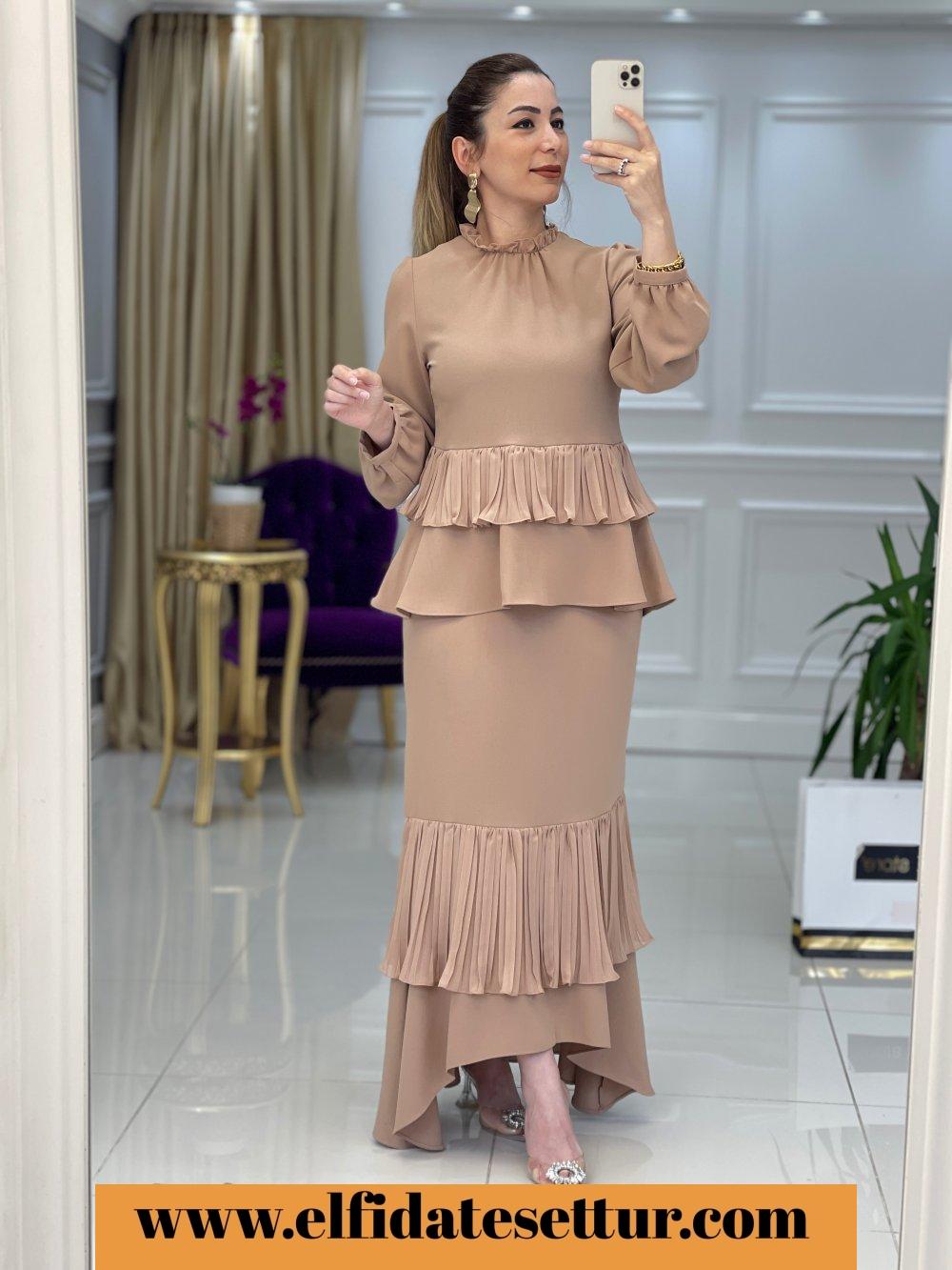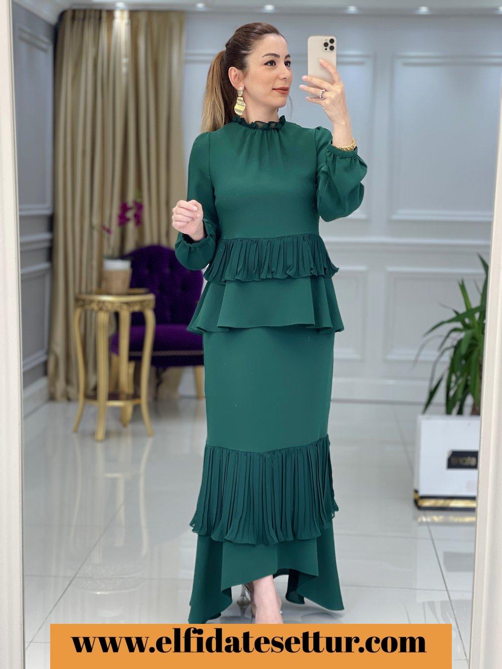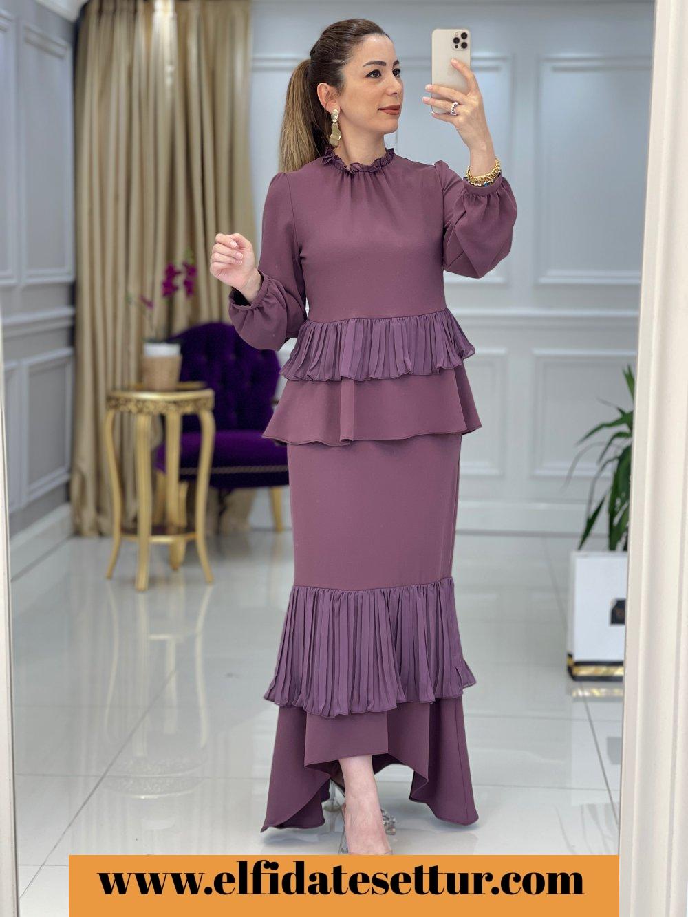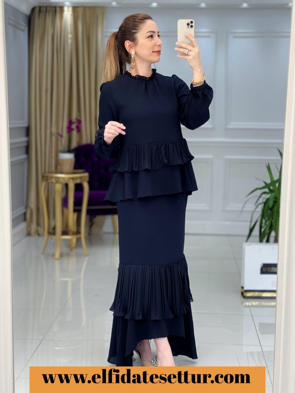 Ürün bilgileri: Birinci sınıf İthal Krep kumaştır. Bluz kat kat detaylıdır. Yaka buluz kat detayı ve etek kat detayı pilisedir. Bluz kol uçları lastiklidir.