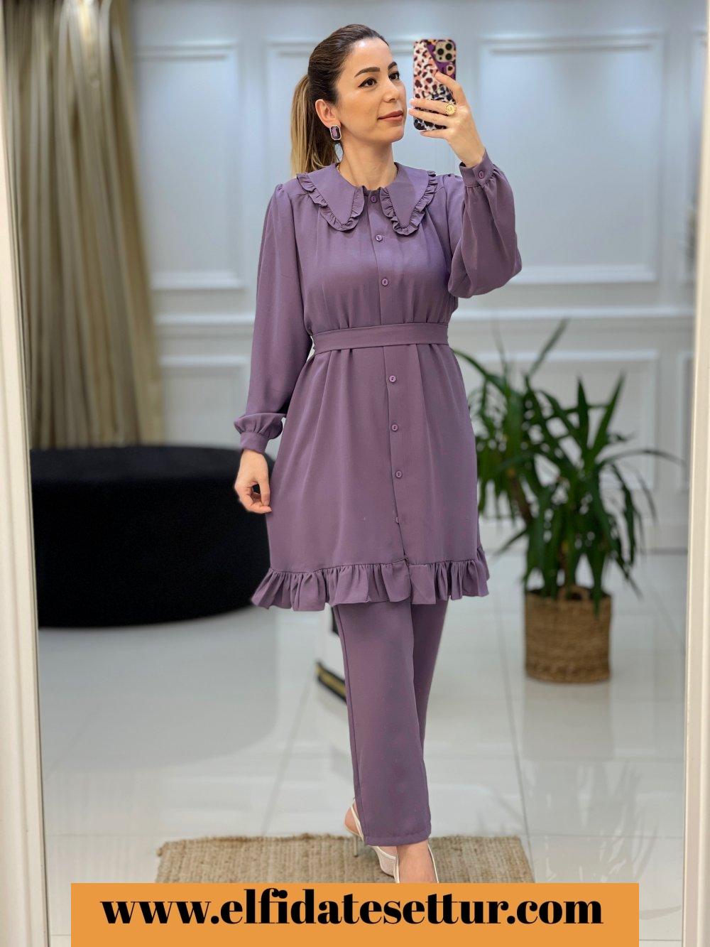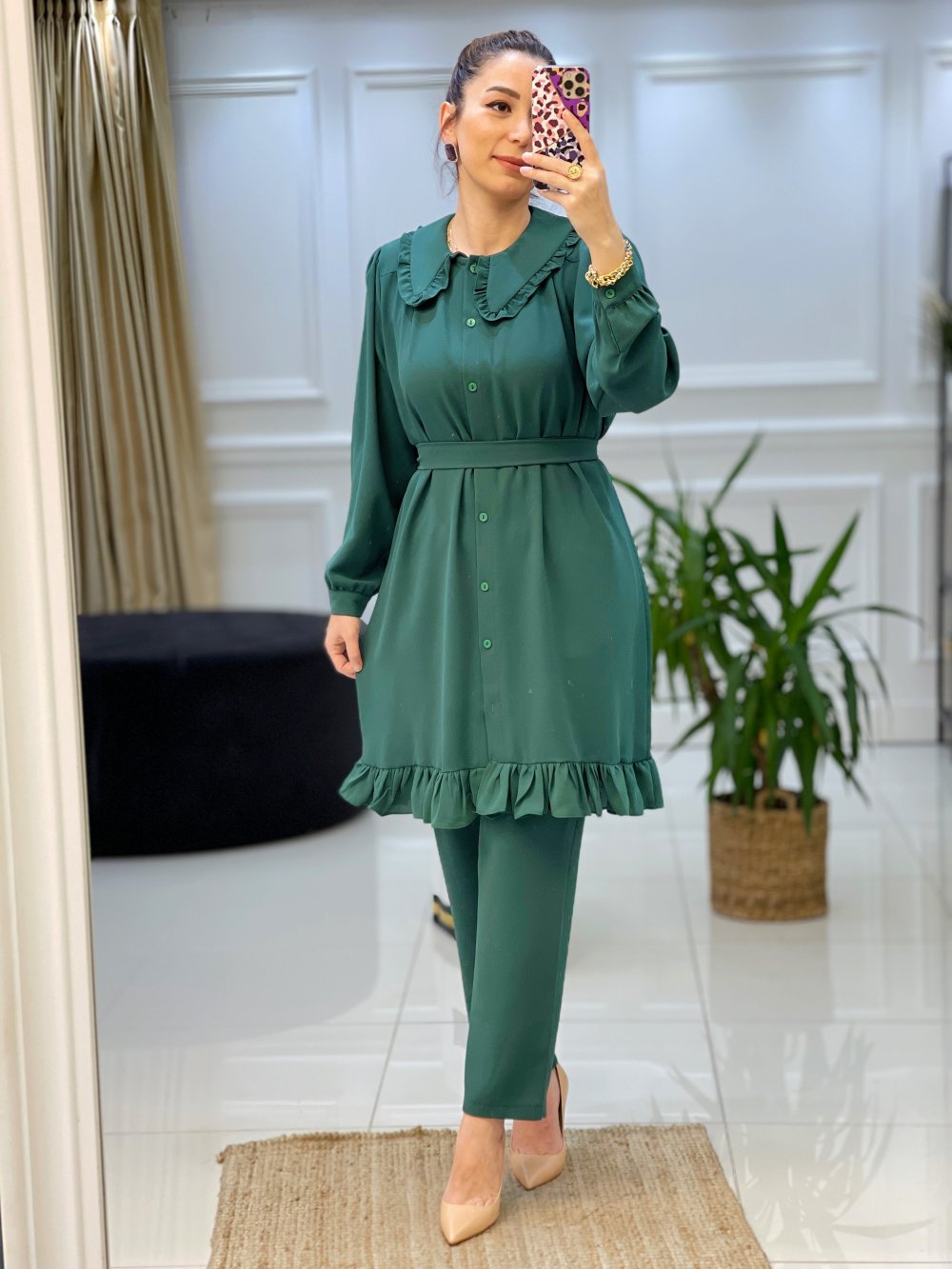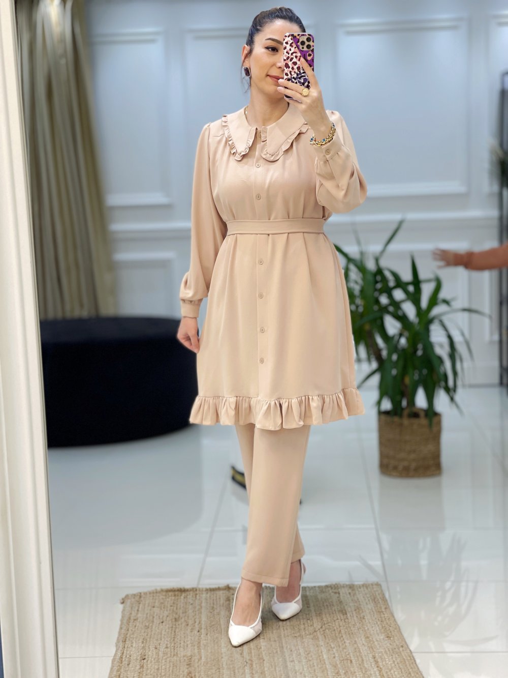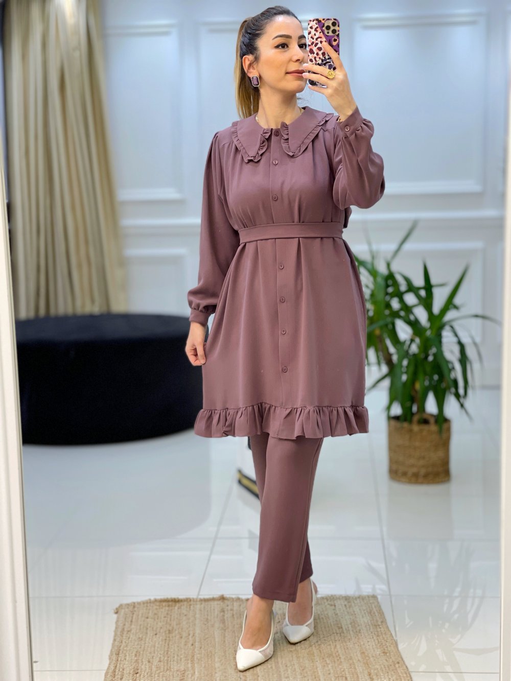 1 Beden Küçük Tercih Edebilirsiniz. Yaka kısmı ve tunik uçları fırfır detaylıdır. Seyyar kemerlidir. Tunik boydan boya düğmelidir. Salaş kesimdir. Pantolon beli lastiklidir. 1 beden Ürün Bilgileri; Boy: 93cm Göğüs: 137cm Omuz: 39cm Pantolon Boy: 95cm