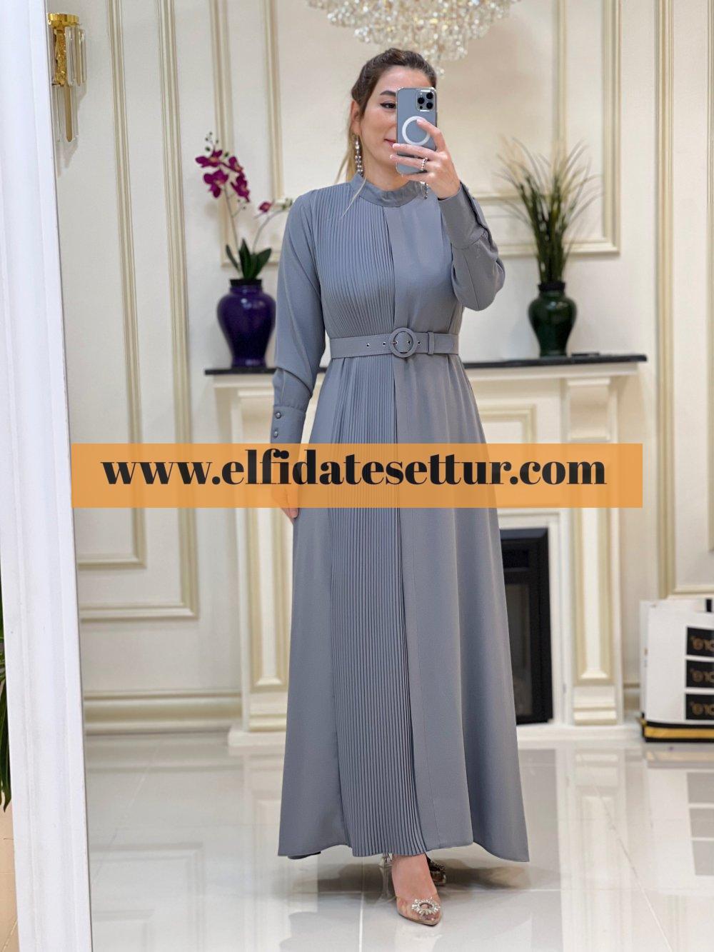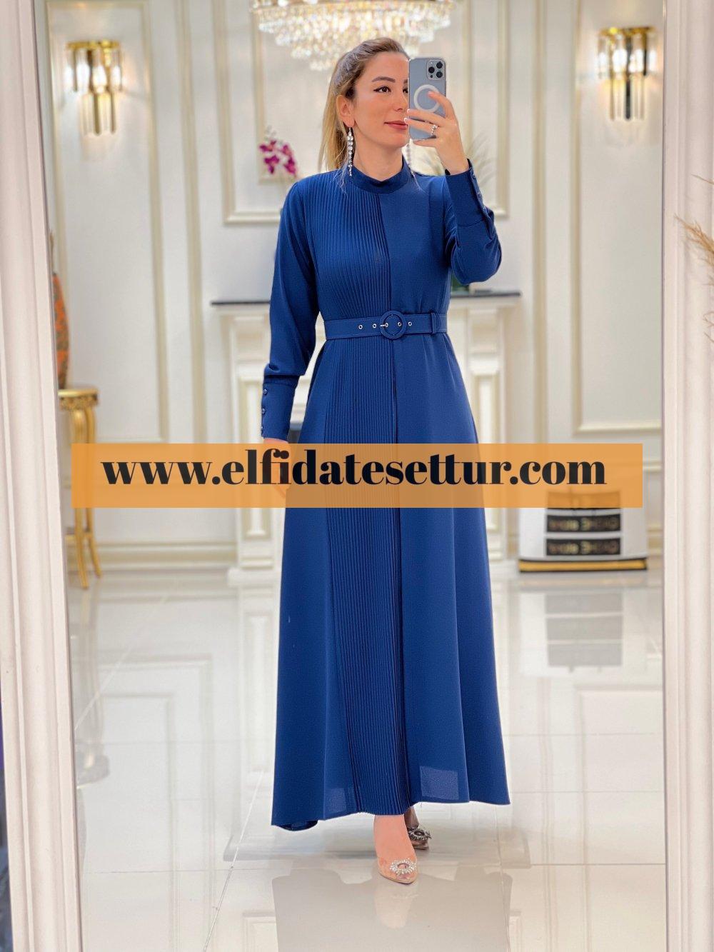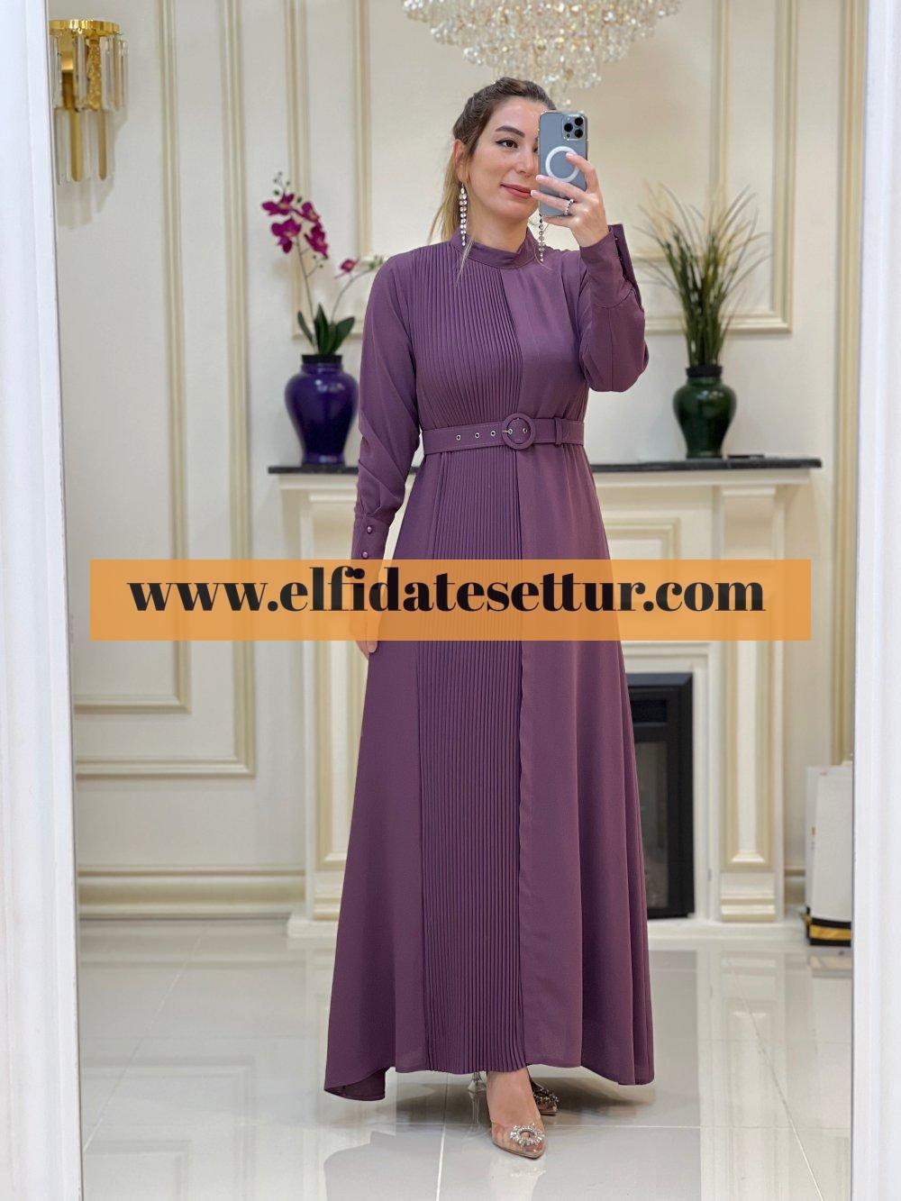 1. Sınıf İthal Krep Kumaştır. 38 Beden Ölçüsü: Elbise boy: 145 cm Göğüs: 100 cm Omuz:36 cm Elbise bir kenarı pilise detaylıdır. Elbise seyyar kemerlidir. Elbise arkadan fermuarlıdır.
