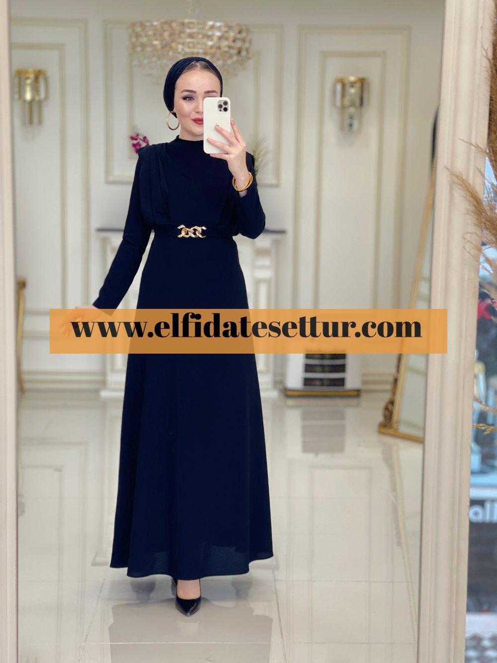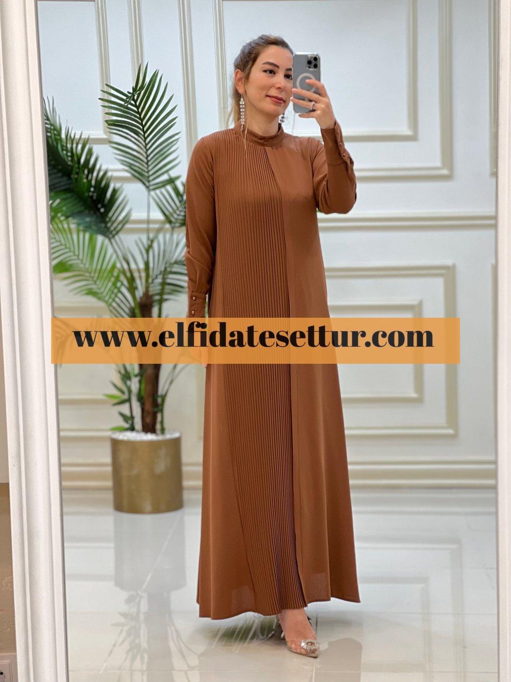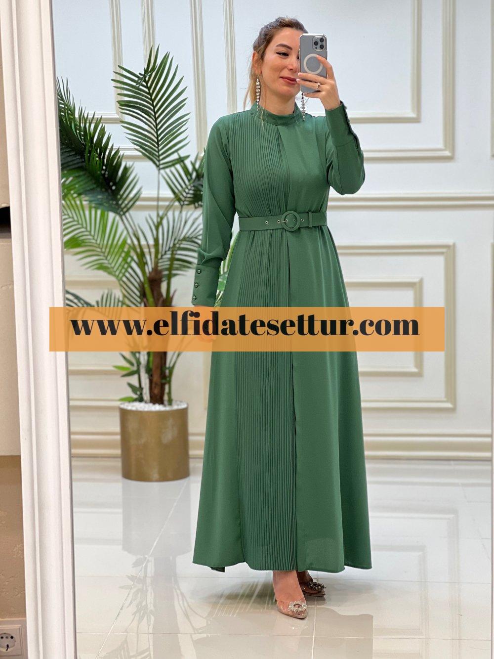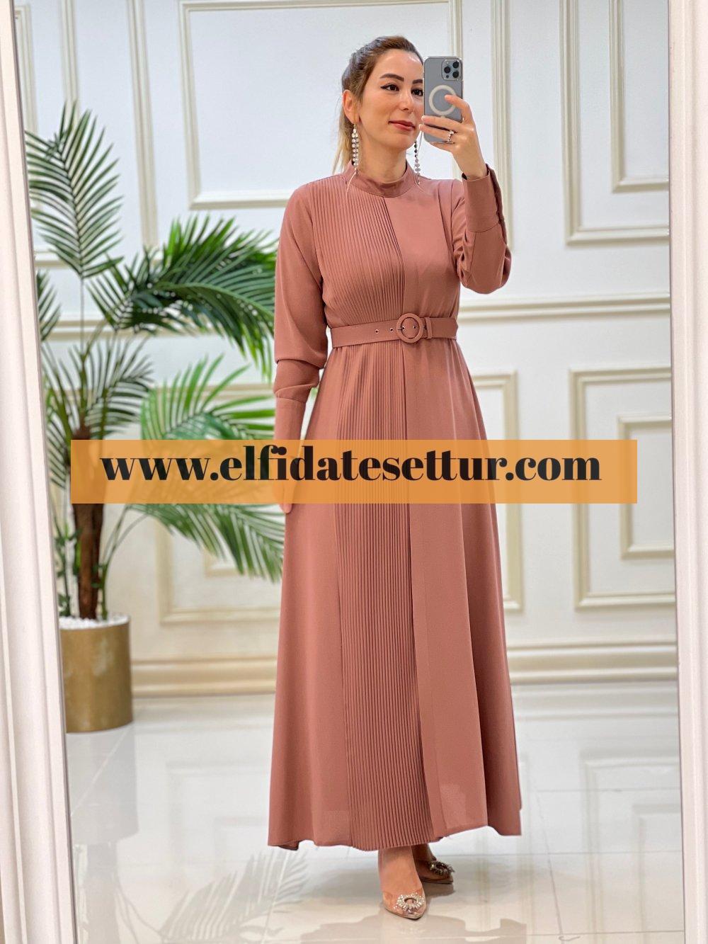 1. Sınıf İthal Krep Kumaştır. 38 Beden Ölçüsü: Elbise boy: 145 cm Göğüs: 100 cm Omuz:36 cm Elbise bir kenarı pilise detaylıdır. Elbise seyyar kemerlidir. Elbise arkadan fermuarlıdır.