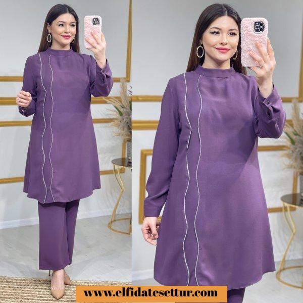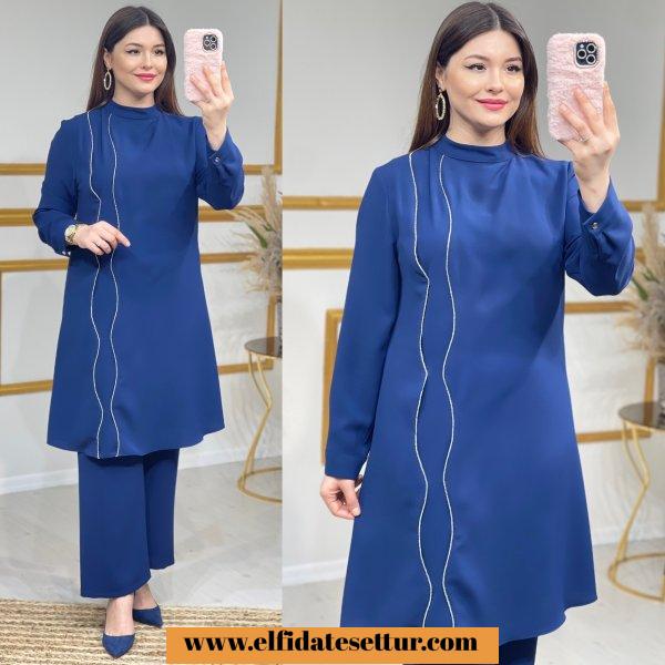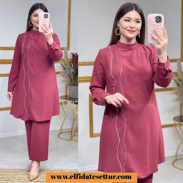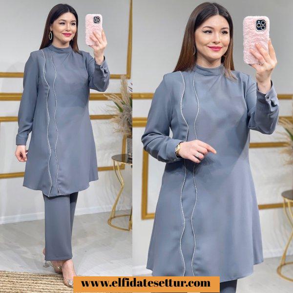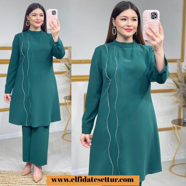 42-44-46-48-50 Bedenlerdedir. Kum krep kumaştır. Zincir detaylıdır. Kolları düğmelidir. Pantolon beli lastiklidir. 42 Beden ürün bilgileri; Tunik boy:100cm Göğüs:106cm Omuz:40cm Pazu:38cm Pantolon boy: 100cm