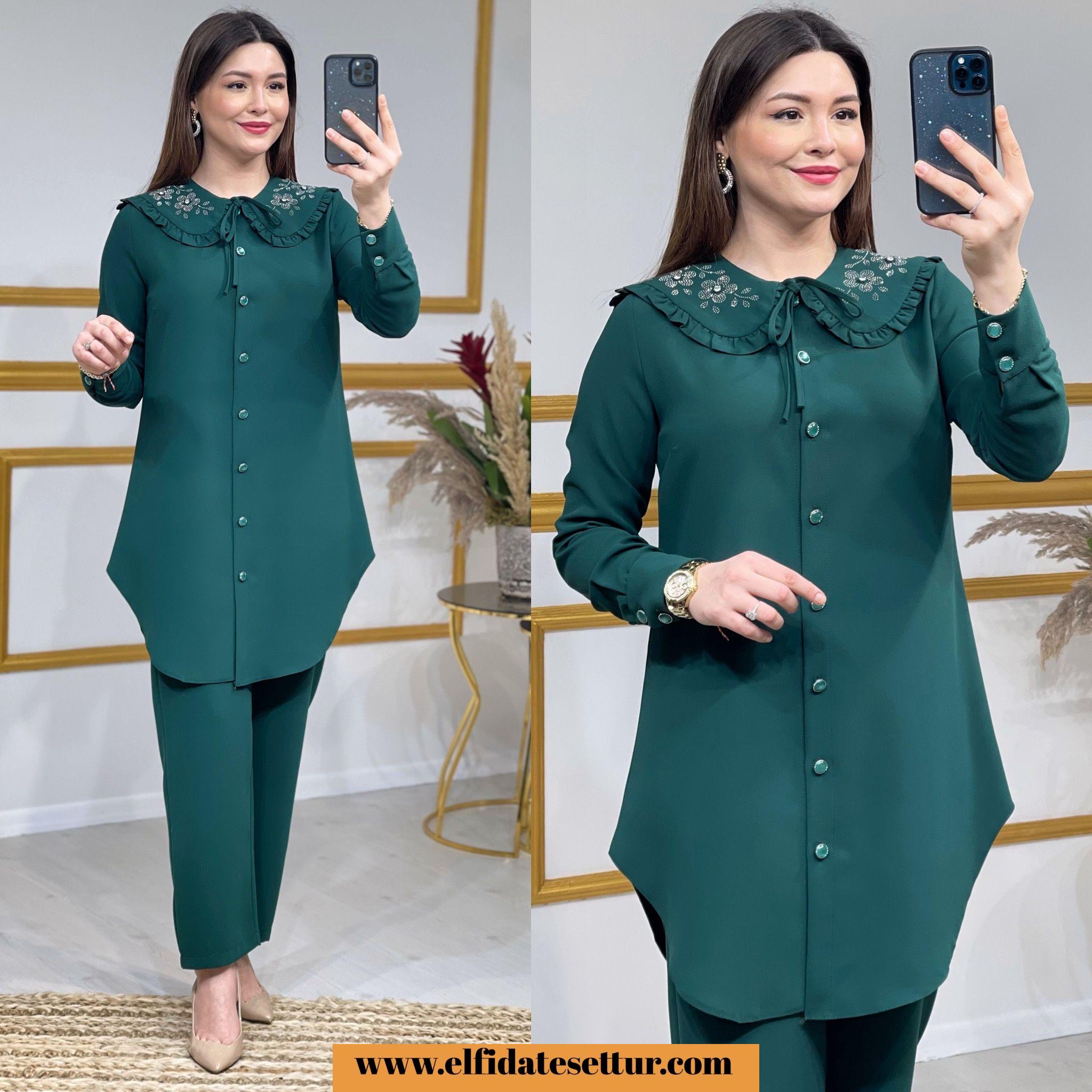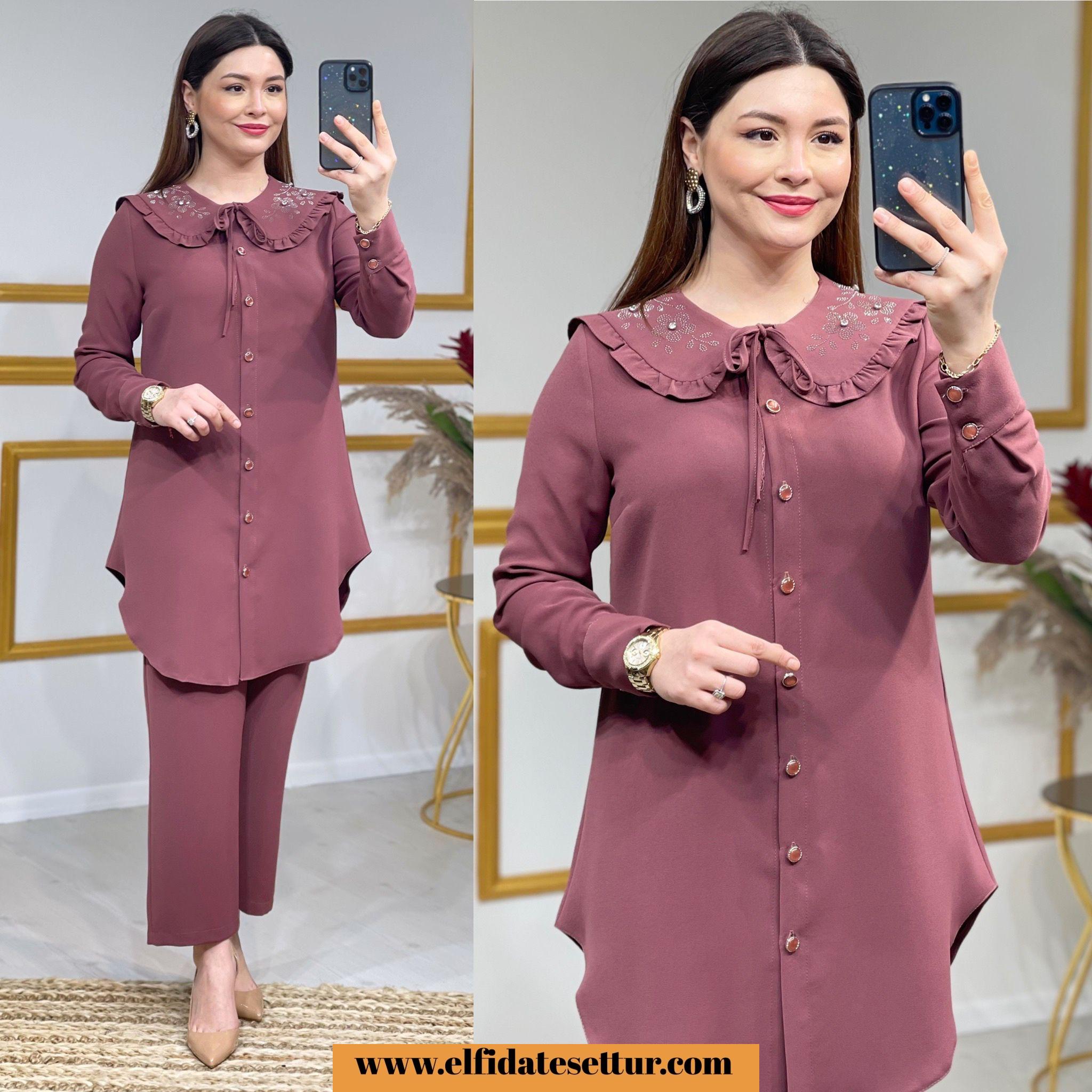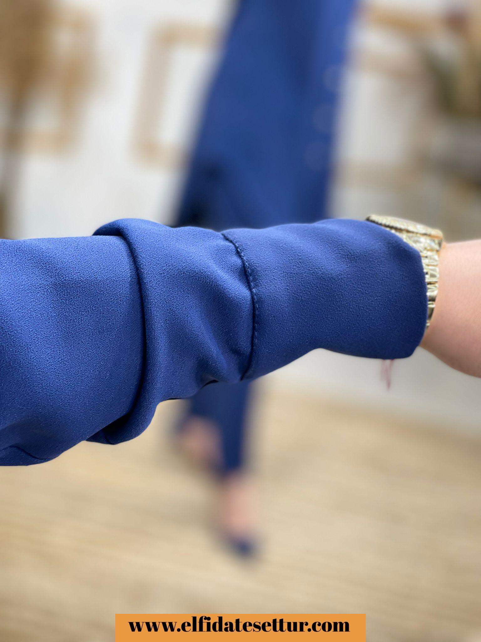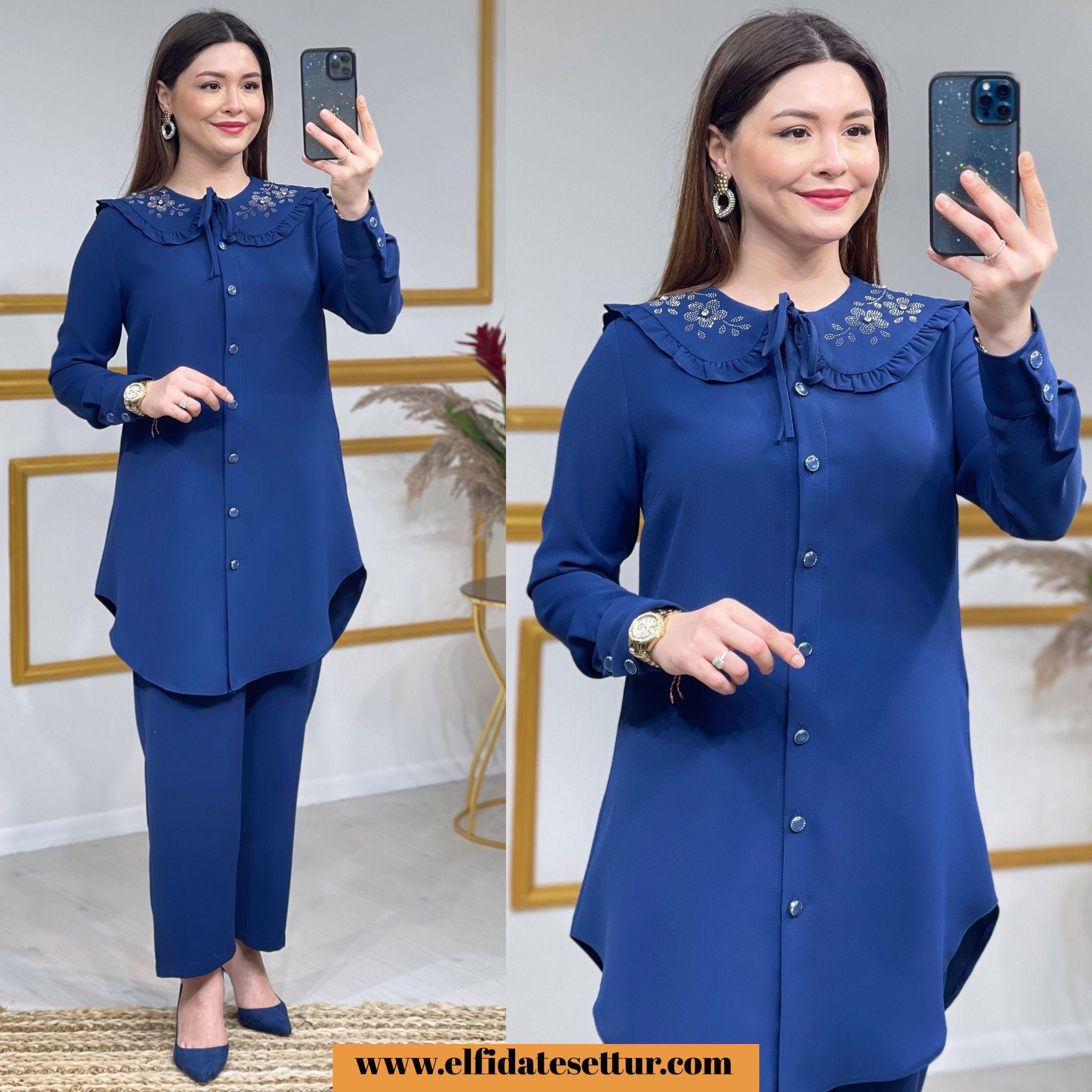 Tunik düğmelidir, yakasında bağlama detaylıdır.