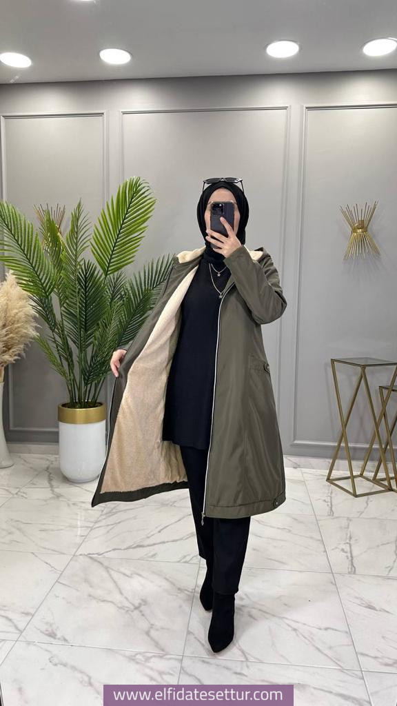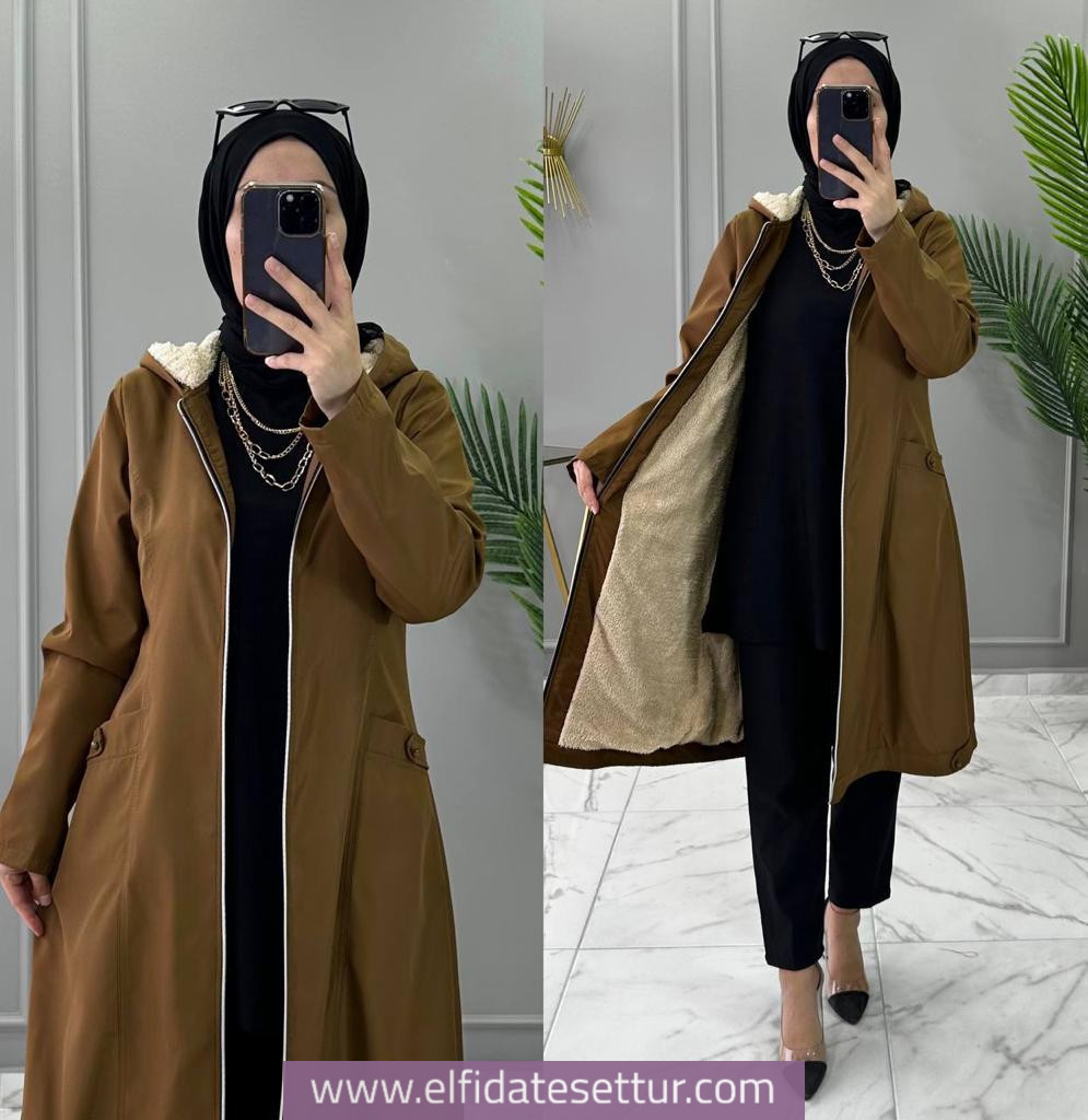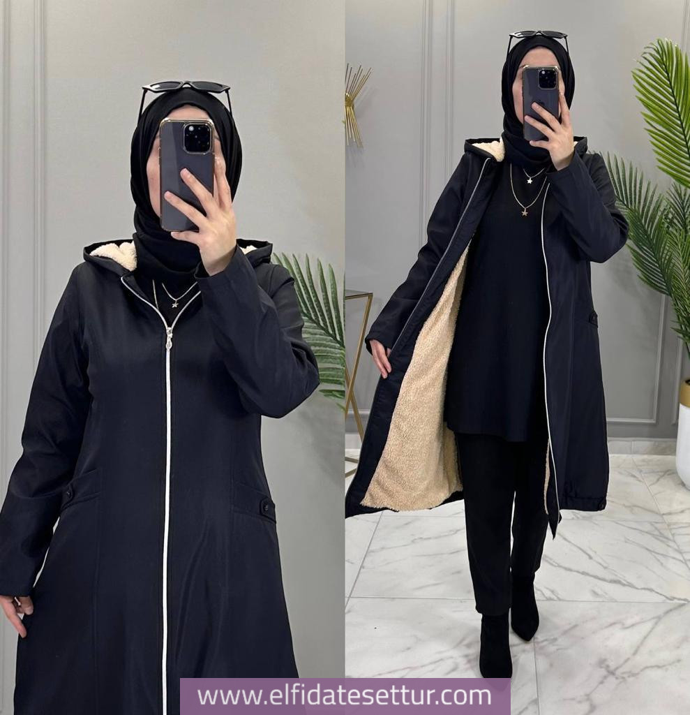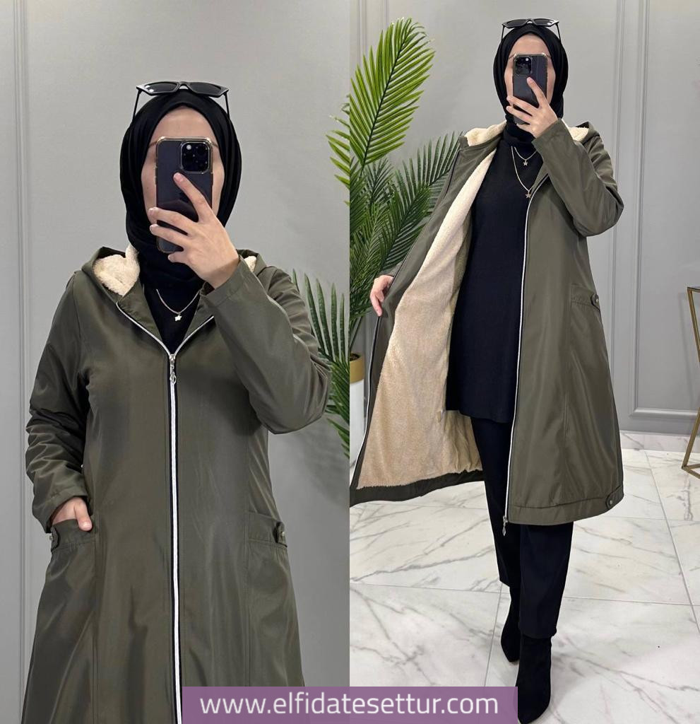Bondit kumaş, kapşonuda kürklüdür, kolları elyaf dolgudur fermuarlı, boy 110 cm