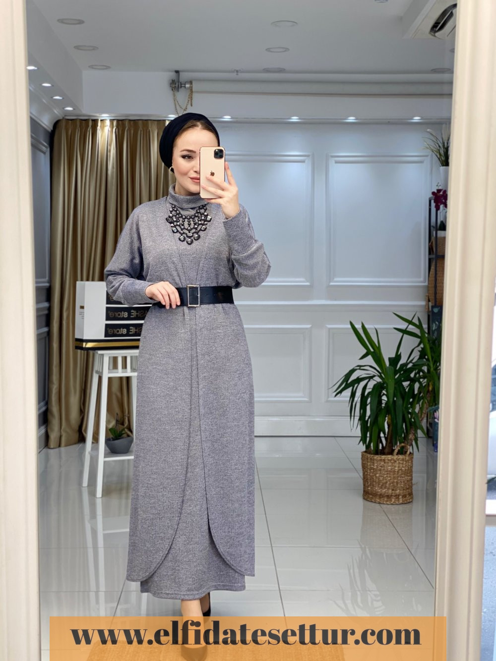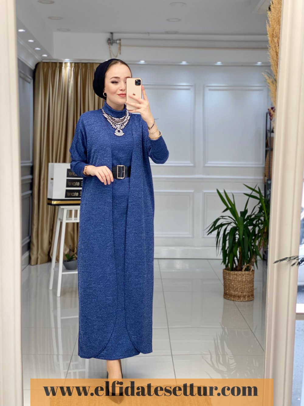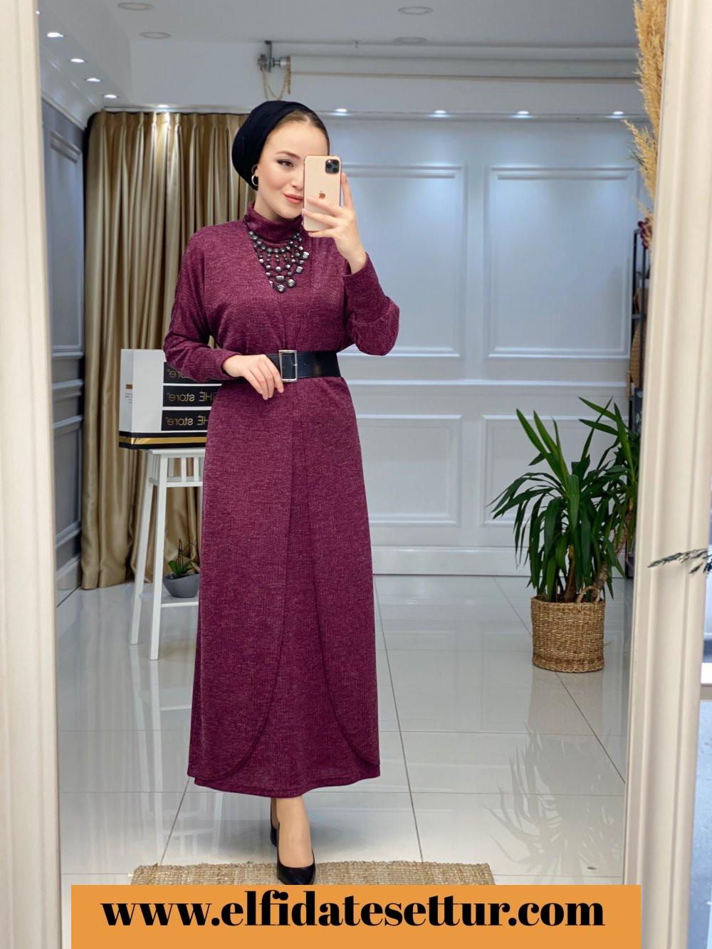 1. Sınıf Örme Kumaştır. 38 Beden Ölçüsü: İç Elbise boy: 135 cm Göğüs: 106 cm Omuz: 40 cm Hırka boy: 135 cm Elbise seyyar kemerlidir. İç elbise sıfır kolludur ve boğazlıdır.