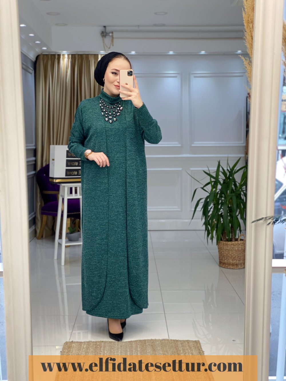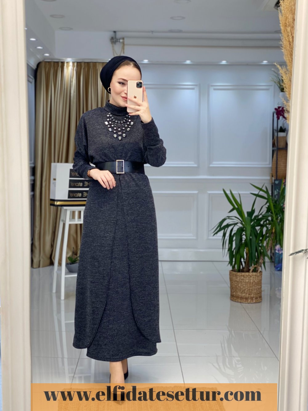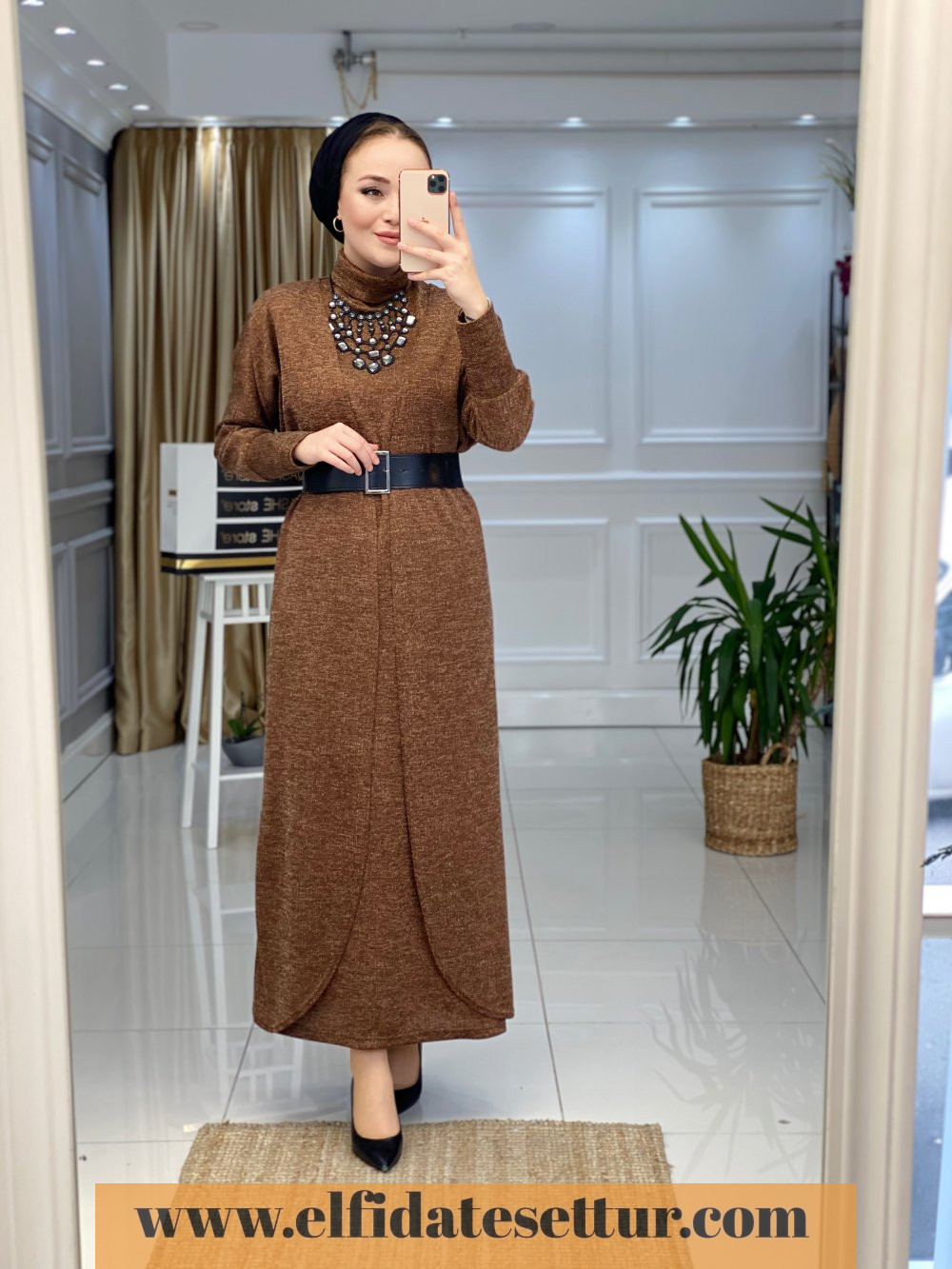 1. Sınıf Örme Kumaştır. 38 Beden Ölçüsü: İç Elbise boy: 135 cm Göğüs: 106 cm Omuz: 40 cm Hırka boy: 135 cm Elbise seyyar kemerlidir. İç elbise sıfır kolludur ve boğazlıdır.