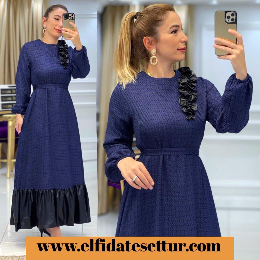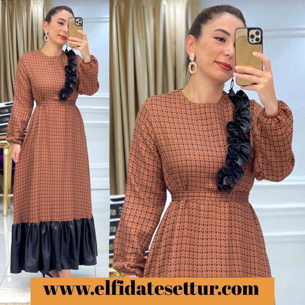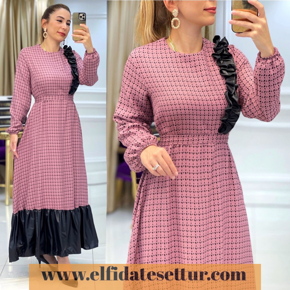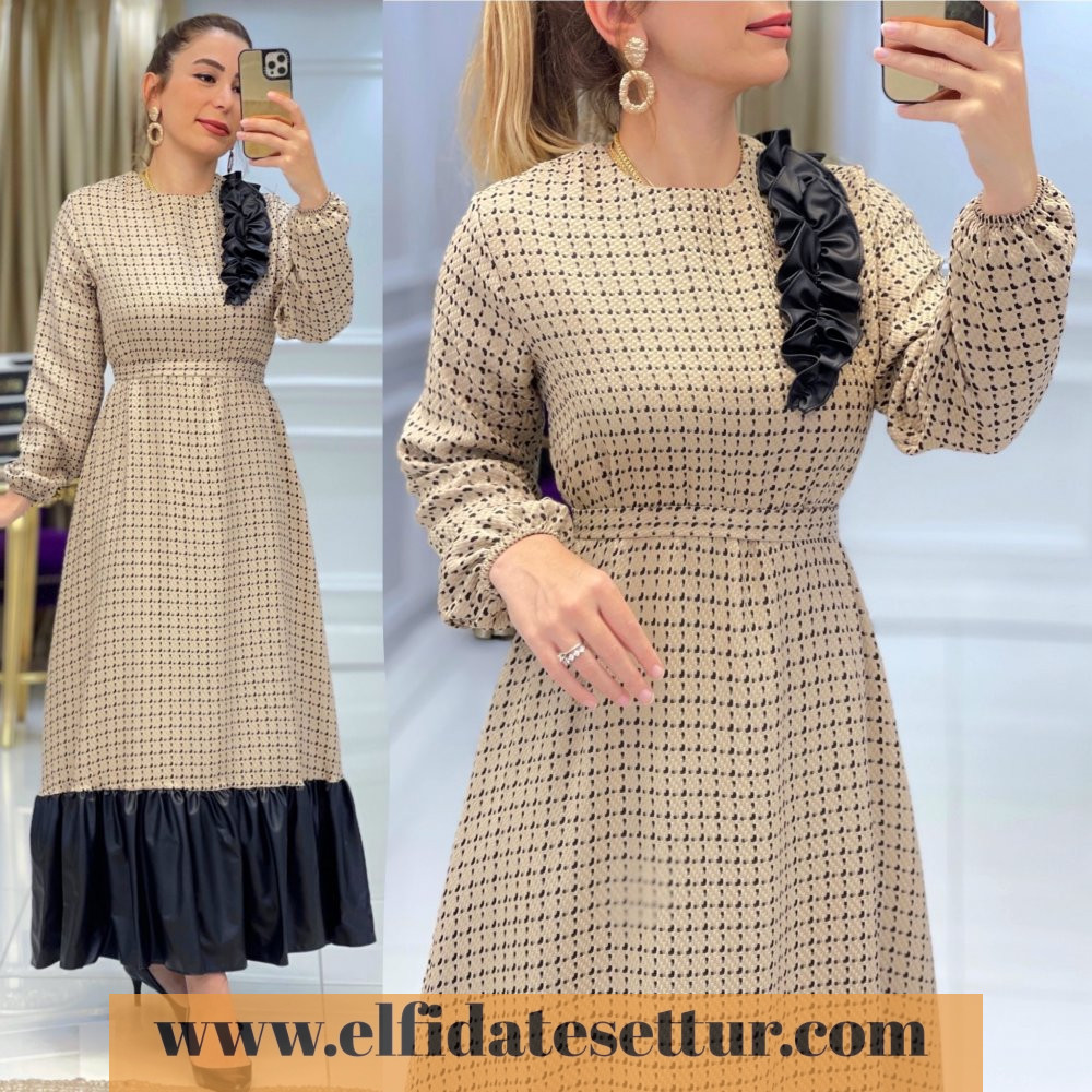 Ürün bilgileri: Birinci Sınıf Chanel örme kumaştır. Elbise seyyar kemerlidir. Elbisenin omuz kısmından bel kısmına kadar derili fırfır detaylıdır. Elbise Etek uçları deri detaylıdır.