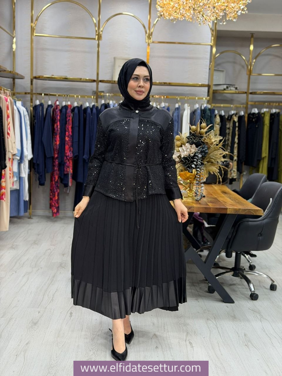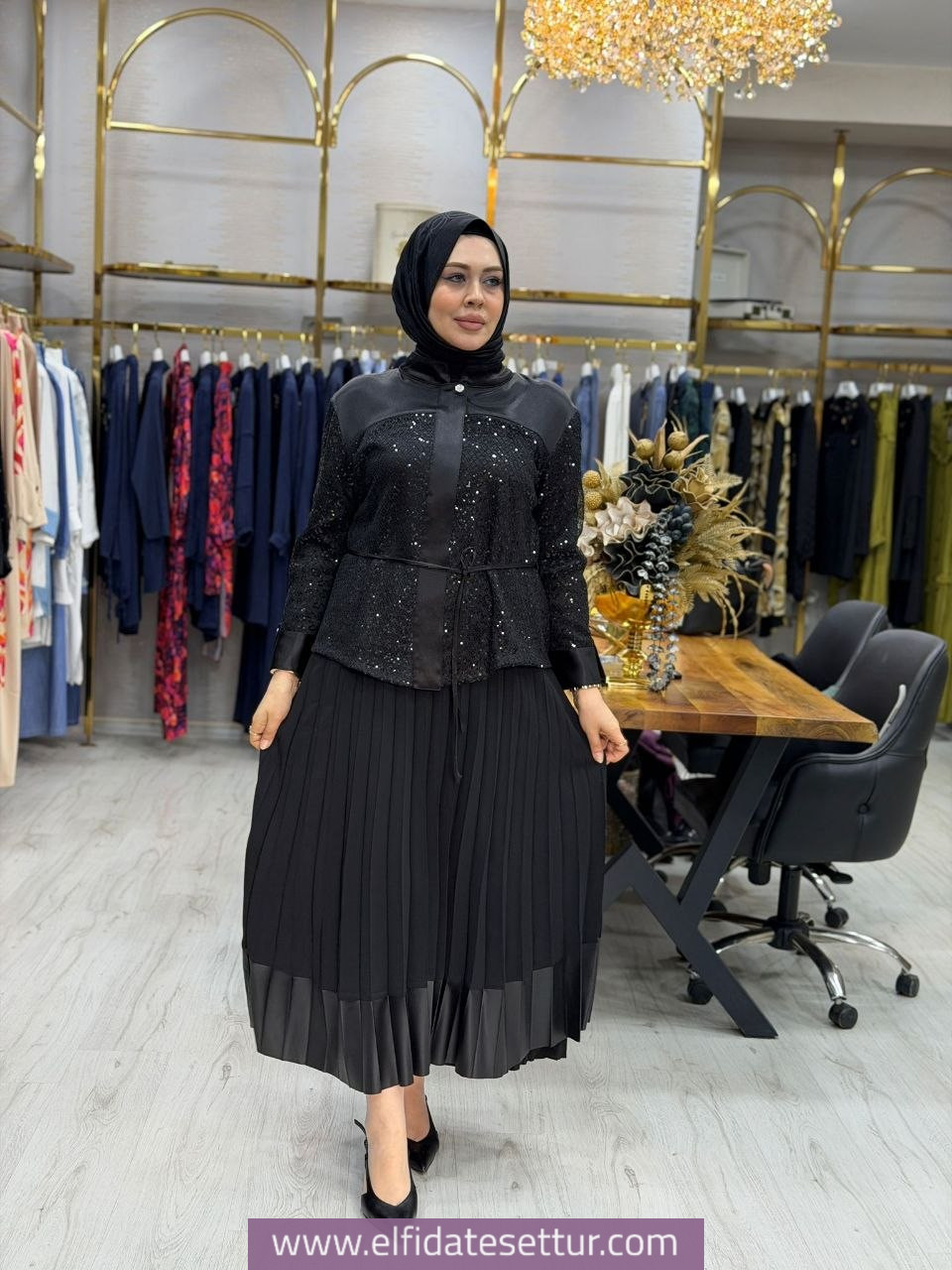 Tunik kumaşı pul payet ve kreptir. Etek kumaşı kreptir. Etek beli