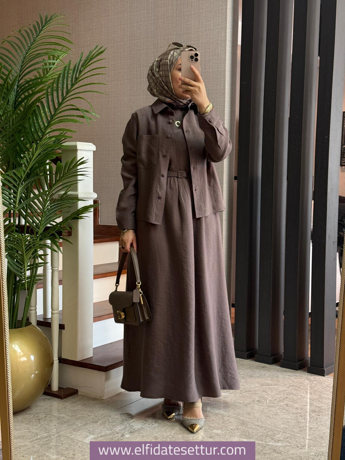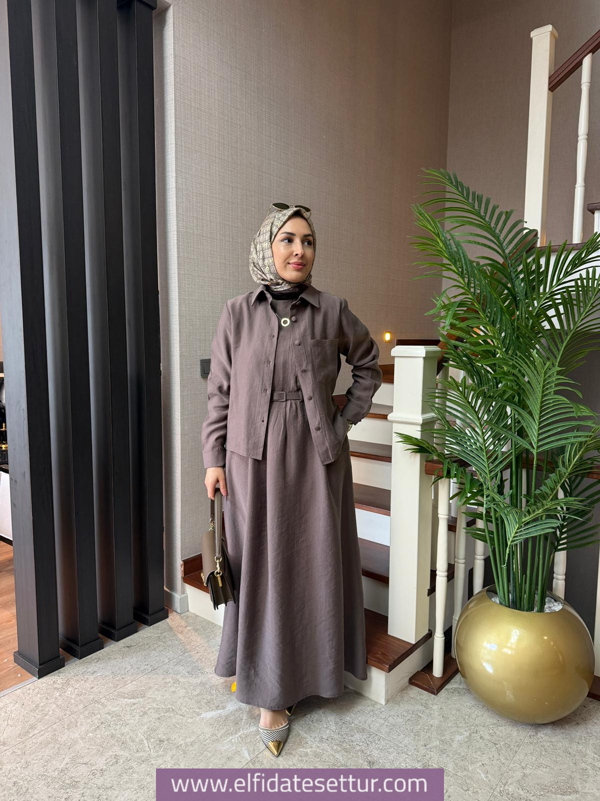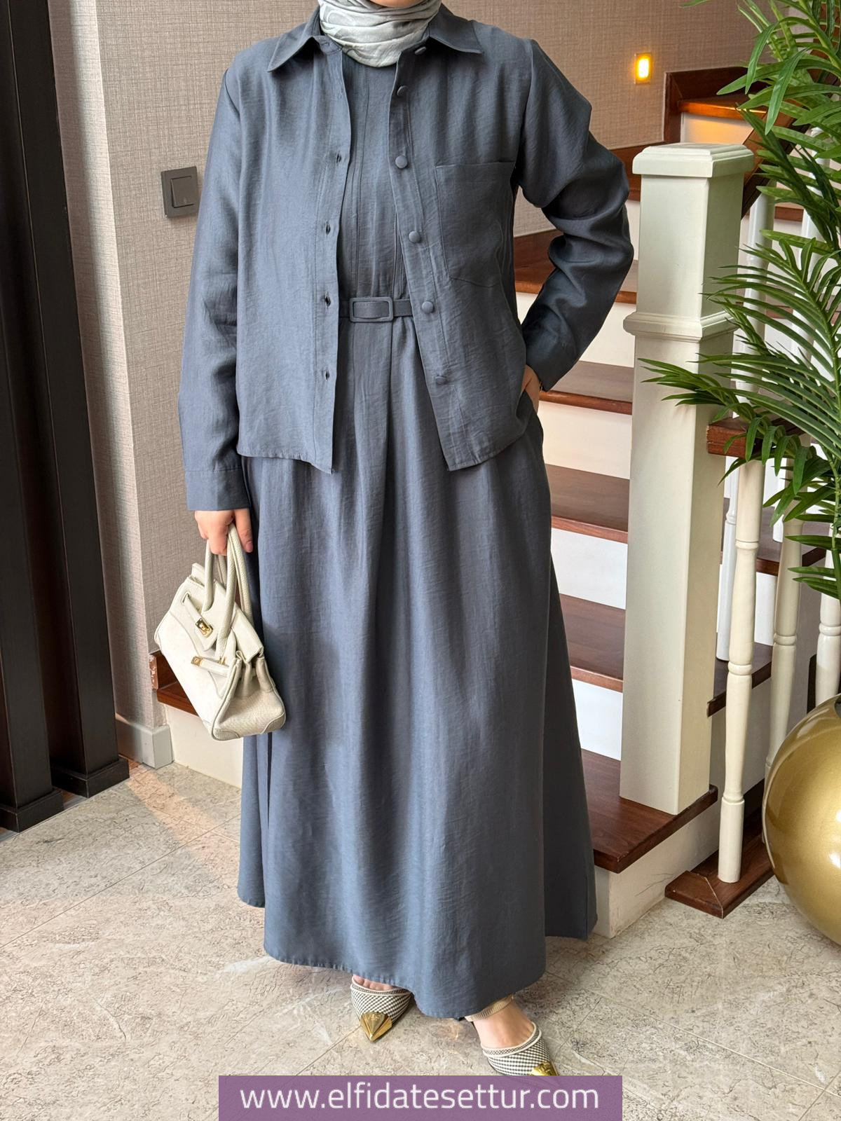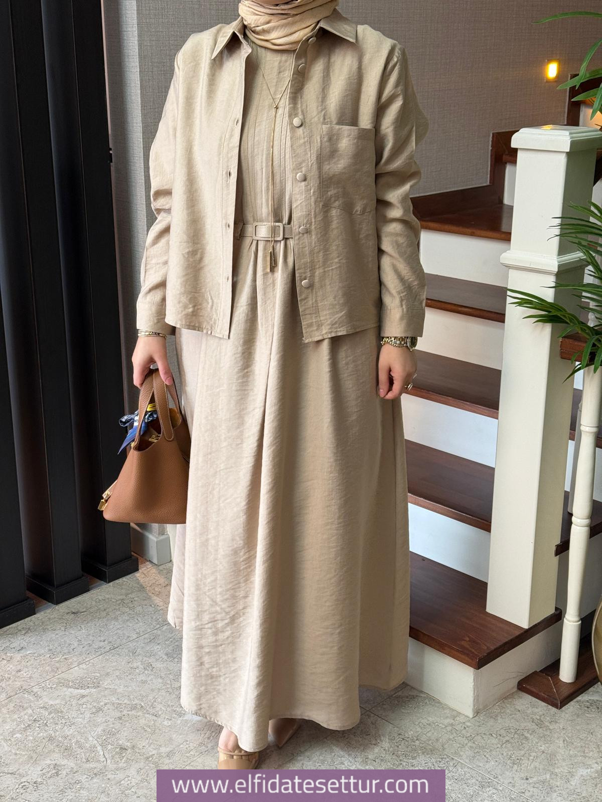 Elbise boy 138 cm’dir, sıfır kollu, arkadan fermuarlı, önünde nervür detayları bulunmaktadır ve kendinden kaplama kemeri mevcuttur.