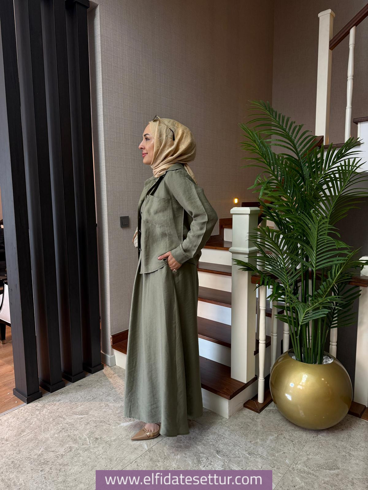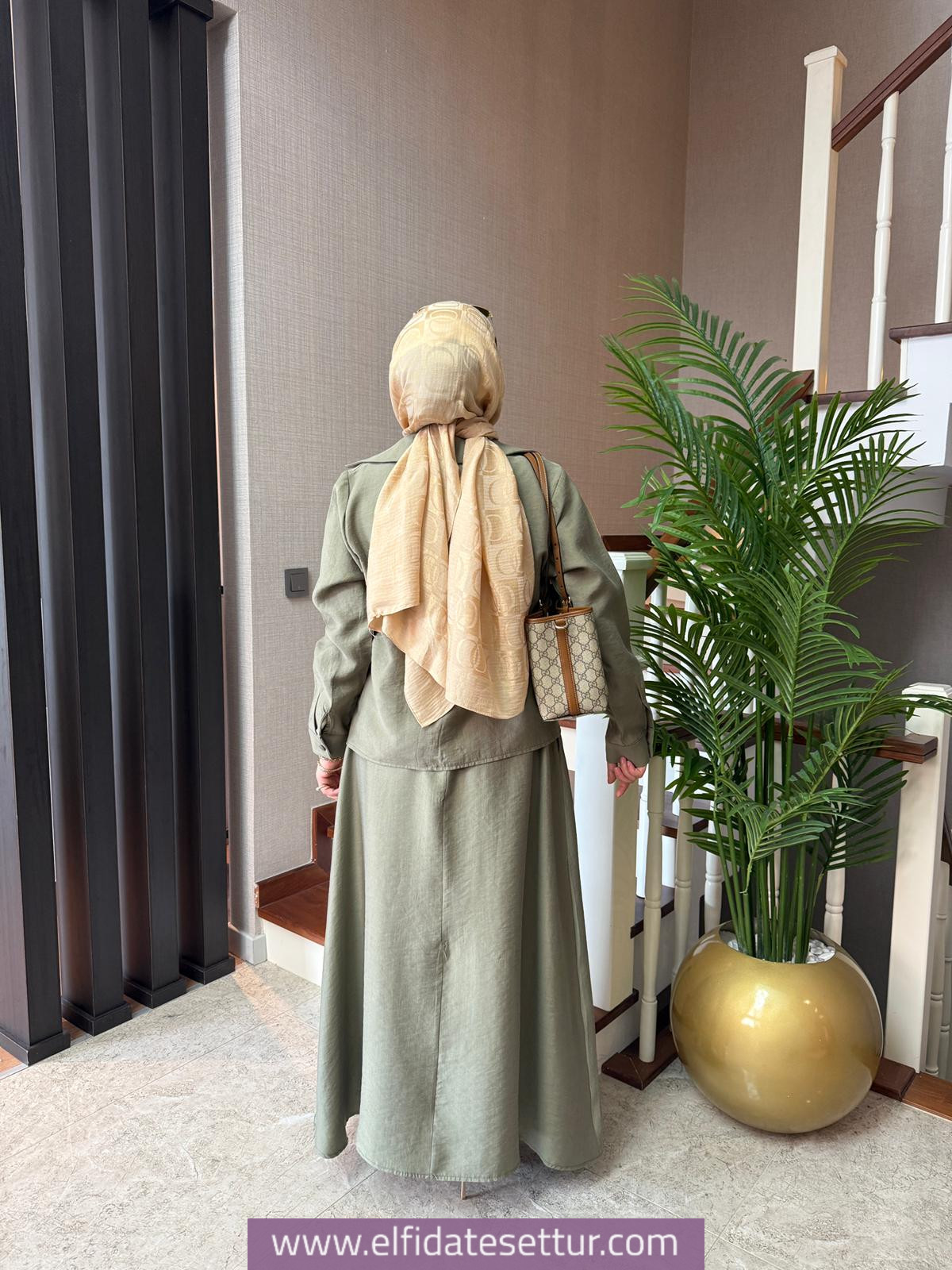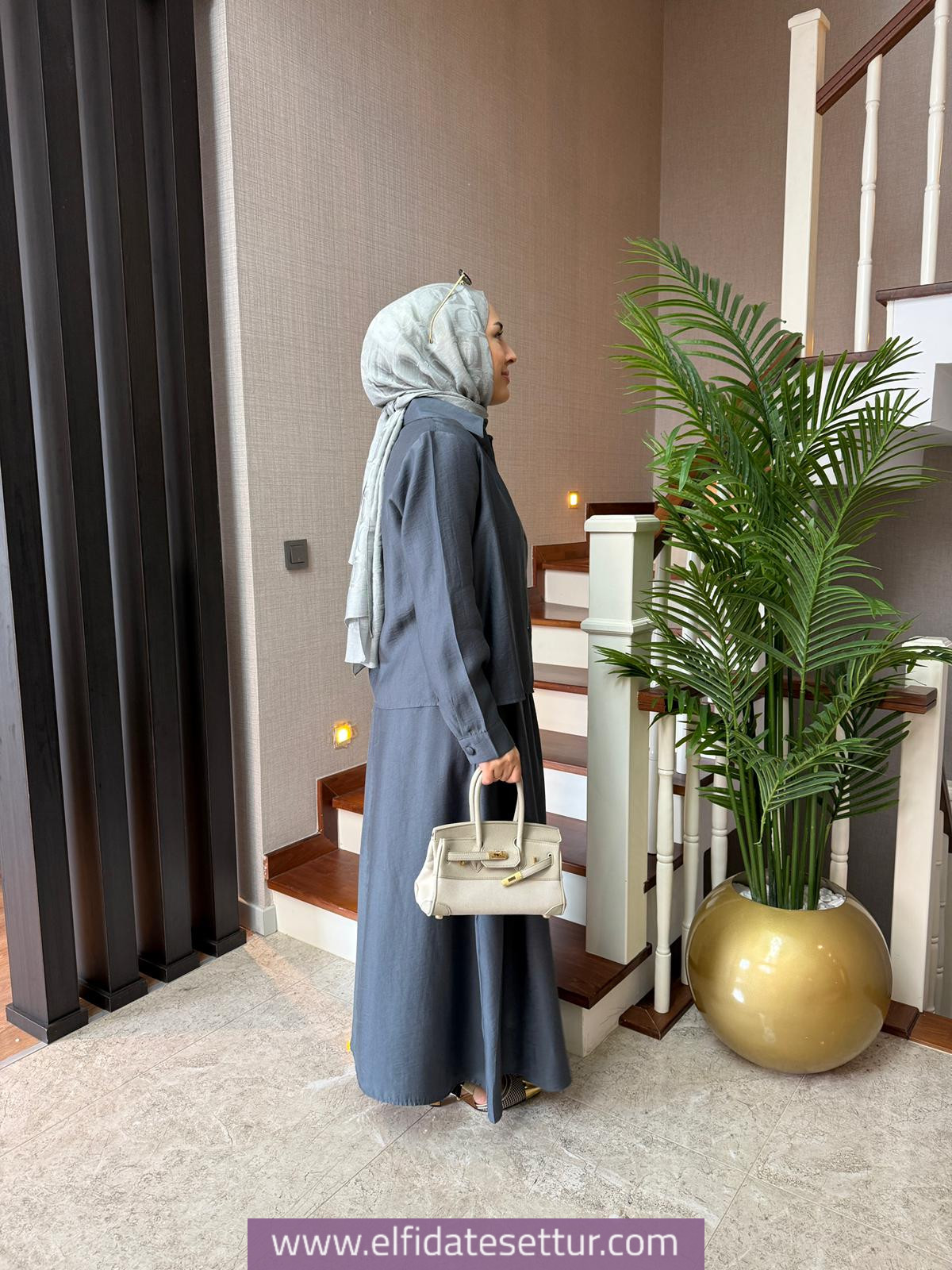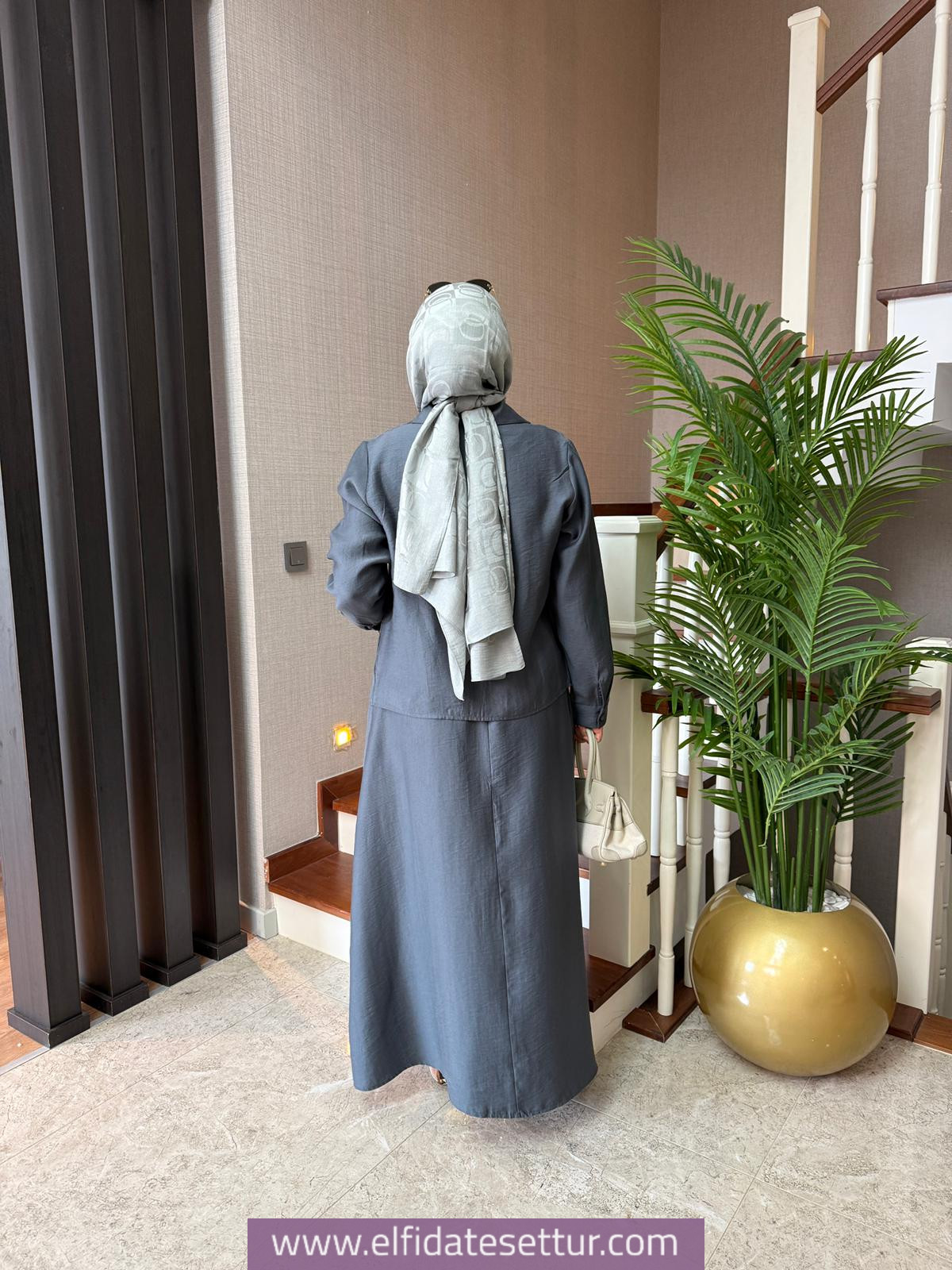 Elbise boy 138 cm’dir, sıfır kollu, arkadan fermuarlı, önünde nervür detayları bulunmaktadır ve kendinden kaplama kemeri mevcuttur.