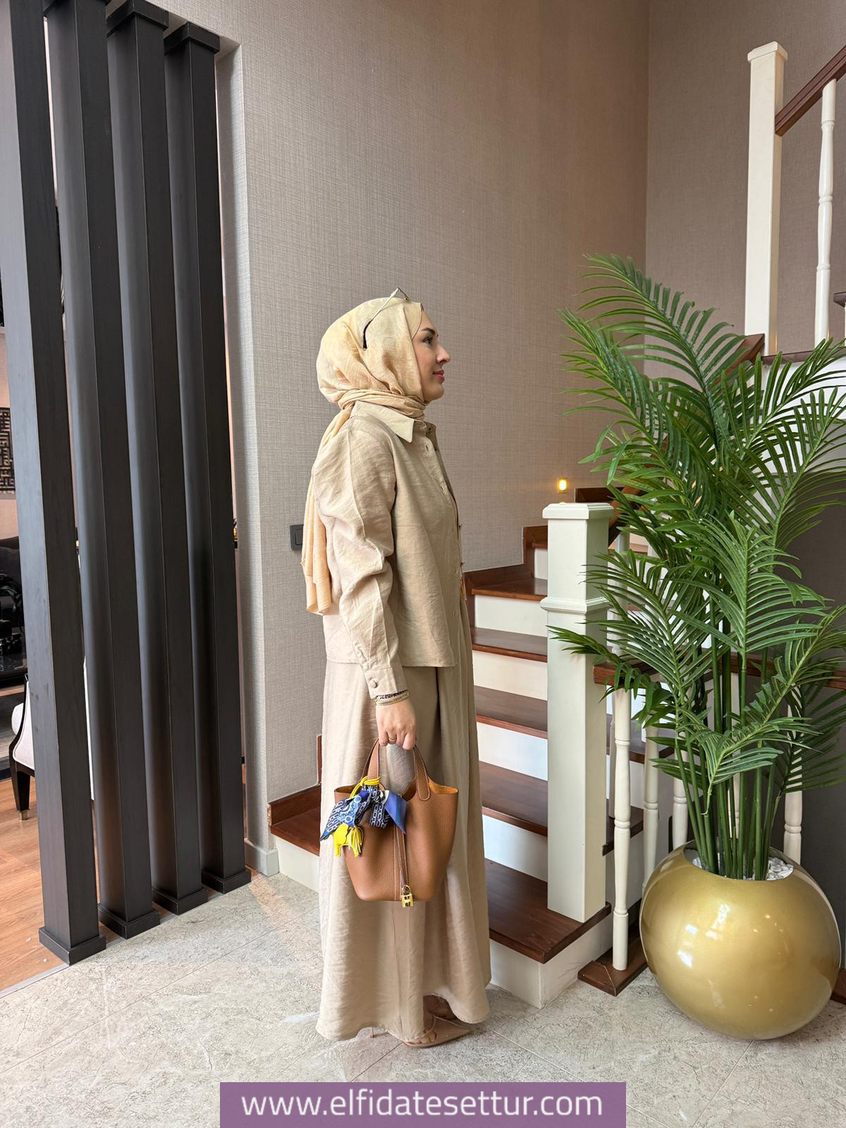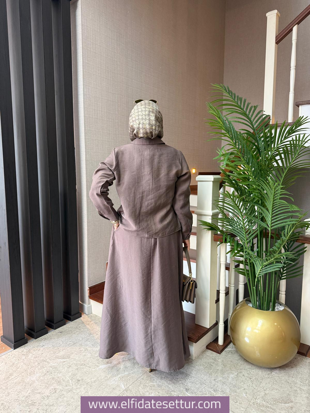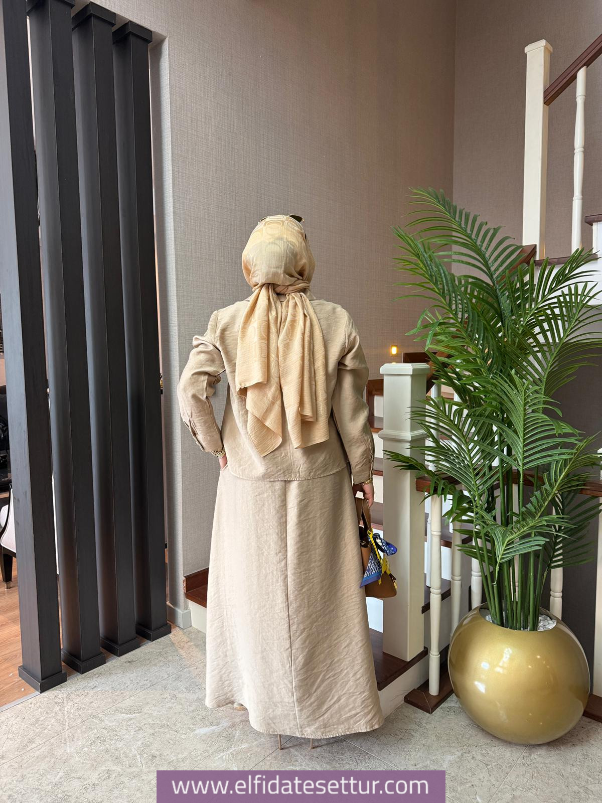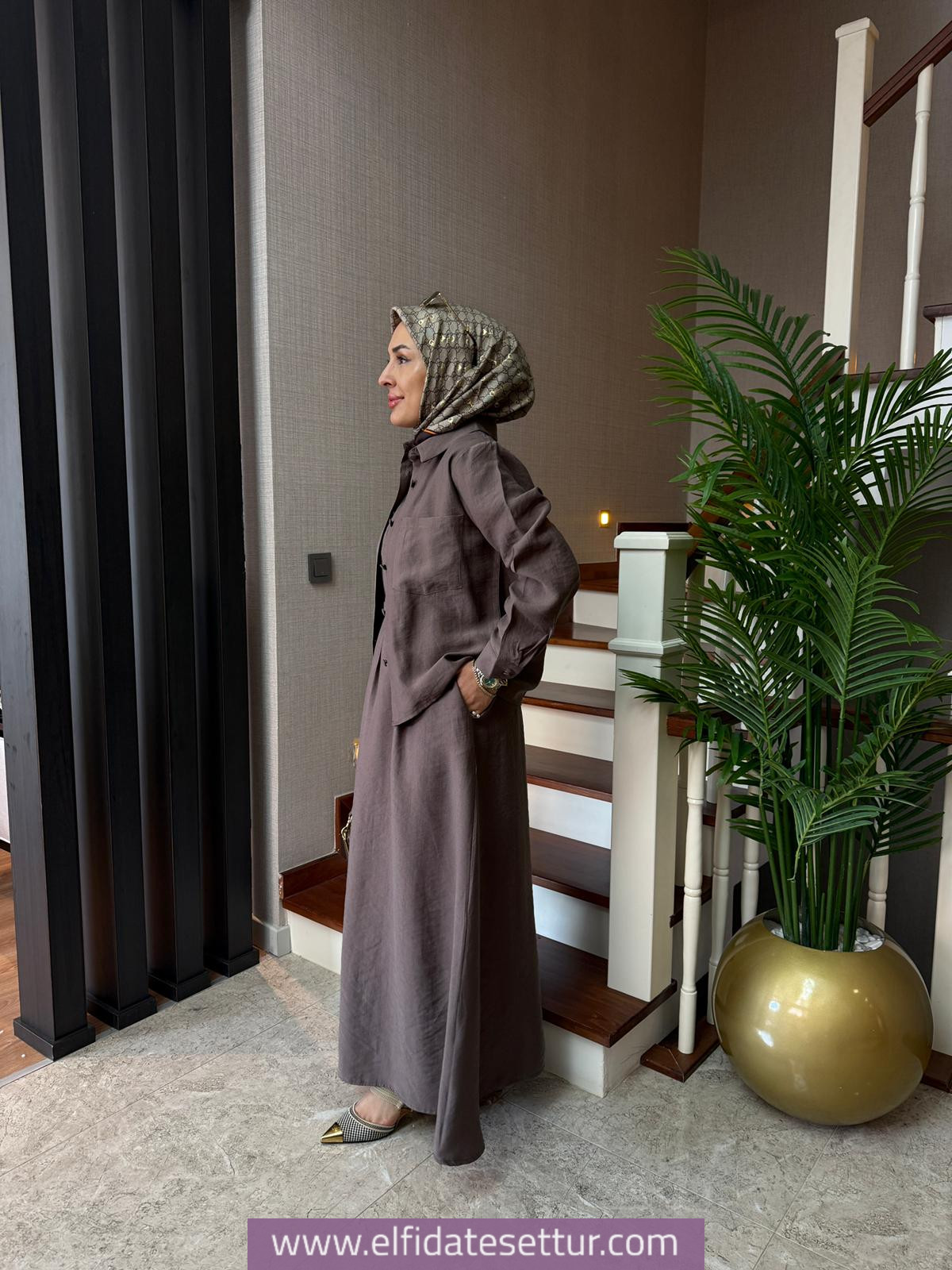 Elbise boy 138 cm’dir, sıfır kollu, arkadan fermuarlı, önünde nervür detayları bulunmaktadır ve kendinden kaplama kemeri mevcuttur.