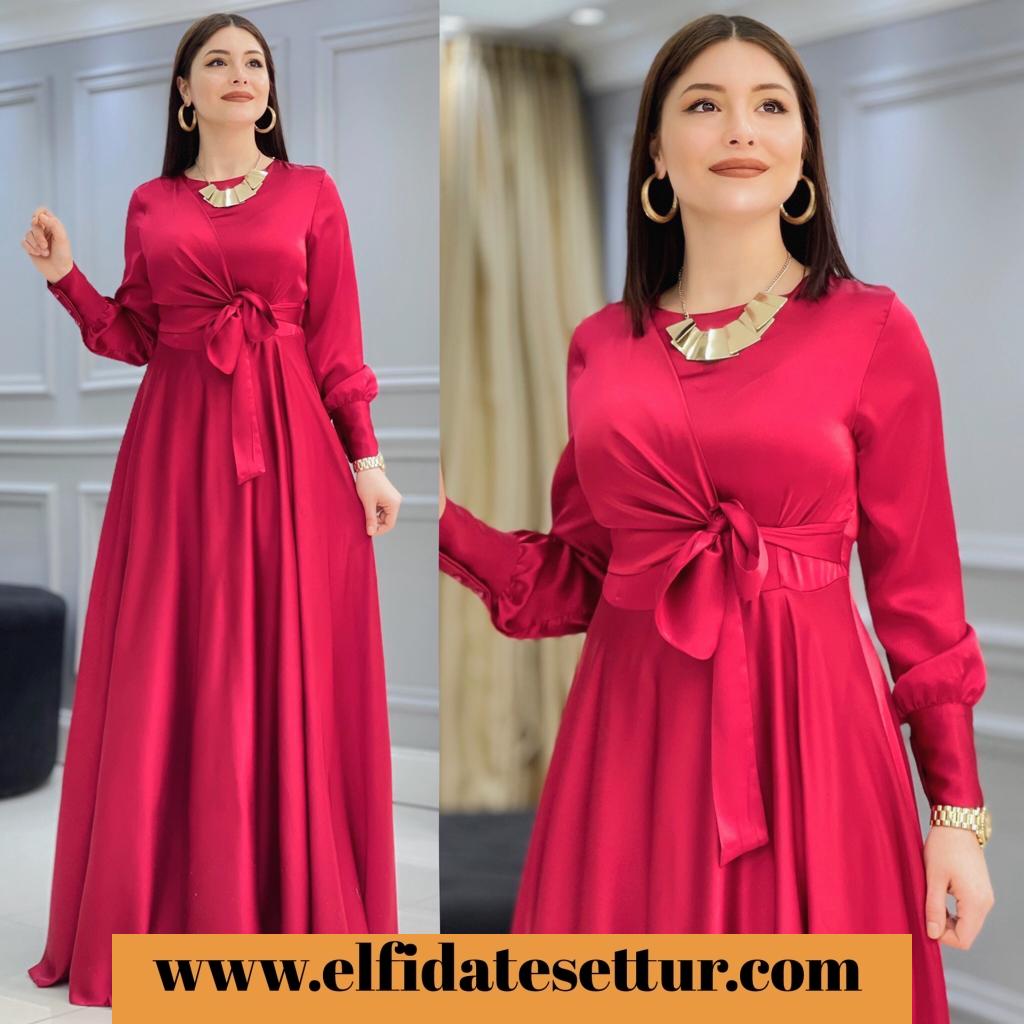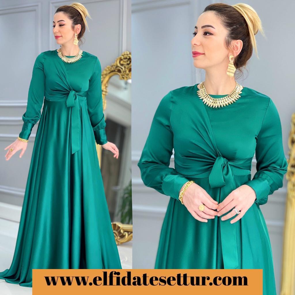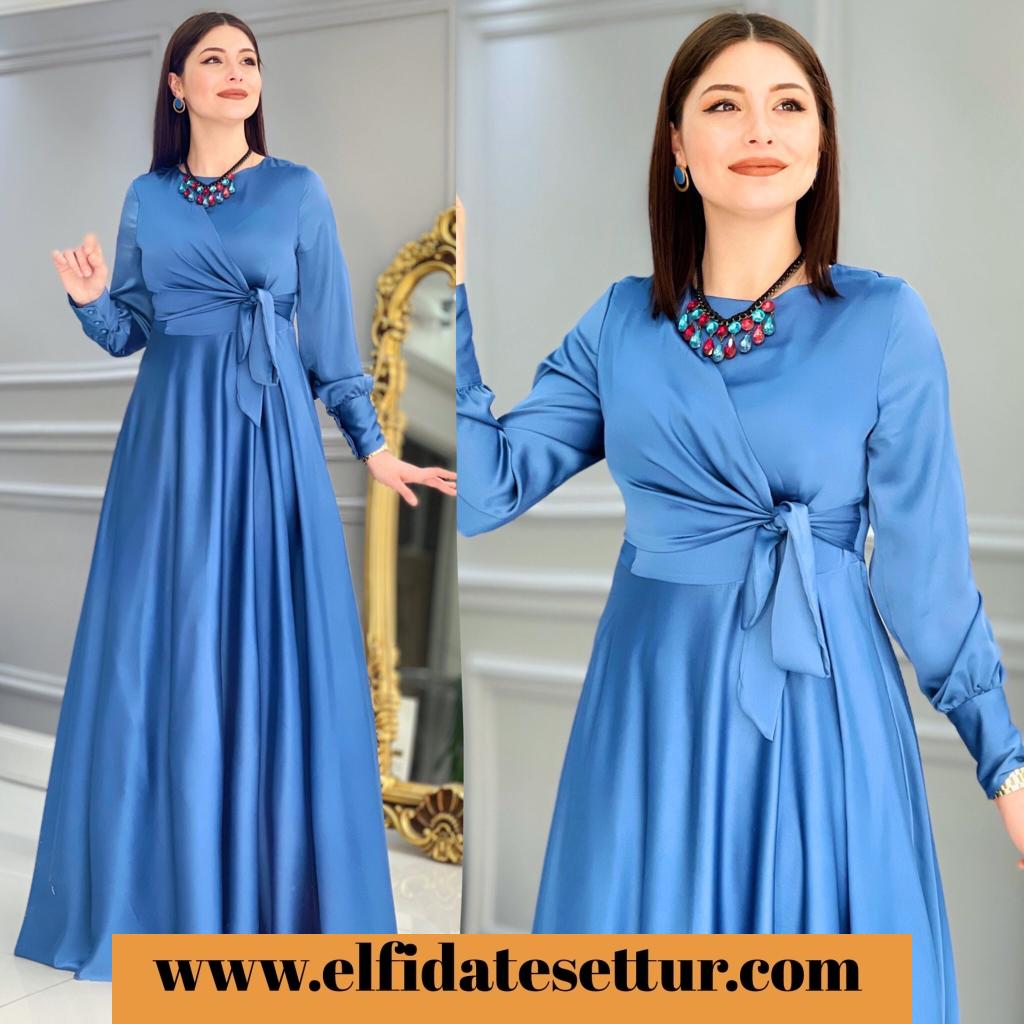 Ürün bilgileri: 1. Sınıf İthal Saten kumaştır.Elbisenin sol alt kısmında bağlama detayı vardır. Elbisenin etek kısmı mevlana kesimdir.Kol uçları manşet düğmelidir. Arkadan fermuarlıdır.